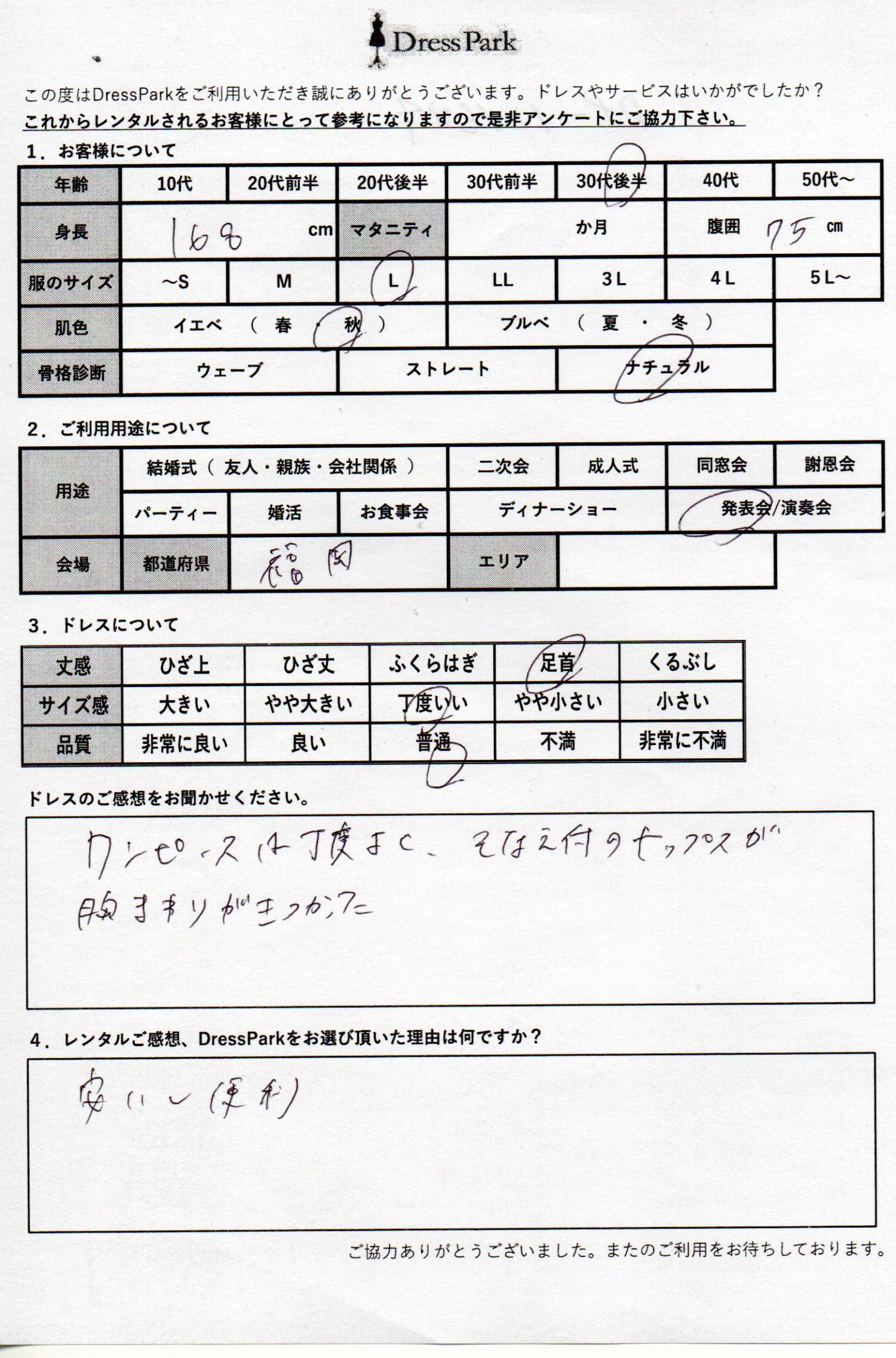 福岡県 M.N様168㎝ Lサイズ #30代#M/L#165~169㎝#その他#福岡県 ◆レンタルしたドレスはこちら ◆レンタルしたサイズは:L ◆レンタルした日付:2025/12/13 ドレスの着用感 ◆点数: (4点) ◆丈感:足首 ◆サイズ感:丁度いい ◆品質:普通 ◆肌色:イエベ ◆骨格診断:ナチュラル ドレスの感想 ワンピースはちょうど良く、備え付けのトップスが胸回りがきつかった。 レンタルのご感想、DressParkをお選び頂いた理由 安いし便利。 CUSTOMER REVIEWS お客様の声 気になるカテゴリー別にご利用の感想をチェック! ◆AGE 年代で見る 10代 20代 30代 40代 50代~ ◆SIZE サイズで見る SS/S M/L 大きいサイズLL~ ◆HIGHT 身長で見る 140~149㎝ 150~154㎝ 155~159㎝ 160~164㎝ 165~169㎝ 170㎝以上 ◆マタニティ ~3か月 4~6か月 7~8か月 9~10か月 ◆肌色 イエベ ブルべ ◆骨格診断 ウェーブ ストレート ナチュラル ◆利用シーン 結婚式(友人) 結婚式(親族) 結婚式(会社関係) 二次会 成人式 謝恩会 パーティー その他 CUSTOMER REVIEWS都道府県別お客様の声 都道府県別にのお客様の声をチェック! 北海道 青森県 岩手県 宮城県 秋田県 山形県 福島県 茨城県 栃木県 群馬県 埼玉県 千葉県 東京都 神奈川県 新潟県 富山県 石川県 福井県 山梨県 長野県 岐阜県 静岡県 愛知県 三重県 滋賀県 京都府 大阪府 兵庫県 奈良県 和歌山県 鳥取県 島根県 岡山県 広島県 山口県 徳島県 香川県 愛媛県 高知県 福岡県 佐賀県 長崎県 熊本県 大分県 宮崎県 鹿児島県 沖縄県 CUSTOMER REVIEWSエリア別お客様の声 都道府県別にのお客様の声をチェック! 札幌 仙台 名古屋 軽井沢 金沢 神戸・芦屋 博多 那覇 梅田・新大阪 難波・心斎橋 鎌倉・湘南 横浜・みなとみらい 舞浜・浦安・幕張 大宮・浦和 青山・表参道 六本木・麻布 渋谷・恵比寿 新宿 池袋 銀座・丸の内 お台場・汐留 鹿児島市 郡山市 福島市 東予 甲府・石和 LINEでお問い合わせ このサイトではJavaScriptを使用しています