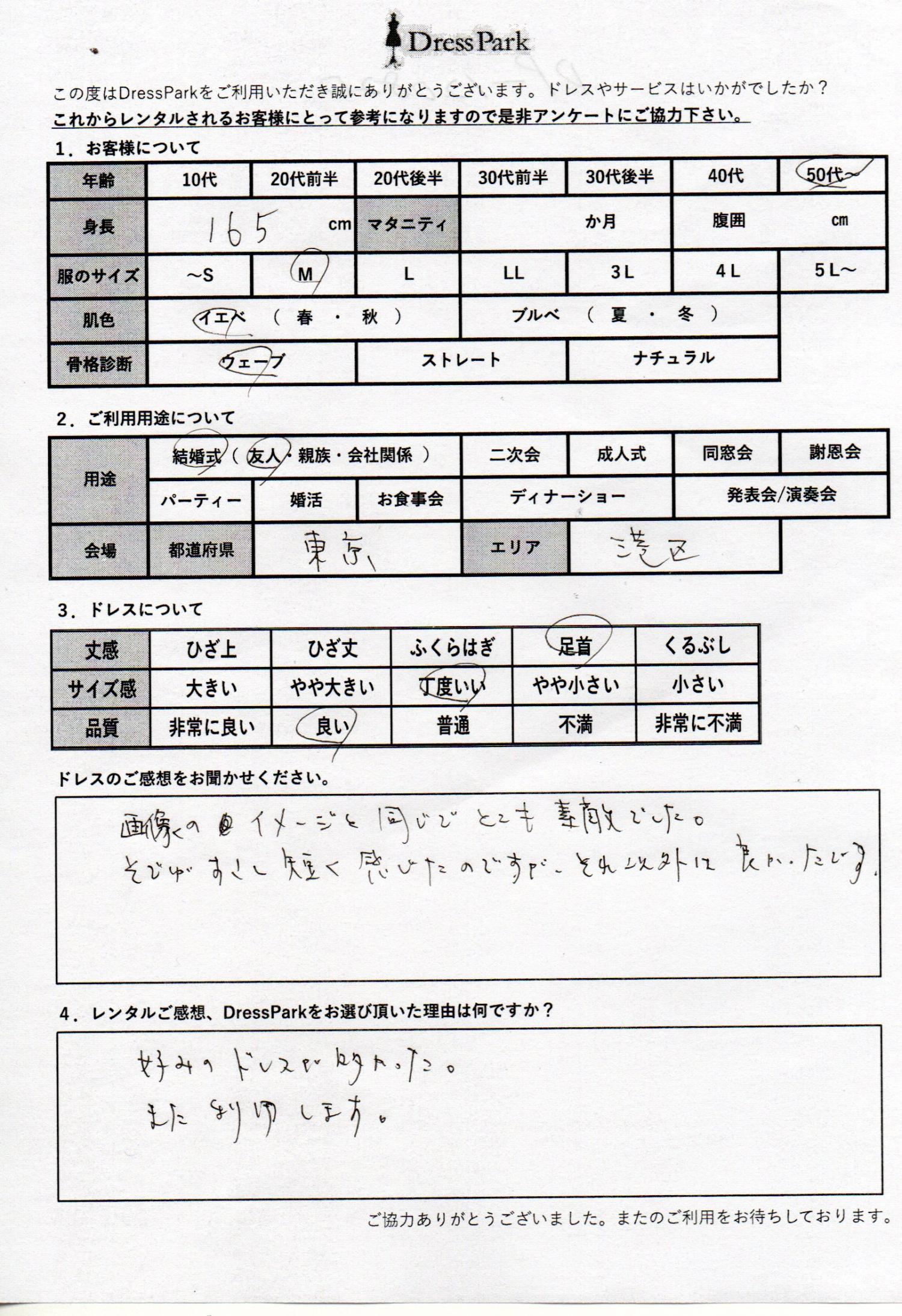 東京都 A.N様165㎝ Mサイズ六本木・麻布 #50代~#M/L#165~169㎝#結婚式(友人)#東京都#六本木・麻布 ◆レンタルしたドレスはこちら ◆レンタルしたサイズは:L ◆レンタルした日付:2025/12/13 ドレスの着用感 ◆点数: (4点) ◆丈感:足首 ◆サイズ感:丁度いい ◆品質:良い ◆肌色:イエベ ◆骨格診断:ウェーブ ドレスの感想 画像のイメージと同じでとても素敵でした。袖が少し短く感じたのですが、それ以外は良かったです。 レンタルのご感想、DressParkをお選び頂いた理由 好みのドレスが多かった。また利用します。 CUSTOMER REVIEWS お客様の声 気になるカテゴリー別にご利用の感想をチェック! ◆AGE 年代で見る 10代 20代 30代 40代 50代~ ◆SIZE サイズで見る SS/S M/L 大きいサイズLL~ ◆HIGHT 身長で見る 140~149㎝ 150~154㎝ 155~159㎝ 160~164㎝ 165~169㎝ 170㎝以上 ◆マタニティ ~3か月 4~6か月 7~8か月 9~10か月 ◆肌色 イエベ ブルべ ◆骨格診断 ウェーブ ストレート ナチュラル ◆利用シーン 結婚式(友人) 結婚式(親族) 結婚式(会社関係) 二次会 成人式 謝恩会 パーティー その他 CUSTOMER REVIEWS都道府県別お客様の声 都道府県別にのお客様の声をチェック! 北海道 青森県 岩手県 宮城県 秋田県 山形県 福島県 茨城県 栃木県 群馬県 埼玉県 千葉県 東京都 神奈川県 新潟県 富山県 石川県 福井県 山梨県 長野県 岐阜県 静岡県 愛知県 三重県 滋賀県 京都府 大阪府 兵庫県 奈良県 和歌山県 鳥取県 島根県 岡山県 広島県 山口県 徳島県 香川県 愛媛県 高知県 福岡県 佐賀県 長崎県 熊本県 大分県 宮崎県 鹿児島県 沖縄県 CUSTOMER REVIEWSエリア別お客様の声 都道府県別にのお客様の声をチェック! 札幌 仙台 名古屋 軽井沢 金沢 神戸・芦屋 博多 那覇 梅田・新大阪 難波・心斎橋 鎌倉・湘南 横浜・みなとみらい 舞浜・浦安・幕張 大宮・浦和 青山・表参道 六本木・麻布 渋谷・恵比寿 新宿 池袋 銀座・丸の内 お台場・汐留 鹿児島市 郡山市 福島市 東予 甲府・石和 LINEでお問い合わせ このサイトではJavaScriptを使用しています