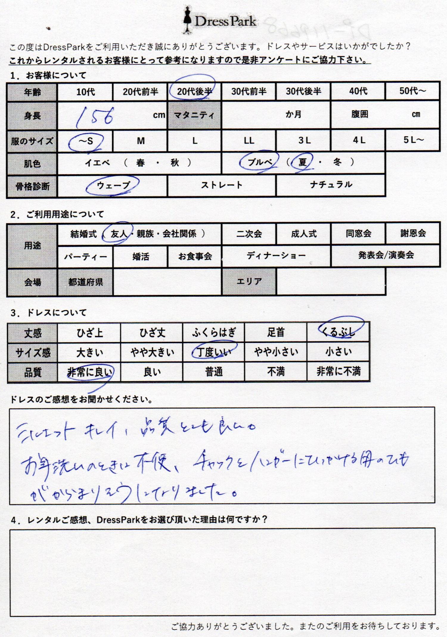 埼玉県 R.N様156㎝ ~Sサイズ #20代#SS/S#155~159㎝#結婚式(友人)#埼玉県 ◆レンタルしたドレスはこちら ◆レンタルしたサイズは:S ◆レンタルした日付:2025/12/13 ドレスの着用感 ◆点数: (5点) ◆丈感:くるぶし ◆サイズ感:丁度いい ◆品質:非常に良い ◆肌色:ブルべ ◆骨格診断:ウェーブ ドレスの感想 シルエットきれい、品質もとても良い。お手洗いの時は不便、チャックとハンガーに引っ掛ける用の紐が絡まりそうになりました。 CUSTOMER REVIEWS お客様の声 気になるカテゴリー別にご利用の感想をチェック! ◆AGE 年代で見る 10代 20代 30代 40代 50代~ ◆SIZE サイズで見る SS/S M/L 大きいサイズLL~ ◆HIGHT 身長で見る 140~149㎝ 150~154㎝ 155~159㎝ 160~164㎝ 165~169㎝ 170㎝以上 ◆マタニティ ~3か月 4~6か月 7~8か月 9~10か月 ◆肌色 イエベ ブルべ ◆骨格診断 ウェーブ ストレート ナチュラル ◆利用シーン 結婚式(友人) 結婚式(親族) 結婚式(会社関係) 二次会 成人式 謝恩会 パーティー その他 CUSTOMER REVIEWS都道府県別お客様の声 都道府県別にのお客様の声をチェック! 北海道 青森県 岩手県 宮城県 秋田県 山形県 福島県 茨城県 栃木県 群馬県 埼玉県 千葉県 東京都 神奈川県 新潟県 富山県 石川県 福井県 山梨県 長野県 岐阜県 静岡県 愛知県 三重県 滋賀県 京都府 大阪府 兵庫県 奈良県 和歌山県 鳥取県 島根県 岡山県 広島県 山口県 徳島県 香川県 愛媛県 高知県 福岡県 佐賀県 長崎県 熊本県 大分県 宮崎県 鹿児島県 沖縄県 CUSTOMER REVIEWSエリア別お客様の声 都道府県別にのお客様の声をチェック! 札幌 仙台 名古屋 軽井沢 金沢 神戸・芦屋 博多 那覇 梅田・新大阪 難波・心斎橋 鎌倉・湘南 横浜・みなとみらい 舞浜・浦安・幕張 大宮・浦和 青山・表参道 六本木・麻布 渋谷・恵比寿 新宿 池袋 銀座・丸の内 お台場・汐留 鹿児島市 郡山市 福島市 東予 甲府・石和 LINEでお問い合わせ このサイトではJavaScriptを使用しています