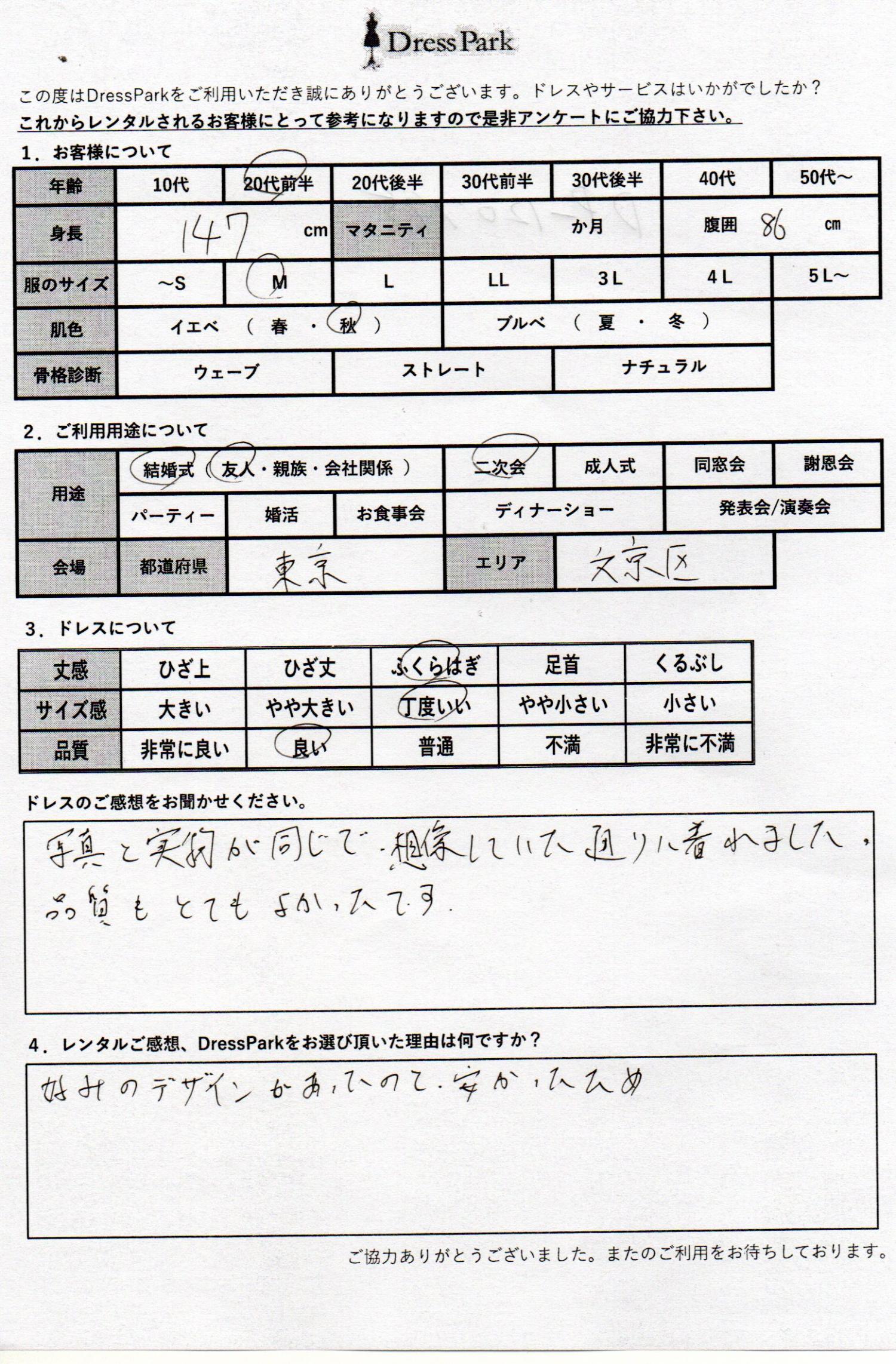東京都 S.T様147㎝ Mサイズ #20代#M/L#140~149㎝#結婚式(友人)#東京都 ◆レンタルしたドレスはこちら ◆レンタルしたサイズは:M ◆レンタルした日付:2025/12/13 ドレスの着用感 ◆点数: (4点) ◆丈感:ふくらはぎ ◆サイズ感:丁度いい ◆品質:良い ◆肌色:イエベ ドレスの感想 写真と実物が同じで、想像していた通りに着られました。品質もとても良かったです。 レンタルのご感想、DressParkをお選び頂いた理由 好みのデザインがあったので。安かったため。 CUSTOMER REVIEWS お客様の声 気になるカテゴリー別にご利用の感想をチェック! ◆AGE 年代で見る 10代 20代 30代 40代 50代~ ◆SIZE サイズで見る SS/S M/L 大きいサイズLL~ ◆HIGHT 身長で見る 140~149㎝ 150~154㎝ 155~159㎝ 160~164㎝ 165~169㎝ 170㎝以上 ◆マタニティ ~3か月 4~6か月 7~8か月 9~10か月 ◆肌色 イエベ ブルべ ◆骨格診断 ウェーブ ストレート ナチュラル ◆利用シーン 結婚式(友人) 結婚式(親族) 結婚式(会社関係) 二次会 成人式 謝恩会 パーティー その他 CUSTOMER REVIEWS都道府県別お客様の声 都道府県別にのお客様の声をチェック! 北海道 青森県 岩手県 宮城県 秋田県 山形県 福島県 茨城県 栃木県 群馬県 埼玉県 千葉県 東京都 神奈川県 新潟県 富山県 石川県 福井県 山梨県 長野県 岐阜県 静岡県 愛知県 三重県 滋賀県 京都府 大阪府 兵庫県 奈良県 和歌山県 鳥取県 島根県 岡山県 広島県 山口県 徳島県 香川県 愛媛県 高知県 福岡県 佐賀県 長崎県 熊本県 大分県 宮崎県 鹿児島県 沖縄県 CUSTOMER REVIEWSエリア別お客様の声 都道府県別にのお客様の声をチェック! 札幌 仙台 名古屋 軽井沢 金沢 神戸・芦屋 博多 那覇 梅田・新大阪 難波・心斎橋 鎌倉・湘南 横浜・みなとみらい 舞浜・浦安・幕張 大宮・浦和 青山・表参道 六本木・麻布 渋谷・恵比寿 新宿 池袋 銀座・丸の内 お台場・汐留 鹿児島市 郡山市 福島市 東予 甲府・石和 LINEでお問い合わせ このサイトではJavaScriptを使用しています