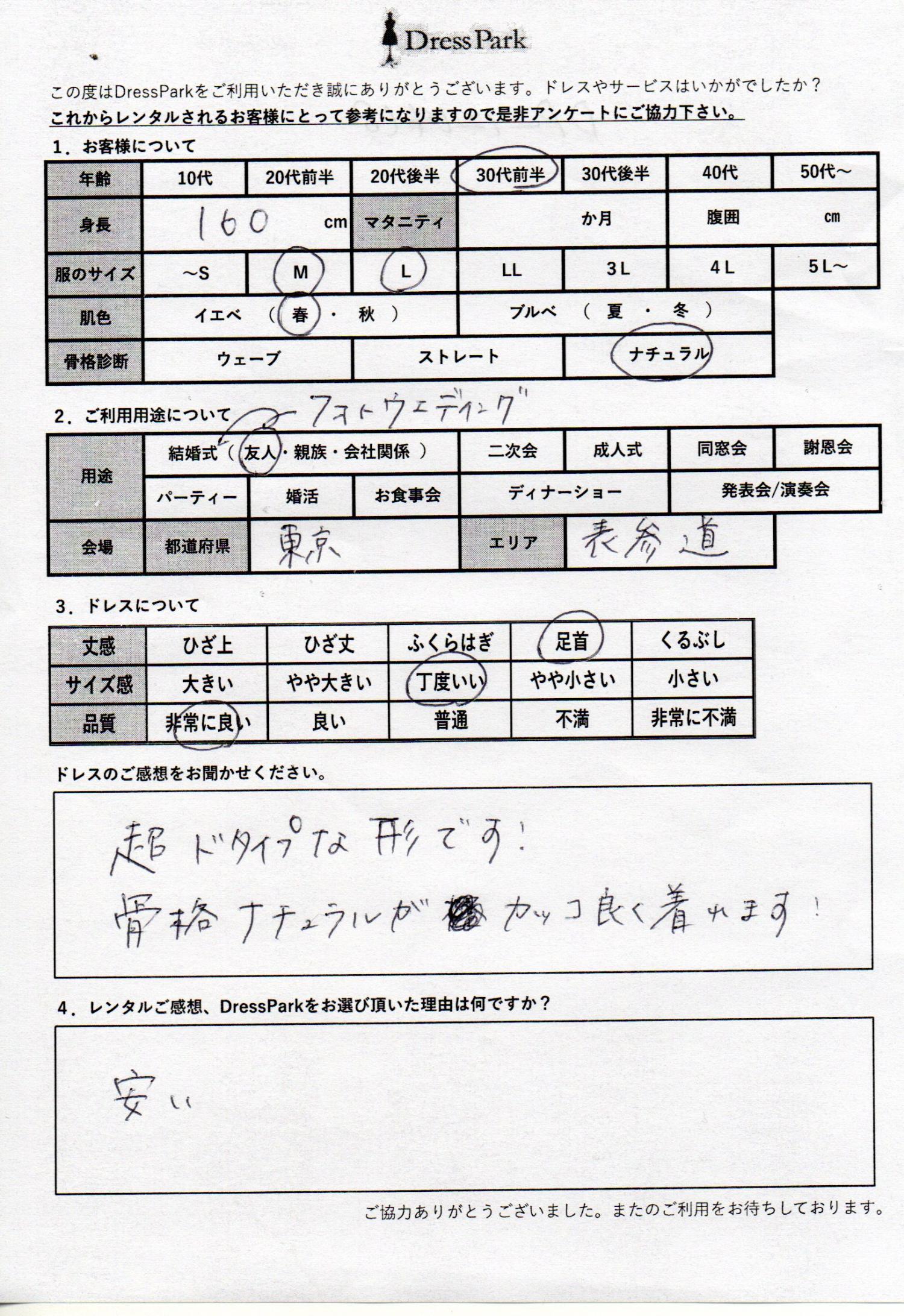 東京都 M.O様160㎝ Mサイズ青山・表参道 #30代#M/L#160~164㎝#結婚式(友人)#東京都#青山・表参道 ◆レンタルしたドレスはこちら ◆レンタルしたサイズは:M ◆レンタルした日付:2025/12/13 ドレスの着用感 ◆点数: (5点) ◆丈感:足首 ◆サイズ感:丁度いい ◆品質:非常に良い ◆肌色:イエベ ◆骨格診断:ナチュラル ドレスの感想 超どタイプな形です!骨格ナチュラルがかっこよく着られます! レンタルのご感想、DressParkをお選び頂いた理由 安い CUSTOMER REVIEWS お客様の声 気になるカテゴリー別にご利用の感想をチェック! ◆AGE 年代で見る 10代 20代 30代 40代 50代~ ◆SIZE サイズで見る SS/S M/L 大きいサイズLL~ ◆HIGHT 身長で見る 140~149㎝ 150~154㎝ 155~159㎝ 160~164㎝ 165~169㎝ 170㎝以上 ◆マタニティ ~3か月 4~6か月 7~8か月 9~10か月 ◆肌色 イエベ ブルべ ◆骨格診断 ウェーブ ストレート ナチュラル ◆利用シーン 結婚式(友人) 結婚式(親族) 結婚式(会社関係) 二次会 成人式 謝恩会 パーティー その他 CUSTOMER REVIEWS都道府県別お客様の声 都道府県別にのお客様の声をチェック! 北海道 青森県 岩手県 宮城県 秋田県 山形県 福島県 茨城県 栃木県 群馬県 埼玉県 千葉県 東京都 神奈川県 新潟県 富山県 石川県 福井県 山梨県 長野県 岐阜県 静岡県 愛知県 三重県 滋賀県 京都府 大阪府 兵庫県 奈良県 和歌山県 鳥取県 島根県 岡山県 広島県 山口県 徳島県 香川県 愛媛県 高知県 福岡県 佐賀県 長崎県 熊本県 大分県 宮崎県 鹿児島県 沖縄県 CUSTOMER REVIEWSエリア別お客様の声 都道府県別にのお客様の声をチェック! 札幌 仙台 名古屋 軽井沢 金沢 神戸・芦屋 博多 那覇 梅田・新大阪 難波・心斎橋 鎌倉・湘南 横浜・みなとみらい 舞浜・浦安・幕張 大宮・浦和 青山・表参道 六本木・麻布 渋谷・恵比寿 新宿 池袋 銀座・丸の内 お台場・汐留 鹿児島市 郡山市 福島市 東予 甲府・石和 LINEでお問い合わせ このサイトではJavaScriptを使用しています