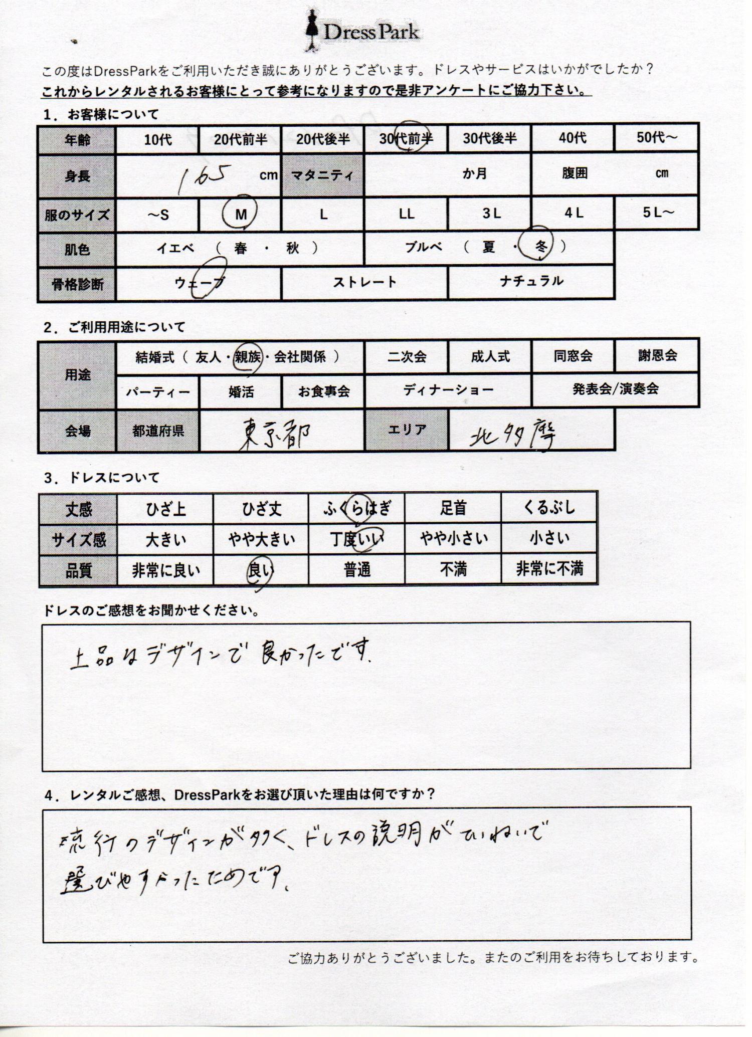 東京都 M.T様165㎝ Mサイズ #30代#M/L#165~169㎝#結婚式(親族)#東京都 ◆レンタルしたドレスはこちら ◆レンタルしたサイズは:M ◆レンタルした日付:2025/12/13 ドレスの着用感 ◆点数: (4点) ◆丈感:ふくらはぎ ◆サイズ感:丁度いい ◆品質:良い ◆肌色:ブルべ ◆骨格診断:ウェーブ ドレスの感想 上品なデザインでよかったです。 レンタルのご感想、DressParkをお選び頂いた理由 流行なデザインが多く、ドレスの説明が丁寧で選びやすかったためです。 CUSTOMER REVIEWS お客様の声 気になるカテゴリー別にご利用の感想をチェック! ◆AGE 年代で見る 10代 20代 30代 40代 50代~ ◆SIZE サイズで見る SS/S M/L 大きいサイズLL~ ◆HIGHT 身長で見る 140~149㎝ 150~154㎝ 155~159㎝ 160~164㎝ 165~169㎝ 170㎝以上 ◆マタニティ ~3か月 4~6か月 7~8か月 9~10か月 ◆肌色 イエベ ブルべ ◆骨格診断 ウェーブ ストレート ナチュラル ◆利用シーン 結婚式(友人) 結婚式(親族) 結婚式(会社関係) 二次会 成人式 謝恩会 パーティー その他 CUSTOMER REVIEWS都道府県別お客様の声 都道府県別にのお客様の声をチェック! 北海道 青森県 岩手県 宮城県 秋田県 山形県 福島県 茨城県 栃木県 群馬県 埼玉県 千葉県 東京都 神奈川県 新潟県 富山県 石川県 福井県 山梨県 長野県 岐阜県 静岡県 愛知県 三重県 滋賀県 京都府 大阪府 兵庫県 奈良県 和歌山県 鳥取県 島根県 岡山県 広島県 山口県 徳島県 香川県 愛媛県 高知県 福岡県 佐賀県 長崎県 熊本県 大分県 宮崎県 鹿児島県 沖縄県 CUSTOMER REVIEWSエリア別お客様の声 都道府県別にのお客様の声をチェック! 札幌 仙台 名古屋 軽井沢 金沢 神戸・芦屋 博多 那覇 梅田・新大阪 難波・心斎橋 鎌倉・湘南 横浜・みなとみらい 舞浜・浦安・幕張 大宮・浦和 青山・表参道 六本木・麻布 渋谷・恵比寿 新宿 池袋 銀座・丸の内 お台場・汐留 鹿児島市 郡山市 福島市 東予 甲府・石和 LINEでお問い合わせ このサイトではJavaScriptを使用しています