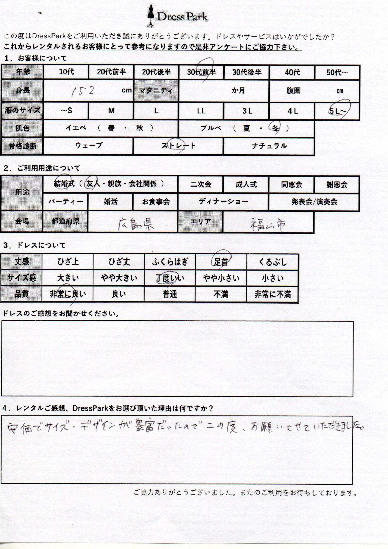 広島県 A.K様152㎝ 5L~サイズ #30代#大きいサイズLL~#150~154㎝#結婚式(友人)#広島県 ◆レンタルしたドレスはこちら ◆レンタルしたサイズは:5L ◆レンタルした日付:2025/12/13 ドレスの着用感 ◆点数: (5点) ◆丈感:足首 ◆サイズ感:丁度いい ◆品質:非常に良い ◆肌色:ブルべ ◆骨格診断:ストレート レンタルのご感想、DressParkをお選び頂いた理由 安価でサイズ、デザインが豊富だったので、このたびお願いさせていただきました。 CUSTOMER REVIEWS お客様の声 気になるカテゴリー別にご利用の感想をチェック! ◆AGE 年代で見る 10代 20代 30代 40代 50代~ ◆SIZE サイズで見る SS/S M/L 大きいサイズLL~ ◆HIGHT 身長で見る 140~149㎝ 150~154㎝ 155~159㎝ 160~164㎝ 165~169㎝ 170㎝以上 ◆マタニティ ~3か月 4~6か月 7~8か月 9~10か月 ◆肌色 イエベ ブルべ ◆骨格診断 ウェーブ ストレート ナチュラル ◆利用シーン 結婚式(友人) 結婚式(親族) 結婚式(会社関係) 二次会 成人式 謝恩会 パーティー その他 CUSTOMER REVIEWS都道府県別お客様の声 都道府県別にのお客様の声をチェック! 北海道 青森県 岩手県 宮城県 秋田県 山形県 福島県 茨城県 栃木県 群馬県 埼玉県 千葉県 東京都 神奈川県 新潟県 富山県 石川県 福井県 山梨県 長野県 岐阜県 静岡県 愛知県 三重県 滋賀県 京都府 大阪府 兵庫県 奈良県 和歌山県 鳥取県 島根県 岡山県 広島県 山口県 徳島県 香川県 愛媛県 高知県 福岡県 佐賀県 長崎県 熊本県 大分県 宮崎県 鹿児島県 沖縄県 CUSTOMER REVIEWSエリア別お客様の声 都道府県別にのお客様の声をチェック! 札幌 仙台 名古屋 軽井沢 金沢 神戸・芦屋 博多 那覇 梅田・新大阪 難波・心斎橋 鎌倉・湘南 横浜・みなとみらい 舞浜・浦安・幕張 大宮・浦和 青山・表参道 六本木・麻布 渋谷・恵比寿 新宿 池袋 銀座・丸の内 お台場・汐留 鹿児島市 郡山市 福島市 東予 甲府・石和 LINEでお問い合わせ このサイトではJavaScriptを使用しています