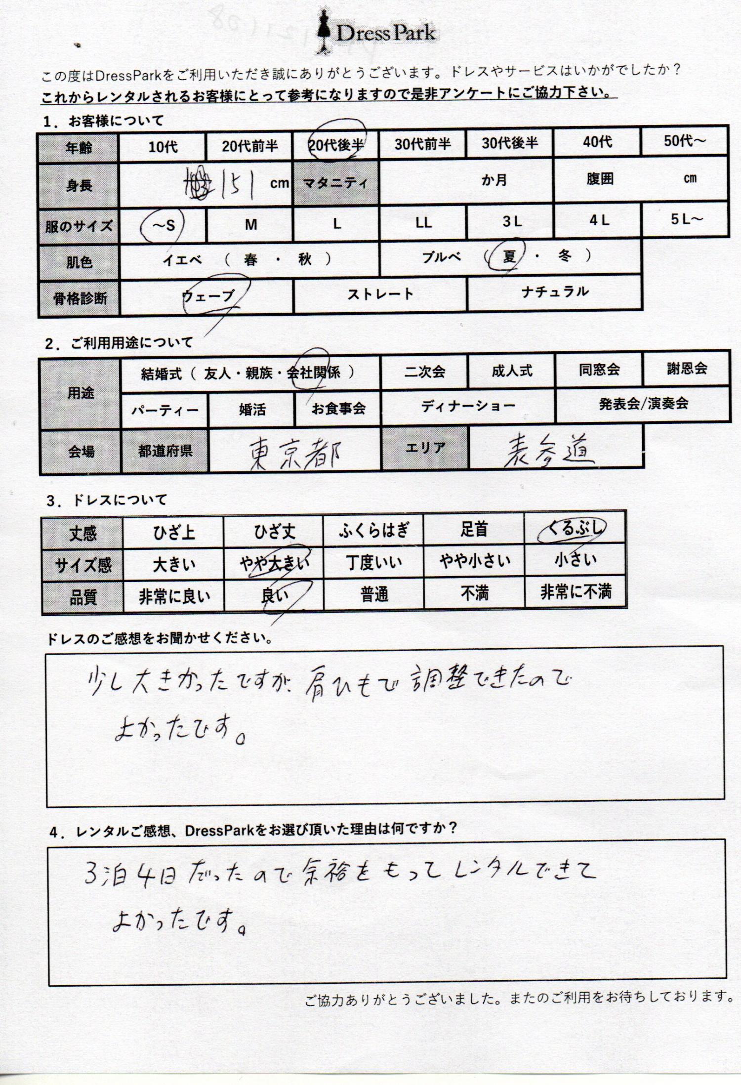 東京都 M.I様151㎝ ~Sサイズ青山・表参道 #20代#M/L#150~154㎝#結婚式(会社関係)#東京都#青山・表参道 ◆レンタルしたドレスはこちら ◆レンタルしたサイズは:M ◆レンタルした日付:2025/12/13 ドレスの着用感 ◆点数: (4点) ◆丈感:くるぶし ◆サイズ感:やや大きい ◆品質:良い ◆肌色:ブルべ ◆骨格診断:ウェーブ ドレスの感想 少し大きかったですが、肩紐で調節できたのでよかったです。 レンタルのご感想、DressParkをお選び頂いた理由 3泊4日だったので、余裕を持ってレンタルできてよかったです。 CUSTOMER REVIEWS お客様の声 気になるカテゴリー別にご利用の感想をチェック! ◆AGE 年代で見る 10代 20代 30代 40代 50代~ ◆SIZE サイズで見る SS/S M/L 大きいサイズLL~ ◆HIGHT 身長で見る 140~149㎝ 150~154㎝ 155~159㎝ 160~164㎝ 165~169㎝ 170㎝以上 ◆マタニティ ~3か月 4~6か月 7~8か月 9~10か月 ◆肌色 イエベ ブルべ ◆骨格診断 ウェーブ ストレート ナチュラル ◆利用シーン 結婚式(友人) 結婚式(親族) 結婚式(会社関係) 二次会 成人式 謝恩会 パーティー その他 CUSTOMER REVIEWS都道府県別お客様の声 都道府県別にのお客様の声をチェック! 北海道 青森県 岩手県 宮城県 秋田県 山形県 福島県 茨城県 栃木県 群馬県 埼玉県 千葉県 東京都 神奈川県 新潟県 富山県 石川県 福井県 山梨県 長野県 岐阜県 静岡県 愛知県 三重県 滋賀県 京都府 大阪府 兵庫県 奈良県 和歌山県 鳥取県 島根県 岡山県 広島県 山口県 徳島県 香川県 愛媛県 高知県 福岡県 佐賀県 長崎県 熊本県 大分県 宮崎県 鹿児島県 沖縄県 CUSTOMER REVIEWSエリア別お客様の声 都道府県別にのお客様の声をチェック! 札幌 仙台 名古屋 軽井沢 金沢 神戸・芦屋 博多 那覇 梅田・新大阪 難波・心斎橋 鎌倉・湘南 横浜・みなとみらい 舞浜・浦安・幕張 大宮・浦和 青山・表参道 六本木・麻布 渋谷・恵比寿 新宿 池袋 銀座・丸の内 お台場・汐留 鹿児島市 郡山市 福島市 東予 甲府・石和 LINEでお問い合わせ このサイトではJavaScriptを使用しています