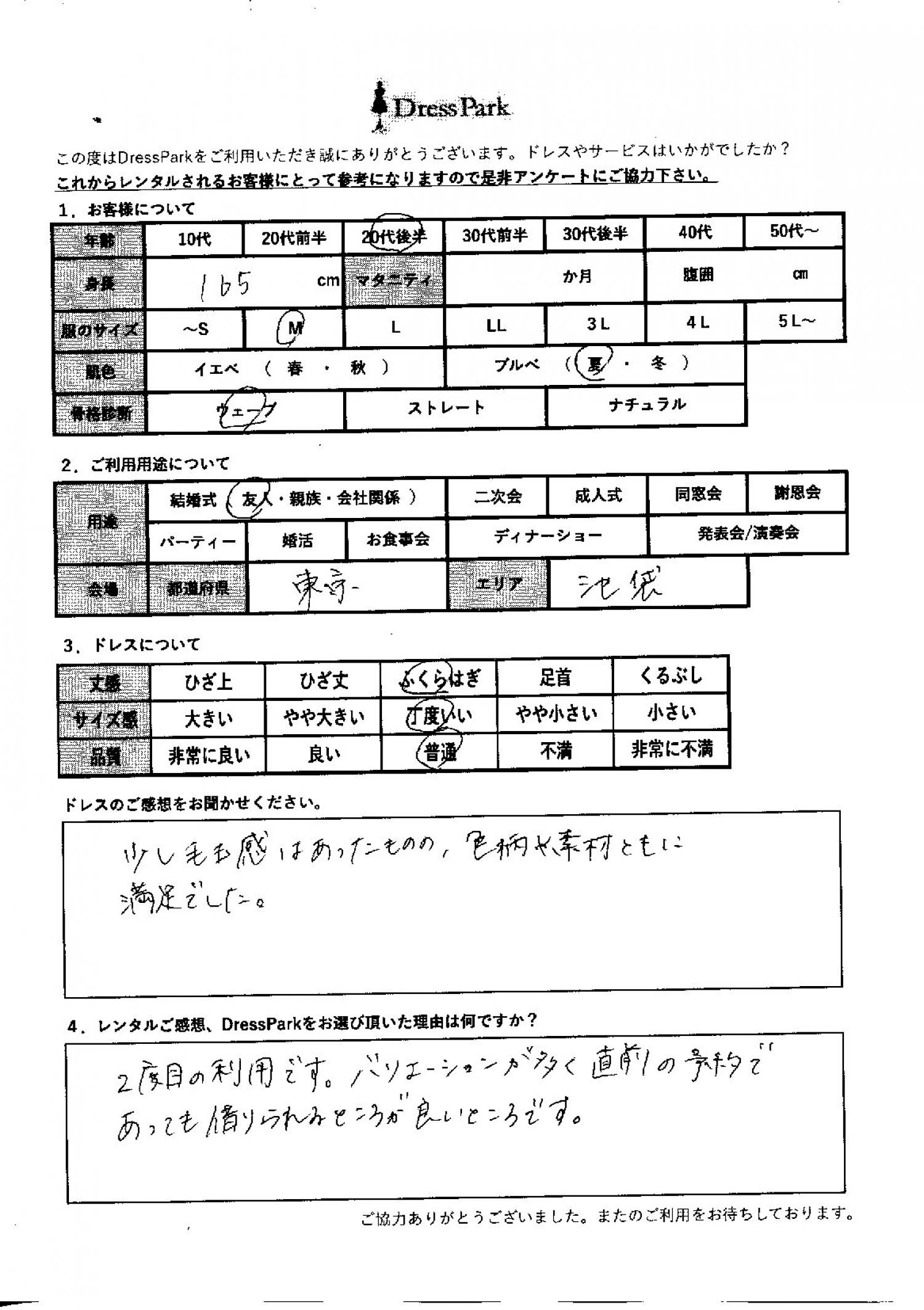 東京都 M.S様165㎝ Mサイズ池袋 #20代#M/L#165~169㎝#結婚式(友人)#東京都#池袋 ◆レンタルしたドレスはこちら ◆レンタルしたサイズは:M ◆レンタルした日付:2025/12/14 ドレスの着用感 ◆点数: (4点) ◆丈感:ふくらはぎ ◆サイズ感:丁度いい ◆品質:普通 ◆肌色:ブルべ ◆骨格診断:ウェーブ ドレスの感想 少し毛玉感はあったものの、色柄や素材ともに満足でした。 レンタルのご感想、DressParkをお選び頂いた理由 2度目の利用です。バリエーションが多く直前の予約であっても、借りられるところが良いです。 CUSTOMER REVIEWS お客様の声 気になるカテゴリー別にご利用の感想をチェック! ◆AGE 年代で見る 10代 20代 30代 40代 50代~ ◆SIZE サイズで見る SS/S M/L 大きいサイズLL~ ◆HIGHT 身長で見る 140~149㎝ 150~154㎝ 155~159㎝ 160~164㎝ 165~169㎝ 170㎝以上 ◆マタニティ ~3か月 4~6か月 7~8か月 9~10か月 ◆肌色 イエベ ブルべ ◆骨格診断 ウェーブ ストレート ナチュラル ◆利用シーン 結婚式(友人) 結婚式(親族) 結婚式(会社関係) 二次会 成人式 謝恩会 パーティー その他 CUSTOMER REVIEWS都道府県別お客様の声 都道府県別にのお客様の声をチェック! 北海道 青森県 岩手県 宮城県 秋田県 山形県 福島県 茨城県 栃木県 群馬県 埼玉県 千葉県 東京都 神奈川県 新潟県 富山県 石川県 福井県 山梨県 長野県 岐阜県 静岡県 愛知県 三重県 滋賀県 京都府 大阪府 兵庫県 奈良県 和歌山県 鳥取県 島根県 岡山県 広島県 山口県 徳島県 香川県 愛媛県 高知県 福岡県 佐賀県 長崎県 熊本県 大分県 宮崎県 鹿児島県 沖縄県 CUSTOMER REVIEWSエリア別お客様の声 都道府県別にのお客様の声をチェック! 札幌 仙台 名古屋 軽井沢 金沢 神戸・芦屋 博多 那覇 梅田・新大阪 難波・心斎橋 鎌倉・湘南 横浜・みなとみらい 舞浜・浦安・幕張 大宮・浦和 青山・表参道 六本木・麻布 渋谷・恵比寿 新宿 池袋 銀座・丸の内 お台場・汐留 鹿児島市 郡山市 福島市 東予 甲府・石和 LINEでお問い合わせ このサイトではJavaScriptを使用しています