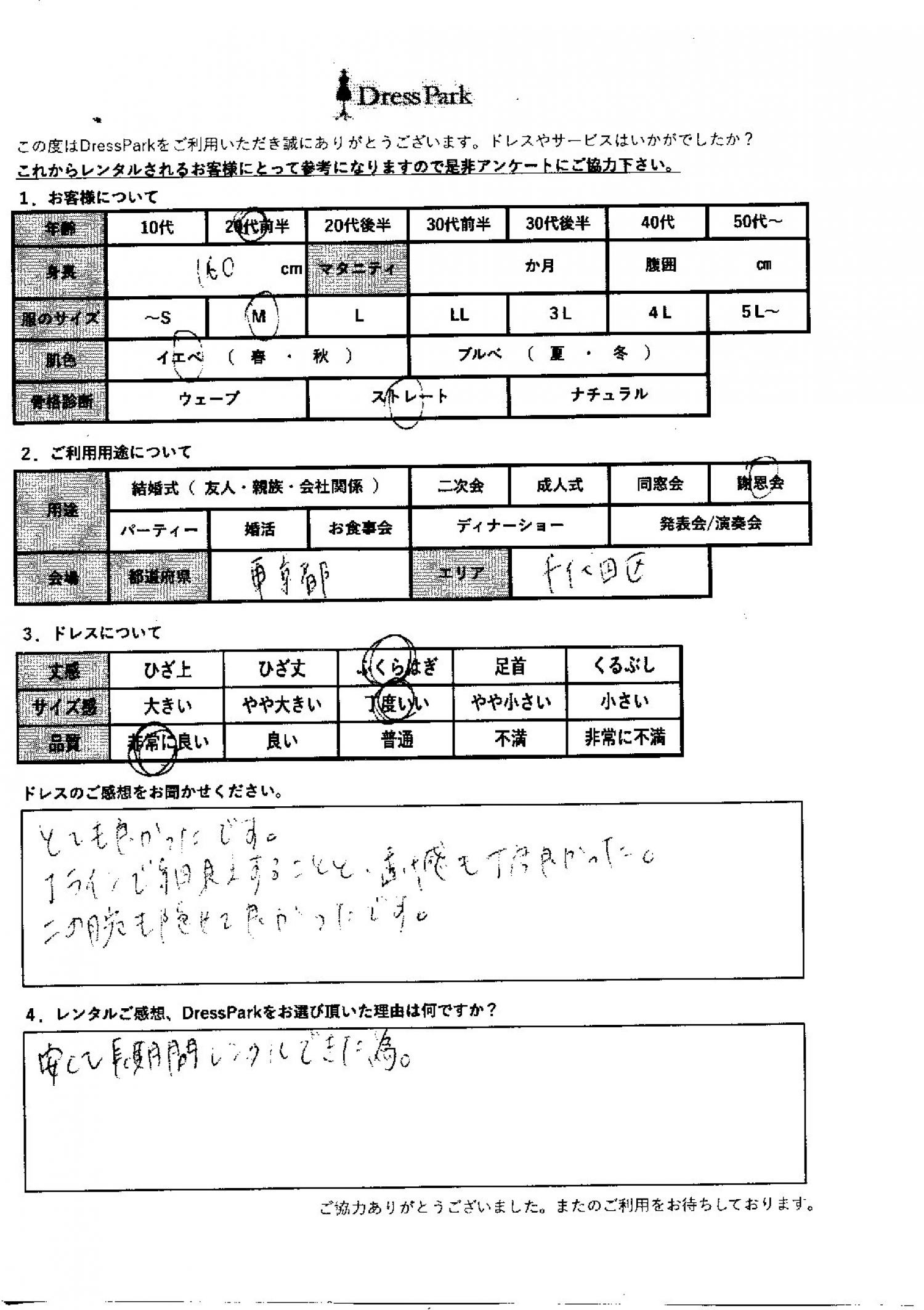 東京都 H.S様160㎝ Mサイズ銀座・丸の内 #20代#M/L#160~164㎝#謝恩会#東京都#銀座・丸の内 ◆レンタルしたドレスはこちら ◆レンタルしたサイズは:M ◆レンタルした日付:2025/12/14 ドレスの着用感 ◆点数: (5点) ◆丈感:ふくらはぎ ◆サイズ感:丁度いい ◆品質:非常に良い ◆肌色:イエベ ◆骨格診断:ストレート ドレスの感想 とても良かったです。Iラインで細見えすることと、透け感もちょうど良かった。二の腕も隠せてよかったです。 レンタルのご感想、DressParkをお選び頂いた理由 安くて長期間レンタルできたため。 CUSTOMER REVIEWS お客様の声 気になるカテゴリー別にご利用の感想をチェック! ◆AGE 年代で見る 10代 20代 30代 40代 50代~ ◆SIZE サイズで見る SS/S M/L 大きいサイズLL~ ◆HIGHT 身長で見る 140~149㎝ 150~154㎝ 155~159㎝ 160~164㎝ 165~169㎝ 170㎝以上 ◆マタニティ ~3か月 4~6か月 7~8か月 9~10か月 ◆肌色 イエベ ブルべ ◆骨格診断 ウェーブ ストレート ナチュラル ◆利用シーン 結婚式(友人) 結婚式(親族) 結婚式(会社関係) 二次会 成人式 謝恩会 パーティー その他 CUSTOMER REVIEWS都道府県別お客様の声 都道府県別にのお客様の声をチェック! 北海道 青森県 岩手県 宮城県 秋田県 山形県 福島県 茨城県 栃木県 群馬県 埼玉県 千葉県 東京都 神奈川県 新潟県 富山県 石川県 福井県 山梨県 長野県 岐阜県 静岡県 愛知県 三重県 滋賀県 京都府 大阪府 兵庫県 奈良県 和歌山県 鳥取県 島根県 岡山県 広島県 山口県 徳島県 香川県 愛媛県 高知県 福岡県 佐賀県 長崎県 熊本県 大分県 宮崎県 鹿児島県 沖縄県 CUSTOMER REVIEWSエリア別お客様の声 都道府県別にのお客様の声をチェック! 札幌 仙台 名古屋 軽井沢 金沢 神戸・芦屋 博多 那覇 梅田・新大阪 難波・心斎橋 鎌倉・湘南 横浜・みなとみらい 舞浜・浦安・幕張 大宮・浦和 青山・表参道 六本木・麻布 渋谷・恵比寿 新宿 池袋 銀座・丸の内 お台場・汐留 鹿児島市 郡山市 福島市 東予 甲府・石和 LINEでお問い合わせ このサイトではJavaScriptを使用しています
