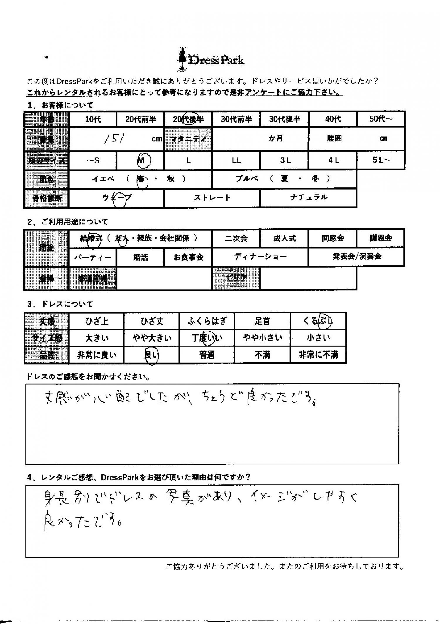 宮崎県 K.K様151㎝ Mサイズ #20代#M/L#150~154㎝#結婚式(友人)#宮崎県 ◆レンタルしたドレスはこちら ◆レンタルしたサイズは:M ◆レンタルした日付:2025/12/13 ドレスの着用感 ◆点数: (4点) ◆丈感:くるぶし ◆サイズ感:丁度いい ◆品質:良い ◆肌色:イエベ ◆骨格診断:ウェーブ ドレスの感想 丈感が心配でしたが、ちょうど良かったです。 レンタルのご感想、DressParkをお選び頂いた理由 身長別でドレスの写真があり、イメージがしやすく良かったです。 CUSTOMER REVIEWS お客様の声 気になるカテゴリー別にご利用の感想をチェック! ◆AGE 年代で見る 10代 20代 30代 40代 50代~ ◆SIZE サイズで見る SS/S M/L 大きいサイズLL~ ◆HIGHT 身長で見る 140~149㎝ 150~154㎝ 155~159㎝ 160~164㎝ 165~169㎝ 170㎝以上 ◆マタニティ ~3か月 4~6か月 7~8か月 9~10か月 ◆肌色 イエベ ブルべ ◆骨格診断 ウェーブ ストレート ナチュラル ◆利用シーン 結婚式(友人) 結婚式(親族) 結婚式(会社関係) 二次会 成人式 謝恩会 パーティー その他 CUSTOMER REVIEWS都道府県別お客様の声 都道府県別にのお客様の声をチェック! 北海道 青森県 岩手県 宮城県 秋田県 山形県 福島県 茨城県 栃木県 群馬県 埼玉県 千葉県 東京都 神奈川県 新潟県 富山県 石川県 福井県 山梨県 長野県 岐阜県 静岡県 愛知県 三重県 滋賀県 京都府 大阪府 兵庫県 奈良県 和歌山県 鳥取県 島根県 岡山県 広島県 山口県 徳島県 香川県 愛媛県 高知県 福岡県 佐賀県 長崎県 熊本県 大分県 宮崎県 鹿児島県 沖縄県 CUSTOMER REVIEWSエリア別お客様の声 都道府県別にのお客様の声をチェック! 札幌 仙台 名古屋 軽井沢 金沢 神戸・芦屋 博多 那覇 梅田・新大阪 難波・心斎橋 鎌倉・湘南 横浜・みなとみらい 舞浜・浦安・幕張 大宮・浦和 青山・表参道 六本木・麻布 渋谷・恵比寿 新宿 池袋 銀座・丸の内 お台場・汐留 鹿児島市 郡山市 福島市 東予 甲府・石和 LINEでお問い合わせ このサイトではJavaScriptを使用しています