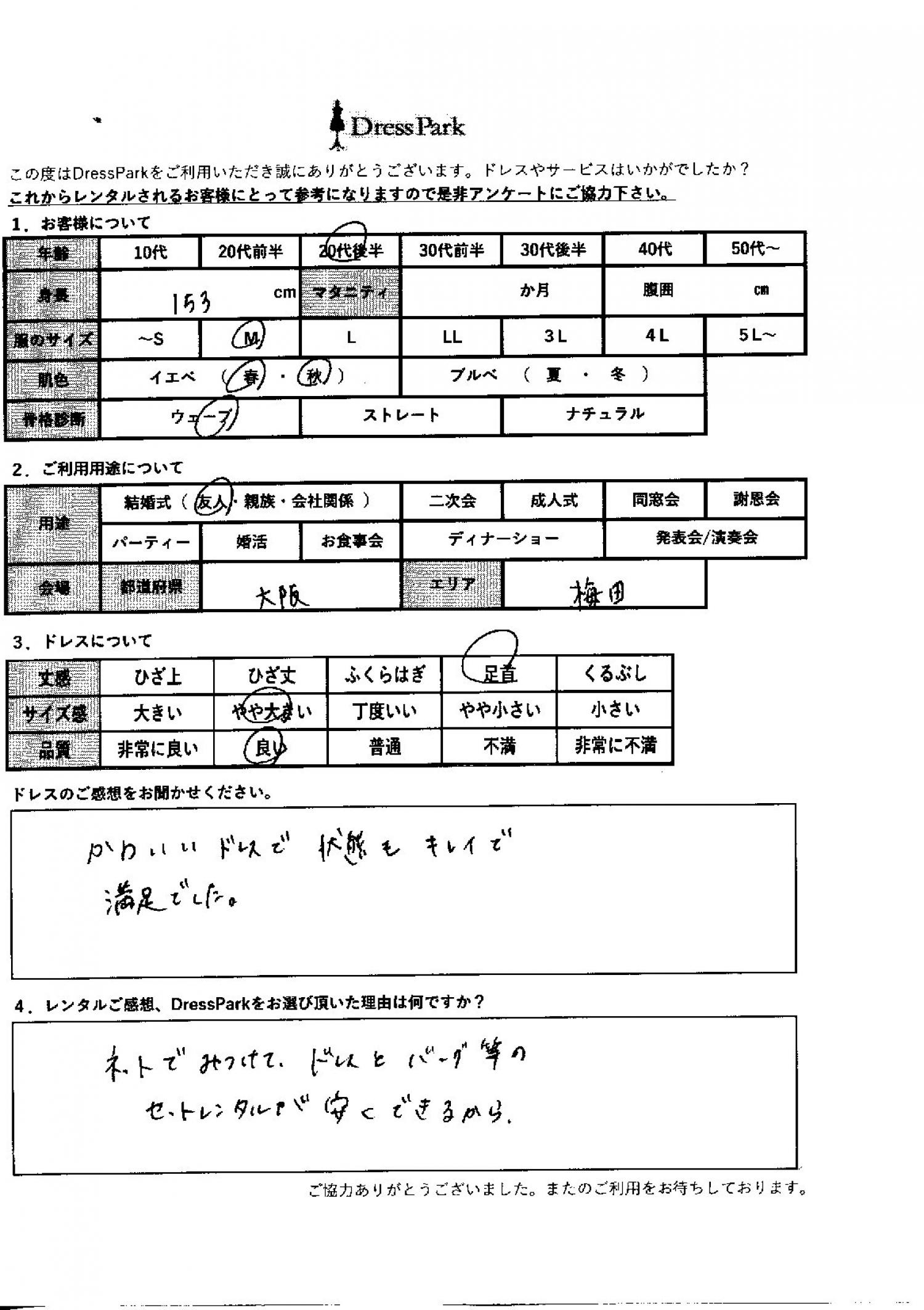 大阪府 Y.S様153㎝ Mサイズ梅田・新大阪 #20代#M/L#150~154㎝#結婚式(友人)#大阪府#梅田・新大阪 ◆レンタルしたドレスはこちら ◆レンタルしたサイズは:M ◆レンタルした日付:2025/12/14 ドレスの着用感 ◆点数: (4点) ◆丈感:足首 ◆サイズ感:やや大きい ◆品質:良い ◆肌色:イエベ ◆骨格診断:ウェーブ ドレスの感想 かわいいドレスで状態も綺麗で満足でした。 レンタルのご感想、DressParkをお選び頂いた理由 ネットで見つけてドレスをとバック等のレンタルが安くできるから。 CUSTOMER REVIEWS お客様の声 気になるカテゴリー別にご利用の感想をチェック! ◆AGE 年代で見る 10代 20代 30代 40代 50代~ ◆SIZE サイズで見る SS/S M/L 大きいサイズLL~ ◆HIGHT 身長で見る 140~149㎝ 150~154㎝ 155~159㎝ 160~164㎝ 165~169㎝ 170㎝以上 ◆マタニティ ~3か月 4~6か月 7~8か月 9~10か月 ◆肌色 イエベ ブルべ ◆骨格診断 ウェーブ ストレート ナチュラル ◆利用シーン 結婚式(友人) 結婚式(親族) 結婚式(会社関係) 二次会 成人式 謝恩会 パーティー その他 CUSTOMER REVIEWS都道府県別お客様の声 都道府県別にのお客様の声をチェック! 北海道 青森県 岩手県 宮城県 秋田県 山形県 福島県 茨城県 栃木県 群馬県 埼玉県 千葉県 東京都 神奈川県 新潟県 富山県 石川県 福井県 山梨県 長野県 岐阜県 静岡県 愛知県 三重県 滋賀県 京都府 大阪府 兵庫県 奈良県 和歌山県 鳥取県 島根県 岡山県 広島県 山口県 徳島県 香川県 愛媛県 高知県 福岡県 佐賀県 長崎県 熊本県 大分県 宮崎県 鹿児島県 沖縄県 CUSTOMER REVIEWSエリア別お客様の声 都道府県別にのお客様の声をチェック! 札幌 仙台 名古屋 軽井沢 金沢 神戸・芦屋 博多 那覇 梅田・新大阪 難波・心斎橋 鎌倉・湘南 横浜・みなとみらい 舞浜・浦安・幕張 大宮・浦和 青山・表参道 六本木・麻布 渋谷・恵比寿 新宿 池袋 銀座・丸の内 お台場・汐留 鹿児島市 郡山市 福島市 東予 甲府・石和 LINEでお問い合わせ このサイトではJavaScriptを使用しています