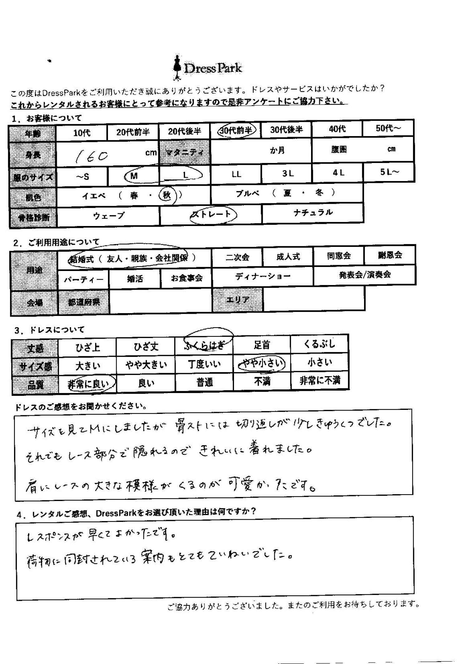 福岡県 A.W様160㎝ Mサイズ #30代#M/L#160~164㎝#結婚式(友人)#福岡県 ◆レンタルしたドレスはこちら ◆レンタルしたサイズは:M ◆レンタルした日付:2025/12/13 ドレスの着用感 ◆点数: (5点) ◆丈感:ふくらはぎ ◆サイズ感:やや小さい ◆品質:非常に良い ◆肌色:イエベ ◆骨格診断:ストレート ドレスの感想 サイズを見てMサイズにしましたが、骨格ストレートには切り返しが少し窮屈でした。それでもレース部分で隠れるので、きれいに着られました。肩にレースの大きな模様が来るのが可愛かったです。 レンタルのご感想、DressParkをお選び頂いた理由 レスポンスが早くてよかったです。荷物に同封されている案内もとても丁寧でした。 CUSTOMER REVIEWS お客様の声 気になるカテゴリー別にご利用の感想をチェック! ◆AGE 年代で見る 10代 20代 30代 40代 50代~ ◆SIZE サイズで見る SS/S M/L 大きいサイズLL~ ◆HIGHT 身長で見る 140~149㎝ 150~154㎝ 155~159㎝ 160~164㎝ 165~169㎝ 170㎝以上 ◆マタニティ ~3か月 4~6か月 7~8か月 9~10か月 ◆肌色 イエベ ブルべ ◆骨格診断 ウェーブ ストレート ナチュラル ◆利用シーン 結婚式(友人) 結婚式(親族) 結婚式(会社関係) 二次会 成人式 謝恩会 パーティー その他 CUSTOMER REVIEWS都道府県別お客様の声 都道府県別にのお客様の声をチェック! 北海道 青森県 岩手県 宮城県 秋田県 山形県 福島県 茨城県 栃木県 群馬県 埼玉県 千葉県 東京都 神奈川県 新潟県 富山県 石川県 福井県 山梨県 長野県 岐阜県 静岡県 愛知県 三重県 滋賀県 京都府 大阪府 兵庫県 奈良県 和歌山県 鳥取県 島根県 岡山県 広島県 山口県 徳島県 香川県 愛媛県 高知県 福岡県 佐賀県 長崎県 熊本県 大分県 宮崎県 鹿児島県 沖縄県 CUSTOMER REVIEWSエリア別お客様の声 都道府県別にのお客様の声をチェック! 札幌 仙台 名古屋 軽井沢 金沢 神戸・芦屋 博多 那覇 梅田・新大阪 難波・心斎橋 鎌倉・湘南 横浜・みなとみらい 舞浜・浦安・幕張 大宮・浦和 青山・表参道 六本木・麻布 渋谷・恵比寿 新宿 池袋 銀座・丸の内 お台場・汐留 鹿児島市 郡山市 福島市 東予 甲府・石和 LINEでお問い合わせ このサイトではJavaScriptを使用しています