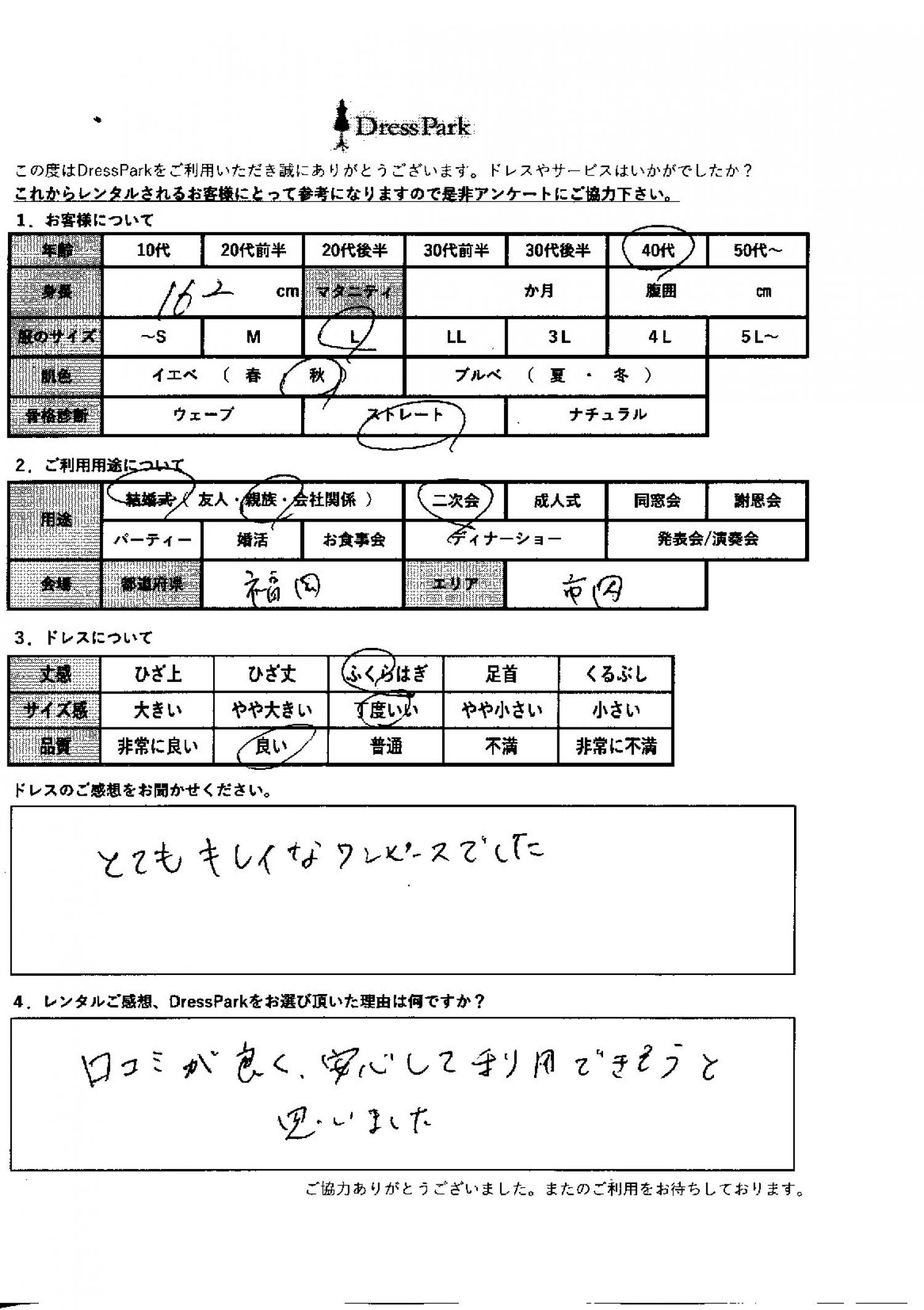 福岡県 Y.S様162㎝ Lサイズ #40代#M/L#160~164㎝#結婚式(親族)#福岡県 ◆レンタルしたドレスはこちら ◆レンタルしたサイズは:L ◆レンタルした日付:2025/12/13 ドレスの着用感 ◆点数: (4点) ◆丈感:ふくらはぎ ◆サイズ感:丁度いい ◆品質:良い ◆肌色:イエベ ◆骨格診断:ストレート ドレスの感想 とてもきれいなワンピースでした。 レンタルのご感想、DressParkをお選び頂いた理由 口コミが良く、安心して利用できそうと思いました。 CUSTOMER REVIEWS お客様の声 気になるカテゴリー別にご利用の感想をチェック! ◆AGE 年代で見る 10代 20代 30代 40代 50代~ ◆SIZE サイズで見る SS/S M/L 大きいサイズLL~ ◆HIGHT 身長で見る 140~149㎝ 150~154㎝ 155~159㎝ 160~164㎝ 165~169㎝ 170㎝以上 ◆マタニティ ~3か月 4~6か月 7~8か月 9~10か月 ◆肌色 イエベ ブルべ ◆骨格診断 ウェーブ ストレート ナチュラル ◆利用シーン 結婚式(友人) 結婚式(親族) 結婚式(会社関係) 二次会 成人式 謝恩会 パーティー その他 CUSTOMER REVIEWS都道府県別お客様の声 都道府県別にのお客様の声をチェック! 北海道 青森県 岩手県 宮城県 秋田県 山形県 福島県 茨城県 栃木県 群馬県 埼玉県 千葉県 東京都 神奈川県 新潟県 富山県 石川県 福井県 山梨県 長野県 岐阜県 静岡県 愛知県 三重県 滋賀県 京都府 大阪府 兵庫県 奈良県 和歌山県 鳥取県 島根県 岡山県 広島県 山口県 徳島県 香川県 愛媛県 高知県 福岡県 佐賀県 長崎県 熊本県 大分県 宮崎県 鹿児島県 沖縄県 CUSTOMER REVIEWSエリア別お客様の声 都道府県別にのお客様の声をチェック! 札幌 仙台 名古屋 軽井沢 金沢 神戸・芦屋 博多 那覇 梅田・新大阪 難波・心斎橋 鎌倉・湘南 横浜・みなとみらい 舞浜・浦安・幕張 大宮・浦和 青山・表参道 六本木・麻布 渋谷・恵比寿 新宿 池袋 銀座・丸の内 お台場・汐留 鹿児島市 郡山市 福島市 東予 甲府・石和 LINEでお問い合わせ このサイトではJavaScriptを使用しています