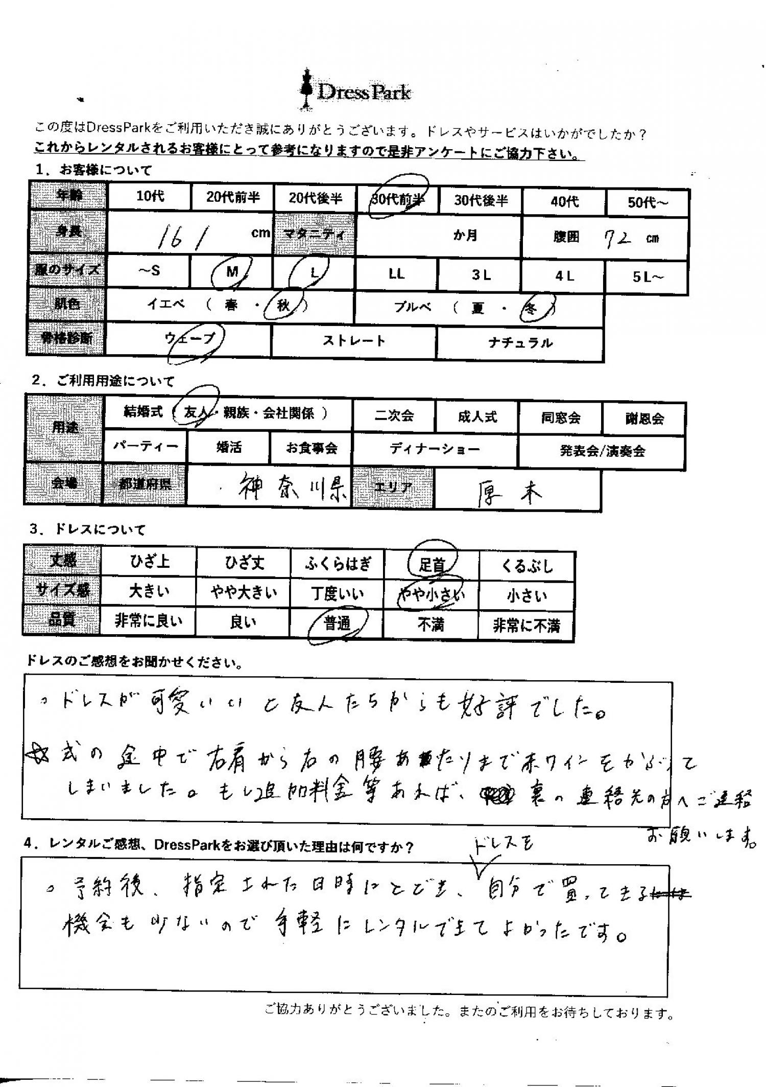 ドレスがかわいいと友人たちからも好評でした。式の途中で右肩から右の腰あたりまで赤ワインをかぶってしまいました。もし追加料金等あれば連絡先へご連絡お願いします。【スタッフより】