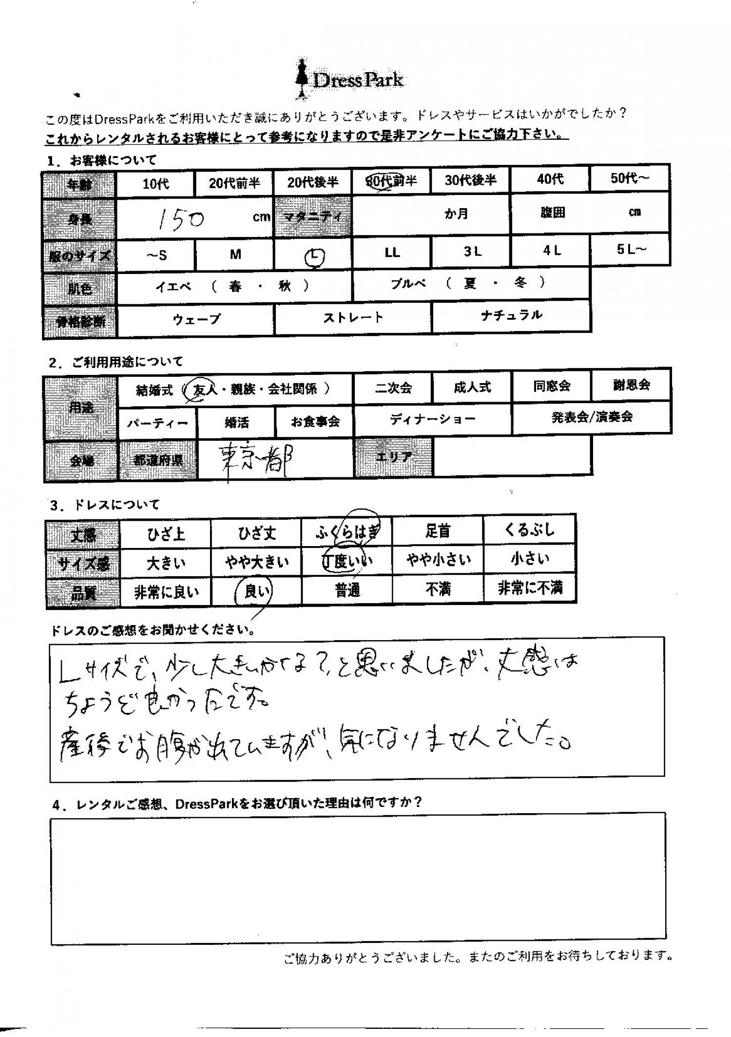 東京都 A.S様150㎝ Lサイズ #30代#M/L#150~154㎝#結婚式(友人)#東京都 ◆レンタルしたドレスはこちら ◆レンタルしたサイズは:L ◆レンタルした日付:2025/12/20 ドレスの着用感 ◆点数: (4点) ◆丈感:ふくらはぎ ◆サイズ感:丁度いい ◆品質:良い ドレスの感想 Lサイズで少し大きいかな?と思いましたが、丈感はちょうど良かったです。産後でお腹が出ていますが、気になりませんでした。 CUSTOMER REVIEWS お客様の声 気になるカテゴリー別にご利用の感想をチェック! ◆AGE 年代で見る 10代 20代 30代 40代 50代~ ◆SIZE サイズで見る SS/S M/L 大きいサイズLL~ ◆HIGHT 身長で見る 140~149㎝ 150~154㎝ 155~159㎝ 160~164㎝ 165~169㎝ 170㎝以上 ◆マタニティ ~3か月 4~6か月 7~8か月 9~10か月 ◆肌色 イエベ ブルべ ◆骨格診断 ウェーブ ストレート ナチュラル ◆利用シーン 結婚式(友人) 結婚式(親族) 結婚式(会社関係) 二次会 成人式/同窓会 謝恩会 パーティー その他 CUSTOMER REVIEWS都道府県別お客様の声 都道府県別にのお客様の声をチェック! 北海道 青森県 岩手県 宮城県 秋田県 山形県 福島県 茨城県 栃木県 群馬県 埼玉県 千葉県 東京都 神奈川県 新潟県 富山県 石川県 福井県 山梨県 長野県 岐阜県 静岡県 愛知県 三重県 滋賀県 京都府 大阪府 兵庫県 奈良県 和歌山県 鳥取県 島根県 岡山県 広島県 山口県 徳島県 香川県 愛媛県 高知県 福岡県 佐賀県 長崎県 熊本県 大分県 宮崎県 鹿児島県 沖縄県 CUSTOMER REVIEWSエリア別お客様の声 都道府県別にのお客様の声をチェック! 札幌 仙台 名古屋 軽井沢 金沢 神戸・芦屋 博多 那覇 梅田・新大阪 難波・心斎橋 鎌倉・湘南 横浜・みなとみらい 舞浜・浦安・幕張 大宮・浦和 青山・表参道 六本木・麻布 渋谷・恵比寿 新宿 池袋 銀座・丸の内 お台場・汐留 鹿児島市 郡山市 福島市 東予 甲府・石和 LINEでお問い合わせ このサイトではJavaScriptを使用しています