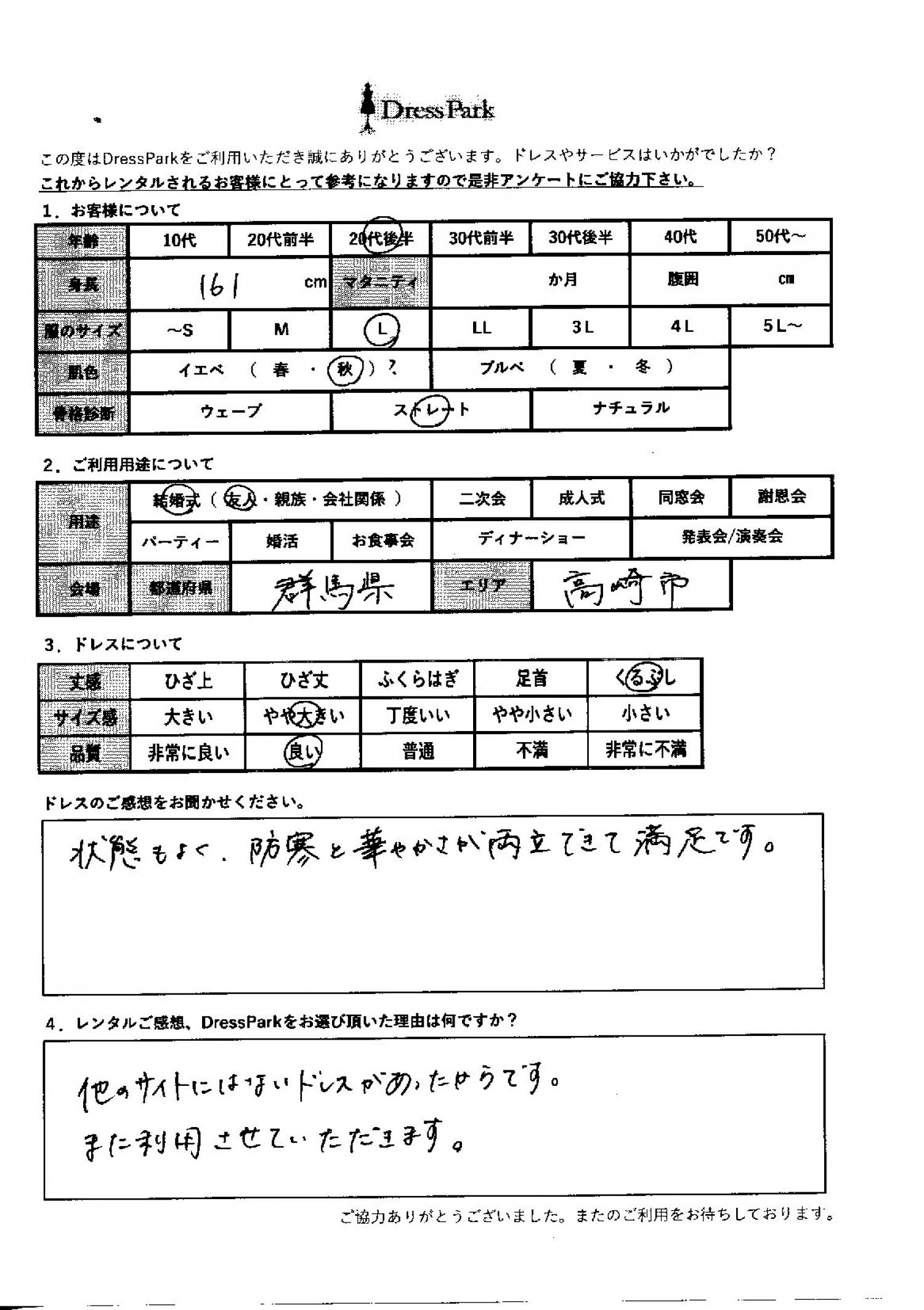 群馬県 Y.S様161㎝ Lサイズ #20代#M/L#160~164㎝#結婚式(友人)#群馬県 ◆レンタルしたドレスはこちら ◆レンタルしたサイズは:L ◆レンタルした日付:2025/12/20 ドレスの着用感 ◆点数: (4点) ◆丈感:くるぶし ◆サイズ感:やや大きい ◆品質:良い ◆肌色:イエベ ◆骨格診断:ストレート ドレスの感想 状態も良く、防寒と華やかさが両立できて満足です。 レンタルのご感想、DressParkをお選び頂いた理由 他のサイトにはないトレスがあったからです。また利用させていただきます。 CUSTOMER REVIEWS お客様の声 気になるカテゴリー別にご利用の感想をチェック! ◆AGE 年代で見る 10代 20代 30代 40代 50代~ ◆SIZE サイズで見る SS/S M/L 大きいサイズLL~ ◆HIGHT 身長で見る 140~149㎝ 150~154㎝ 155~159㎝ 160~164㎝ 165~169㎝ 170㎝以上 ◆マタニティ ~3か月 4~6か月 7~8か月 9~10か月 ◆肌色 イエベ ブルべ ◆骨格診断 ウェーブ ストレート ナチュラル ◆利用シーン 結婚式(友人) 結婚式(親族) 結婚式(会社関係) 二次会 成人式 謝恩会 パーティー その他 CUSTOMER REVIEWS都道府県別お客様の声 都道府県別にのお客様の声をチェック! 北海道 青森県 岩手県 宮城県 秋田県 山形県 福島県 茨城県 栃木県 群馬県 埼玉県 千葉県 東京都 神奈川県 新潟県 富山県 石川県 福井県 山梨県 長野県 岐阜県 静岡県 愛知県 三重県 滋賀県 京都府 大阪府 兵庫県 奈良県 和歌山県 鳥取県 島根県 岡山県 広島県 山口県 徳島県 香川県 愛媛県 高知県 福岡県 佐賀県 長崎県 熊本県 大分県 宮崎県 鹿児島県 沖縄県 CUSTOMER REVIEWSエリア別お客様の声 都道府県別にのお客様の声をチェック! 札幌 仙台 名古屋 軽井沢 金沢 神戸・芦屋 博多 那覇 梅田・新大阪 難波・心斎橋 鎌倉・湘南 横浜・みなとみらい 舞浜・浦安・幕張 大宮・浦和 青山・表参道 六本木・麻布 渋谷・恵比寿 新宿 池袋 銀座・丸の内 お台場・汐留 鹿児島市 郡山市 福島市 東予 甲府・石和 LINEでお問い合わせ このサイトではJavaScriptを使用しています