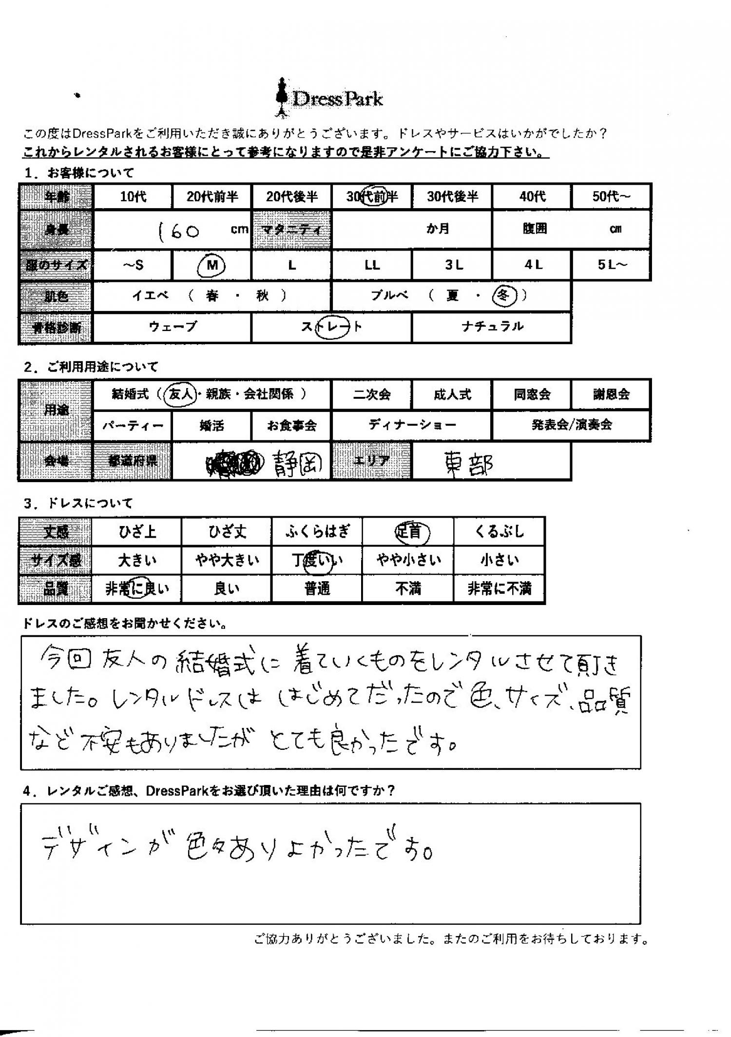 静岡県 K.N様160㎝ Mサイズ #30代#M/L#160~164㎝#結婚式(友人)#静岡県 ◆レンタルしたドレスはこちら ◆レンタルしたサイズは:M ◆レンタルした日付:2025/12/20 ドレスの着用感 ◆点数: (5点) ◆丈感:足首 ◆サイズ感:丁度いい ◆品質:非常に良い ◆肌色:ブルべ ◆骨格診断:ストレート ドレスの感想 今回友人の結婚式に着ていくものをレンタルさせていただきました。レンタルドレスは初めてだったので、色、サイズ、品質など不安もありましたが、とても良かったです。 レンタルのご感想、DressParkをお選び頂いた理由 デザインがいろいろありよかったです。 CUSTOMER REVIEWS お客様の声 気になるカテゴリー別にご利用の感想をチェック! ◆AGE 年代で見る 10代 20代 30代 40代 50代~ ◆SIZE サイズで見る SS/S M/L 大きいサイズLL~ ◆HIGHT 身長で見る 140~149㎝ 150~154㎝ 155~159㎝ 160~164㎝ 165~169㎝ 170㎝以上 ◆マタニティ ~3か月 4~6か月 7~8か月 9~10か月 ◆肌色 イエベ ブルべ ◆骨格診断 ウェーブ ストレート ナチュラル ◆利用シーン 結婚式(友人) 結婚式(親族) 結婚式(会社関係) 二次会 成人式 謝恩会 パーティー その他 CUSTOMER REVIEWS都道府県別お客様の声 都道府県別にのお客様の声をチェック! 北海道 青森県 岩手県 宮城県 秋田県 山形県 福島県 茨城県 栃木県 群馬県 埼玉県 千葉県 東京都 神奈川県 新潟県 富山県 石川県 福井県 山梨県 長野県 岐阜県 静岡県 愛知県 三重県 滋賀県 京都府 大阪府 兵庫県 奈良県 和歌山県 鳥取県 島根県 岡山県 広島県 山口県 徳島県 香川県 愛媛県 高知県 福岡県 佐賀県 長崎県 熊本県 大分県 宮崎県 鹿児島県 沖縄県 CUSTOMER REVIEWSエリア別お客様の声 都道府県別にのお客様の声をチェック! 札幌 仙台 名古屋 軽井沢 金沢 神戸・芦屋 博多 那覇 梅田・新大阪 難波・心斎橋 鎌倉・湘南 横浜・みなとみらい 舞浜・浦安・幕張 大宮・浦和 青山・表参道 六本木・麻布 渋谷・恵比寿 新宿 池袋 銀座・丸の内 お台場・汐留 鹿児島市 郡山市 福島市 東予 甲府・石和 LINEでお問い合わせ このサイトではJavaScriptを使用しています