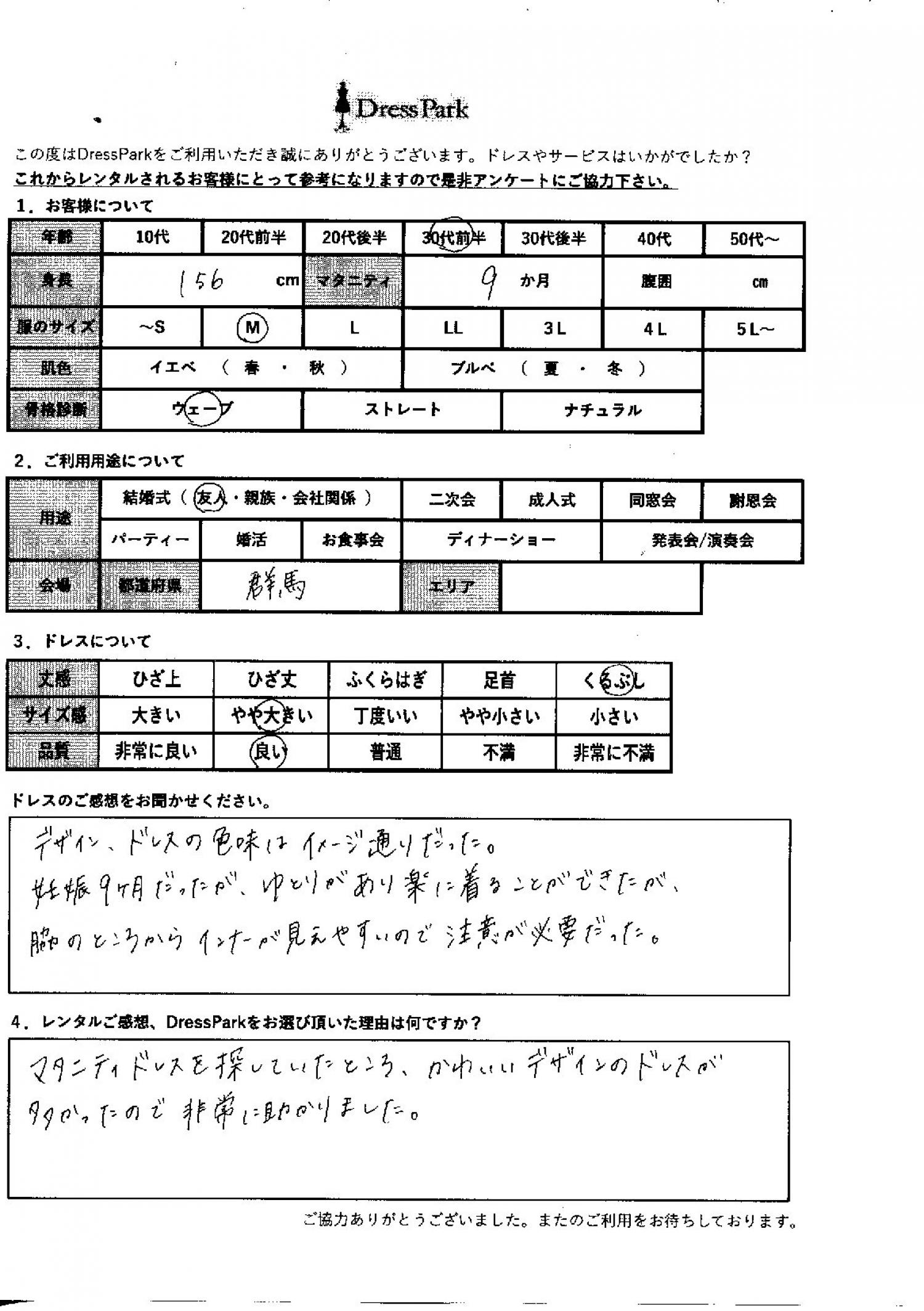 群馬県 M.K様156㎝ Mサイズ マタニティ #30代#M/L#155~159㎝#結婚式(友人)#群馬県 ◆レンタルしたドレスはこちら ◆レンタルしたサイズは:M ◆レンタルした日付:2025/12/20 ドレスの着用感 ◆点数: (4点) ◆丈感:くるぶし ◆サイズ感:やや大きい ◆品質:良い ◆マタニティ: ◆骨格診断:ウェーブ ドレスの感想 デザイン、ドレスの色味はイメージ通りだった。妊娠9ヶ月だったが、ゆとりがあり楽に切ることができたが、脇のところからインナーが見えやすいので注意が必要だった。 レンタルのご感想、DressParkをお選び頂いた理由 マタニティードレスを探していたところ、かわいいデザインのドレスが多かったので、非常に助かりました。 CUSTOMER REVIEWS お客様の声 気になるカテゴリー別にご利用の感想をチェック! ◆AGE 年代で見る 10代 20代 30代 40代 50代~ ◆SIZE サイズで見る SS/S M/L 大きいサイズLL~ ◆HIGHT 身長で見る 140~149㎝ 150~154㎝ 155~159㎝ 160~164㎝ 165~169㎝ 170㎝以上 ◆マタニティ ~3か月 4~6か月 7~8か月 9~10か月 ◆肌色 イエベ ブルべ ◆骨格診断 ウェーブ ストレート ナチュラル ◆利用シーン 結婚式(友人) 結婚式(親族) 結婚式(会社関係) 二次会 成人式 謝恩会 パーティー その他 CUSTOMER REVIEWS都道府県別お客様の声 都道府県別にのお客様の声をチェック! 北海道 青森県 岩手県 宮城県 秋田県 山形県 福島県 茨城県 栃木県 群馬県 埼玉県 千葉県 東京都 神奈川県 新潟県 富山県 石川県 福井県 山梨県 長野県 岐阜県 静岡県 愛知県 三重県 滋賀県 京都府 大阪府 兵庫県 奈良県 和歌山県 鳥取県 島根県 岡山県 広島県 山口県 徳島県 香川県 愛媛県 高知県 福岡県 佐賀県 長崎県 熊本県 大分県 宮崎県 鹿児島県 沖縄県 CUSTOMER REVIEWSエリア別お客様の声 都道府県別にのお客様の声をチェック! 札幌 仙台 名古屋 軽井沢 金沢 神戸・芦屋 博多 那覇 梅田・新大阪 難波・心斎橋 鎌倉・湘南 横浜・みなとみらい 舞浜・浦安・幕張 大宮・浦和 青山・表参道 六本木・麻布 渋谷・恵比寿 新宿 池袋 銀座・丸の内 お台場・汐留 鹿児島市 郡山市 福島市 東予 甲府・石和 LINEでお問い合わせ このサイトではJavaScriptを使用しています
