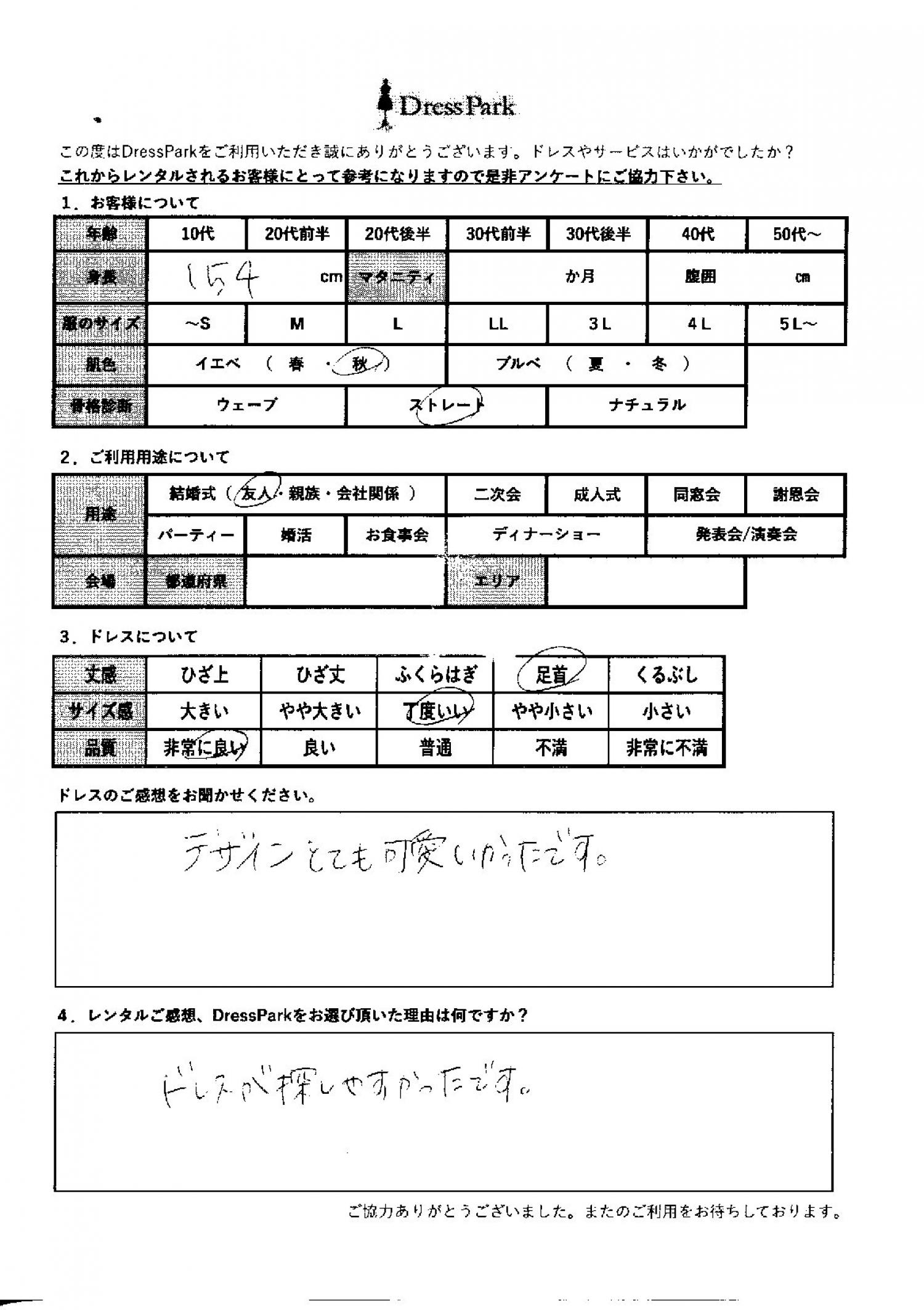 栃木県 M.I様154㎝ Mサイズ #20代#M/L#150~154㎝#結婚式(友人)#栃木県 ◆レンタルしたドレスはこちら ◆レンタルしたサイズは:M ◆レンタルした日付:2025/12/20 ドレスの着用感 ◆点数: (5点) ◆丈感:足首 ◆サイズ感:丁度いい ◆品質:非常に良い ◆肌色:イエベ ◆骨格診断:ストレート ドレスの感想 デザインとても可愛かったです。 レンタルのご感想、DressParkをお選び頂いた理由 ドレスが探しやすかったです。 CUSTOMER REVIEWS お客様の声 気になるカテゴリー別にご利用の感想をチェック! ◆AGE 年代で見る 10代 20代 30代 40代 50代~ ◆SIZE サイズで見る SS/S M/L 大きいサイズLL~ ◆HIGHT 身長で見る 140~149㎝ 150~154㎝ 155~159㎝ 160~164㎝ 165~169㎝ 170㎝以上 ◆マタニティ ~3か月 4~6か月 7~8か月 9~10か月 ◆肌色 イエベ ブルべ ◆骨格診断 ウェーブ ストレート ナチュラル ◆利用シーン 結婚式(友人) 結婚式(親族) 結婚式(会社関係) 二次会 成人式 謝恩会 パーティー その他 CUSTOMER REVIEWS都道府県別お客様の声 都道府県別にのお客様の声をチェック! 北海道 青森県 岩手県 宮城県 秋田県 山形県 福島県 茨城県 栃木県 群馬県 埼玉県 千葉県 東京都 神奈川県 新潟県 富山県 石川県 福井県 山梨県 長野県 岐阜県 静岡県 愛知県 三重県 滋賀県 京都府 大阪府 兵庫県 奈良県 和歌山県 鳥取県 島根県 岡山県 広島県 山口県 徳島県 香川県 愛媛県 高知県 福岡県 佐賀県 長崎県 熊本県 大分県 宮崎県 鹿児島県 沖縄県 CUSTOMER REVIEWSエリア別お客様の声 都道府県別にのお客様の声をチェック! 札幌 仙台 名古屋 軽井沢 金沢 神戸・芦屋 博多 那覇 梅田・新大阪 難波・心斎橋 鎌倉・湘南 横浜・みなとみらい 舞浜・浦安・幕張 大宮・浦和 青山・表参道 六本木・麻布 渋谷・恵比寿 新宿 池袋 銀座・丸の内 お台場・汐留 鹿児島市 郡山市 福島市 東予 甲府・石和 LINEでお問い合わせ このサイトではJavaScriptを使用しています