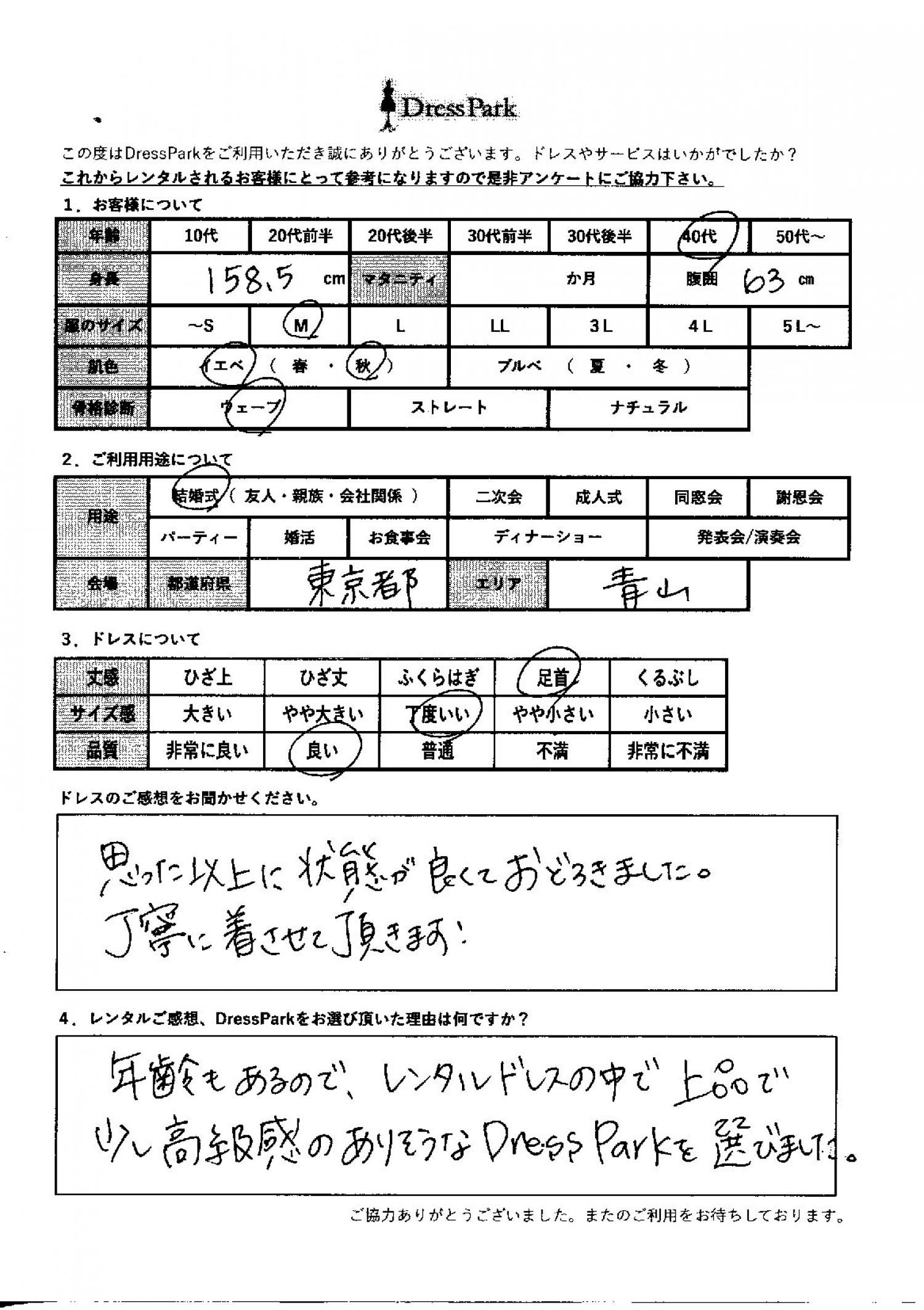 東京都 A.K様158㎝ Mサイズ青山・表参道 #40代#M/L#155~159㎝#結婚式(友人)#東京都#青山・表参道 ◆レンタルしたドレスはこちら ◆レンタルしたサイズは:M ◆レンタルした日付:2025/12/21 ドレスの着用感 ◆点数: (4点) ◆丈感:足首 ◆サイズ感:丁度いい ◆品質:良い ◆肌色:イエベ ◆骨格診断:ウェーブ ドレスの感想 思った以上に状態が良くて驚きました。丁寧に着させていただきます! レンタルのご感想、DressParkをお選び頂いた理由 年齢もあるので、レンタルドレスの中で上品で少し高級感のありそうなドレスパークを選びました。 CUSTOMER REVIEWS お客様の声 気になるカテゴリー別にご利用の感想をチェック! ◆AGE 年代で見る 10代 20代 30代 40代 50代~ ◆SIZE サイズで見る SS/S M/L 大きいサイズLL~ ◆HIGHT 身長で見る 140~149㎝ 150~154㎝ 155~159㎝ 160~164㎝ 165~169㎝ 170㎝以上 ◆マタニティ ~3か月 4~6か月 7~8か月 9~10か月 ◆肌色 イエベ ブルべ ◆骨格診断 ウェーブ ストレート ナチュラル ◆利用シーン 結婚式(友人) 結婚式(親族) 結婚式(会社関係) 二次会 成人式 謝恩会 パーティー その他 CUSTOMER REVIEWS都道府県別お客様の声 都道府県別にのお客様の声をチェック! 北海道 青森県 岩手県 宮城県 秋田県 山形県 福島県 茨城県 栃木県 群馬県 埼玉県 千葉県 東京都 神奈川県 新潟県 富山県 石川県 福井県 山梨県 長野県 岐阜県 静岡県 愛知県 三重県 滋賀県 京都府 大阪府 兵庫県 奈良県 和歌山県 鳥取県 島根県 岡山県 広島県 山口県 徳島県 香川県 愛媛県 高知県 福岡県 佐賀県 長崎県 熊本県 大分県 宮崎県 鹿児島県 沖縄県 CUSTOMER REVIEWSエリア別お客様の声 都道府県別にのお客様の声をチェック! 札幌 仙台 名古屋 軽井沢 金沢 神戸・芦屋 博多 那覇 梅田・新大阪 難波・心斎橋 鎌倉・湘南 横浜・みなとみらい 舞浜・浦安・幕張 大宮・浦和 青山・表参道 六本木・麻布 渋谷・恵比寿 新宿 池袋 銀座・丸の内 お台場・汐留 鹿児島市 郡山市 福島市 東予 甲府・石和 LINEでお問い合わせ このサイトではJavaScriptを使用しています