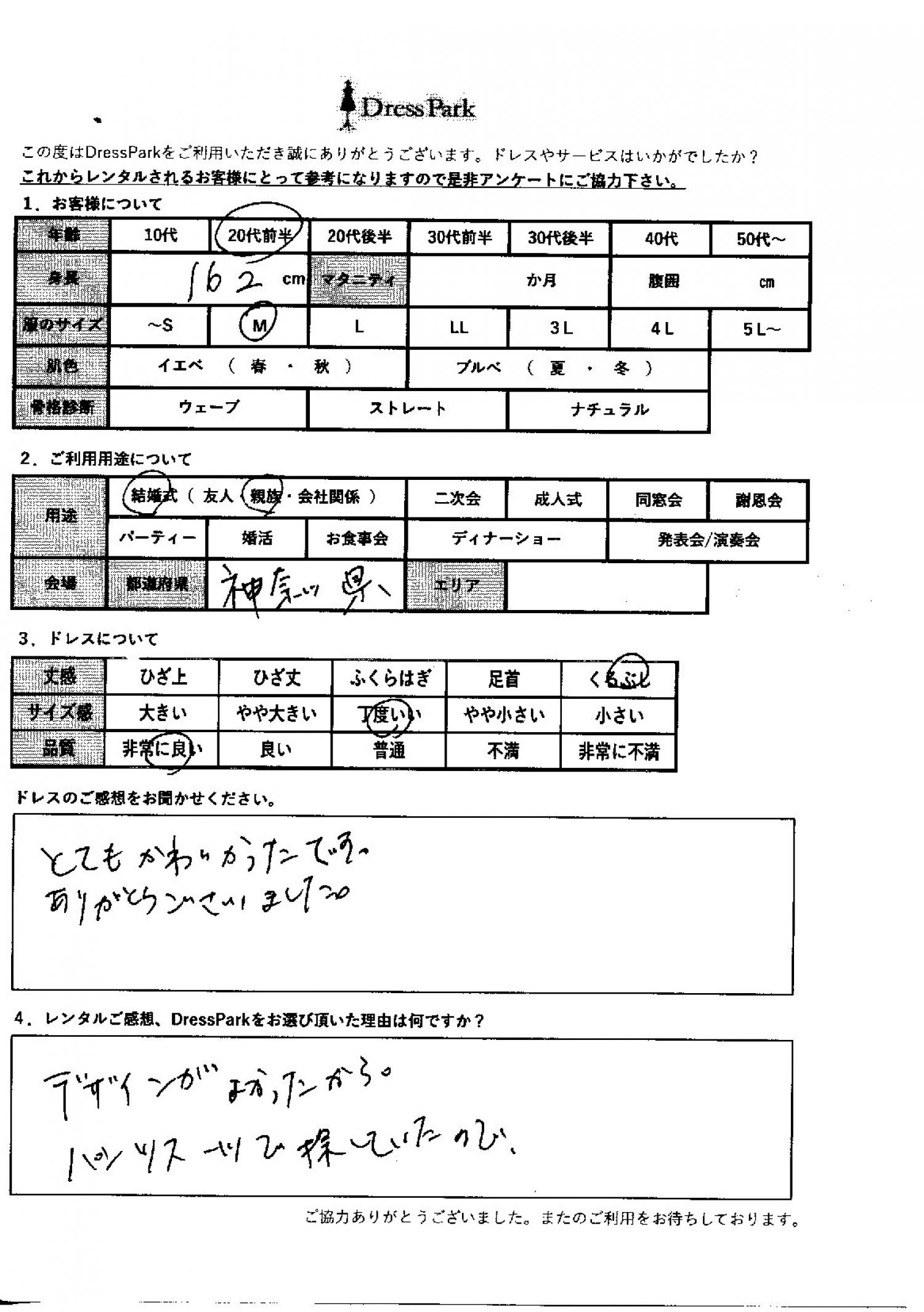 神奈川県 M.M様162㎝ Mサイズ #20代#M/L#160~164㎝#結婚式(親族)#神奈川県 ◆レンタルしたドレスはこちら ◆レンタルしたサイズは:M ◆レンタルした日付:2025/12/21 ドレスの着用感 ◆点数: (5点) ◆丈感:くるぶし ◆サイズ感:丁度いい ◆品質:非常に良い ドレスの感想 とても可愛かったです。ありがとうございました。 レンタルのご感想、DressParkをお選び頂いた理由 デザインが良かったから。パンツスーツで探していたので。 CUSTOMER REVIEWS お客様の声 気になるカテゴリー別にご利用の感想をチェック! ◆AGE 年代で見る 10代 20代 30代 40代 50代~ ◆SIZE サイズで見る SS/S M/L 大きいサイズLL~ ◆HIGHT 身長で見る 140~149㎝ 150~154㎝ 155~159㎝ 160~164㎝ 165~169㎝ 170㎝以上 ◆マタニティ ~3か月 4~6か月 7~8か月 9~10か月 ◆肌色 イエベ ブルべ ◆骨格診断 ウェーブ ストレート ナチュラル ◆利用シーン 結婚式(友人) 結婚式(親族) 結婚式(会社関係) 二次会 成人式 謝恩会 パーティー その他 CUSTOMER REVIEWS都道府県別お客様の声 都道府県別にのお客様の声をチェック! 北海道 青森県 岩手県 宮城県 秋田県 山形県 福島県 茨城県 栃木県 群馬県 埼玉県 千葉県 東京都 神奈川県 新潟県 富山県 石川県 福井県 山梨県 長野県 岐阜県 静岡県 愛知県 三重県 滋賀県 京都府 大阪府 兵庫県 奈良県 和歌山県 鳥取県 島根県 岡山県 広島県 山口県 徳島県 香川県 愛媛県 高知県 福岡県 佐賀県 長崎県 熊本県 大分県 宮崎県 鹿児島県 沖縄県 CUSTOMER REVIEWSエリア別お客様の声 都道府県別にのお客様の声をチェック! 札幌 仙台 名古屋 軽井沢 金沢 神戸・芦屋 博多 那覇 梅田・新大阪 難波・心斎橋 鎌倉・湘南 横浜・みなとみらい 舞浜・浦安・幕張 大宮・浦和 青山・表参道 六本木・麻布 渋谷・恵比寿 新宿 池袋 銀座・丸の内 お台場・汐留 鹿児島市 郡山市 福島市 東予 甲府・石和 LINEでお問い合わせ このサイトではJavaScriptを使用しています