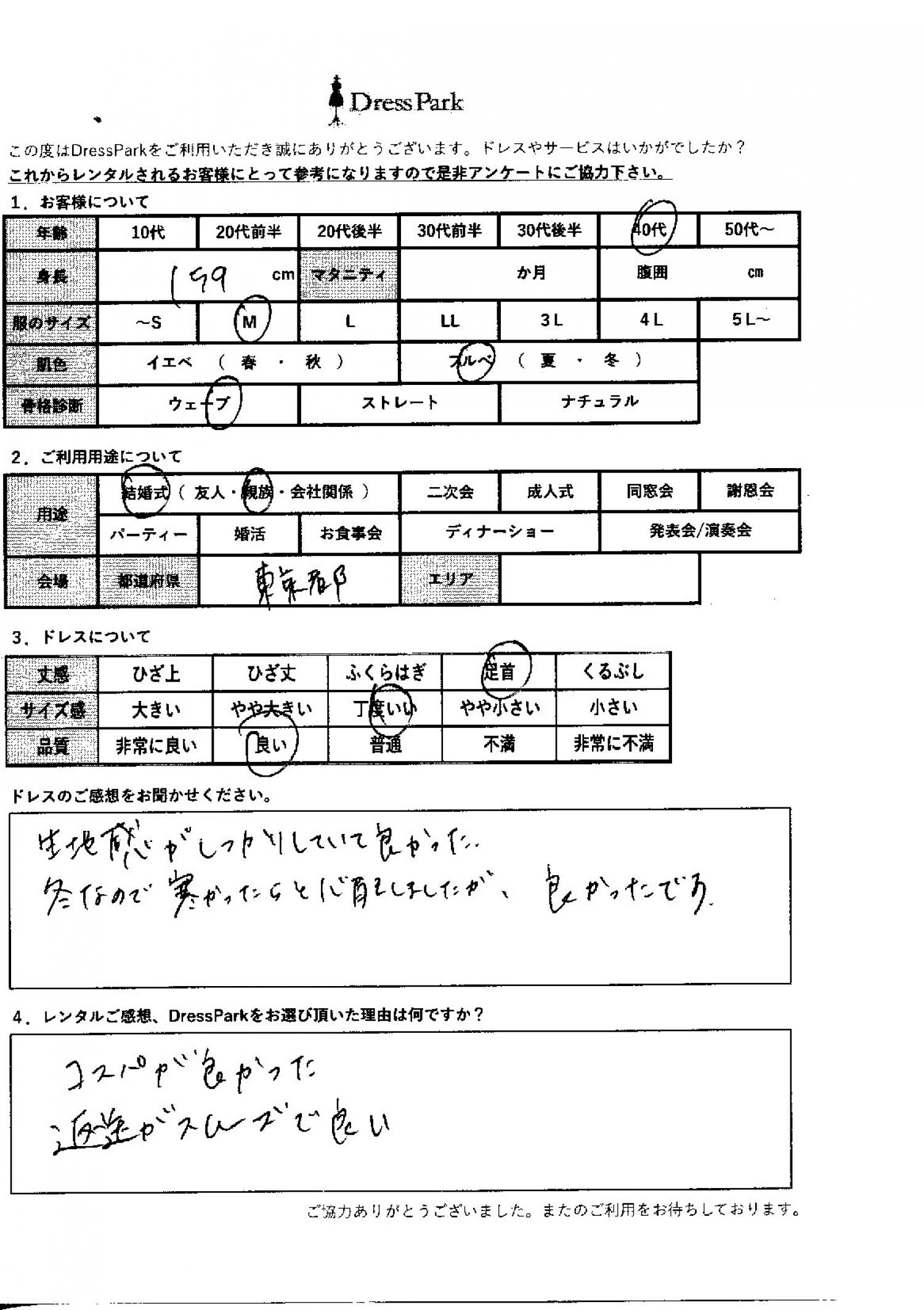 東京都 K.S様159㎝ Mサイズ #40代#M/L#155~159㎝#結婚式(親族)#東京都 ◆レンタルしたドレスはこちら ◆レンタルしたサイズは:M ◆レンタルした日付:2025/12/19 ドレスの着用感 ◆点数: (4点) ◆丈感:足首 ◆サイズ感:丁度いい ◆品質:良い ◆肌色:ブルべ ◆骨格診断:ウェーブ ドレスの感想 生地感がしっかりしていてよかった。冬なので寒かったらと心配しましたがよかったです。 レンタルのご感想、DressParkをお選び頂いた理由 コスパが良かった。返送がスムーズで良い。 CUSTOMER REVIEWS お客様の声 気になるカテゴリー別にご利用の感想をチェック! ◆AGE 年代で見る 10代 20代 30代 40代 50代~ ◆SIZE サイズで見る SS/S M/L 大きいサイズLL~ ◆HIGHT 身長で見る 140~149㎝ 150~154㎝ 155~159㎝ 160~164㎝ 165~169㎝ 170㎝以上 ◆マタニティ ~3か月 4~6か月 7~8か月 9~10か月 ◆肌色 イエベ ブルべ ◆骨格診断 ウェーブ ストレート ナチュラル ◆利用シーン 結婚式(友人) 結婚式(親族) 結婚式(会社関係) 二次会 成人式 謝恩会 パーティー その他 CUSTOMER REVIEWS都道府県別お客様の声 都道府県別にのお客様の声をチェック! 北海道 青森県 岩手県 宮城県 秋田県 山形県 福島県 茨城県 栃木県 群馬県 埼玉県 千葉県 東京都 神奈川県 新潟県 富山県 石川県 福井県 山梨県 長野県 岐阜県 静岡県 愛知県 三重県 滋賀県 京都府 大阪府 兵庫県 奈良県 和歌山県 鳥取県 島根県 岡山県 広島県 山口県 徳島県 香川県 愛媛県 高知県 福岡県 佐賀県 長崎県 熊本県 大分県 宮崎県 鹿児島県 沖縄県 CUSTOMER REVIEWSエリア別お客様の声 都道府県別にのお客様の声をチェック! 札幌 仙台 名古屋 軽井沢 金沢 神戸・芦屋 博多 那覇 梅田・新大阪 難波・心斎橋 鎌倉・湘南 横浜・みなとみらい 舞浜・浦安・幕張 大宮・浦和 青山・表参道 六本木・麻布 渋谷・恵比寿 新宿 池袋 銀座・丸の内 お台場・汐留 鹿児島市 郡山市 福島市 東予 甲府・石和 LINEでお問い合わせ このサイトではJavaScriptを使用しています