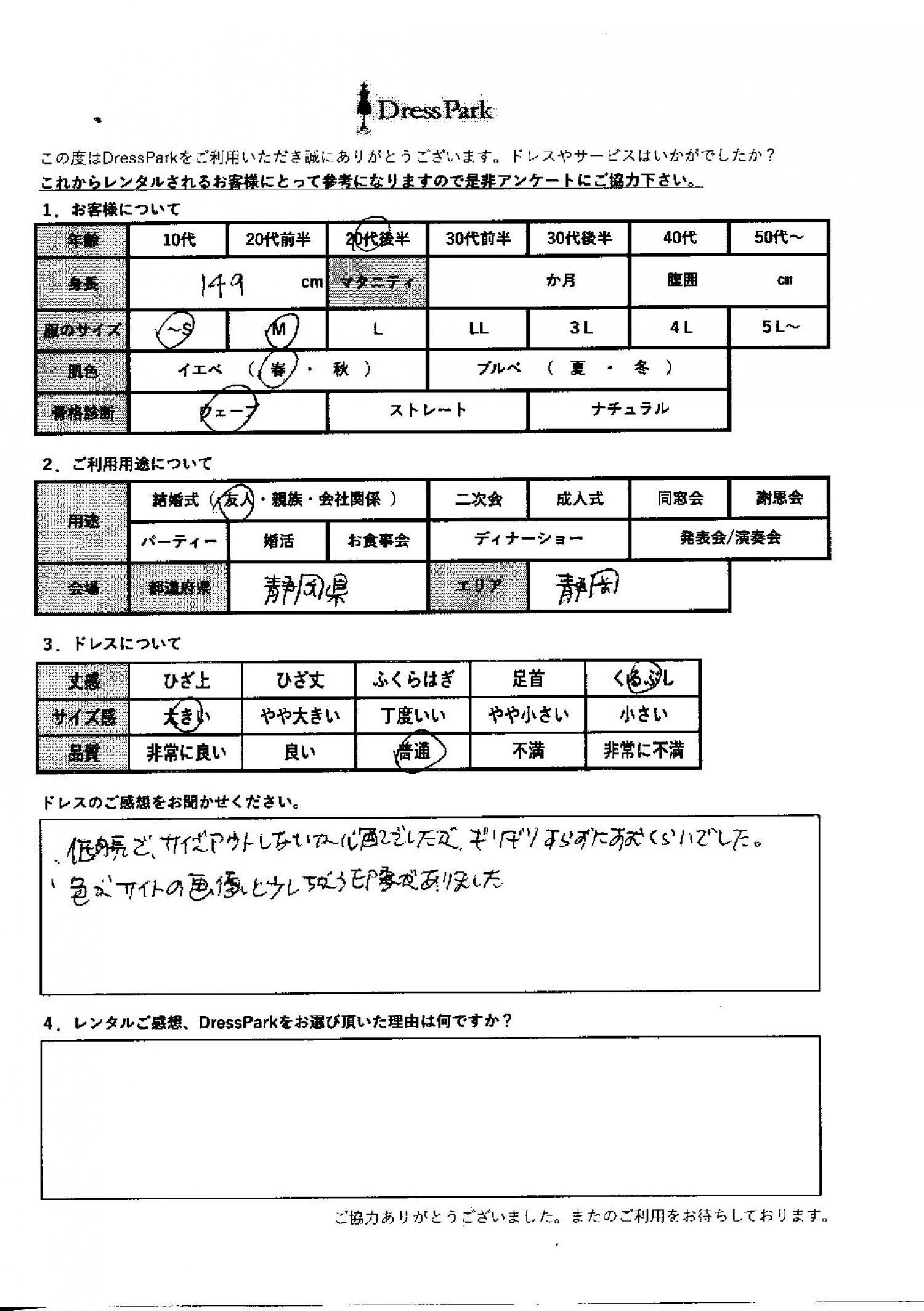 静岡県 S.M様149㎝ ~Sサイズ #20代#SS/S#140~149㎝#結婚式(友人)#静岡県 ◆レンタルしたドレスはこちら ◆レンタルしたサイズは:M ◆レンタルした日付:2025/12/20 ドレスの着用感 ◆点数: (3点) ◆丈感:くるぶし ◆サイズ感:大きい ◆品質:普通 ◆肌色:イエベ ◆骨格診断:ウェーブ ドレスの感想 低身長でサイズアウトしないか心配でしたが、ギリギリ擦らずに済む位でした。色がサイトの画像と少し違う印象がありました。 CUSTOMER REVIEWS お客様の声 気になるカテゴリー別にご利用の感想をチェック! ◆AGE 年代で見る 10代 20代 30代 40代 50代~ ◆SIZE サイズで見る SS/S M/L 大きいサイズLL~ ◆HIGHT 身長で見る 140~149㎝ 150~154㎝ 155~159㎝ 160~164㎝ 165~169㎝ 170㎝以上 ◆マタニティ ~3か月 4~6か月 7~8か月 9~10か月 ◆肌色 イエベ ブルべ ◆骨格診断 ウェーブ ストレート ナチュラル ◆利用シーン 結婚式(友人) 結婚式(親族) 結婚式(会社関係) 二次会 成人式 謝恩会 パーティー その他 CUSTOMER REVIEWS都道府県別お客様の声 都道府県別にのお客様の声をチェック! 北海道 青森県 岩手県 宮城県 秋田県 山形県 福島県 茨城県 栃木県 群馬県 埼玉県 千葉県 東京都 神奈川県 新潟県 富山県 石川県 福井県 山梨県 長野県 岐阜県 静岡県 愛知県 三重県 滋賀県 京都府 大阪府 兵庫県 奈良県 和歌山県 鳥取県 島根県 岡山県 広島県 山口県 徳島県 香川県 愛媛県 高知県 福岡県 佐賀県 長崎県 熊本県 大分県 宮崎県 鹿児島県 沖縄県 CUSTOMER REVIEWSエリア別お客様の声 都道府県別にのお客様の声をチェック! 札幌 仙台 名古屋 軽井沢 金沢 神戸・芦屋 博多 那覇 梅田・新大阪 難波・心斎橋 鎌倉・湘南 横浜・みなとみらい 舞浜・浦安・幕張 大宮・浦和 青山・表参道 六本木・麻布 渋谷・恵比寿 新宿 池袋 銀座・丸の内 お台場・汐留 鹿児島市 郡山市 福島市 東予 甲府・石和 LINEでお問い合わせ このサイトではJavaScriptを使用しています
