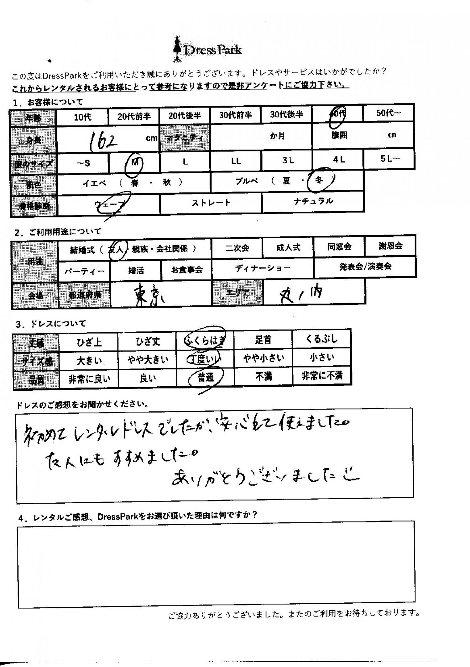 東京都 Y.M様162㎝ Mサイズ銀座・丸の内 #40代#M/L#160~164㎝#結婚式(友人)#東京都#銀座・丸の内 ◆レンタルしたドレスはこちら ◆レンタルしたサイズは:M ◆レンタルした日付:2025/12/20 ドレスの着用感 ◆点数: (4点) ◆丈感:ふくらはぎ ◆サイズ感:丁度いい ◆品質:普通 ◆肌色:ブルべ ◆骨格診断:ウェーブ ドレスの感想 初めてレンタルドレスでしたが、安心して使えました。友人にも勧めました。ありがとうございました。 CUSTOMER REVIEWS お客様の声 気になるカテゴリー別にご利用の感想をチェック! ◆AGE 年代で見る 10代 20代 30代 40代 50代~ ◆SIZE サイズで見る SS/S M/L 大きいサイズLL~ ◆HIGHT 身長で見る 140~149㎝ 150~154㎝ 155~159㎝ 160~164㎝ 165~169㎝ 170㎝以上 ◆マタニティ ~3か月 4~6か月 7~8か月 9~10か月 ◆肌色 イエベ ブルべ ◆骨格診断 ウェーブ ストレート ナチュラル ◆利用シーン 結婚式(友人) 結婚式(親族) 結婚式(会社関係) 二次会 成人式/同窓会 謝恩会 パーティー その他 CUSTOMER REVIEWS都道府県別お客様の声 都道府県別にのお客様の声をチェック! 北海道 青森県 岩手県 宮城県 秋田県 山形県 福島県 茨城県 栃木県 群馬県 埼玉県 千葉県 東京都 神奈川県 新潟県 富山県 石川県 福井県 山梨県 長野県 岐阜県 静岡県 愛知県 三重県 滋賀県 京都府 大阪府 兵庫県 奈良県 和歌山県 鳥取県 島根県 岡山県 広島県 山口県 徳島県 香川県 愛媛県 高知県 福岡県 佐賀県 長崎県 熊本県 大分県 宮崎県 鹿児島県 沖縄県 CUSTOMER REVIEWSエリア別お客様の声 都道府県別にのお客様の声をチェック! 札幌 仙台 名古屋 軽井沢 金沢 神戸・芦屋 博多 那覇 梅田・新大阪 難波・心斎橋 鎌倉・湘南 横浜・みなとみらい 舞浜・浦安・幕張 大宮・浦和 青山・表参道 六本木・麻布 渋谷・恵比寿 新宿 池袋 銀座・丸の内 お台場・汐留 鹿児島市 郡山市 福島市 東予 甲府・石和 LINEでお問い合わせ このサイトではJavaScriptを使用しています