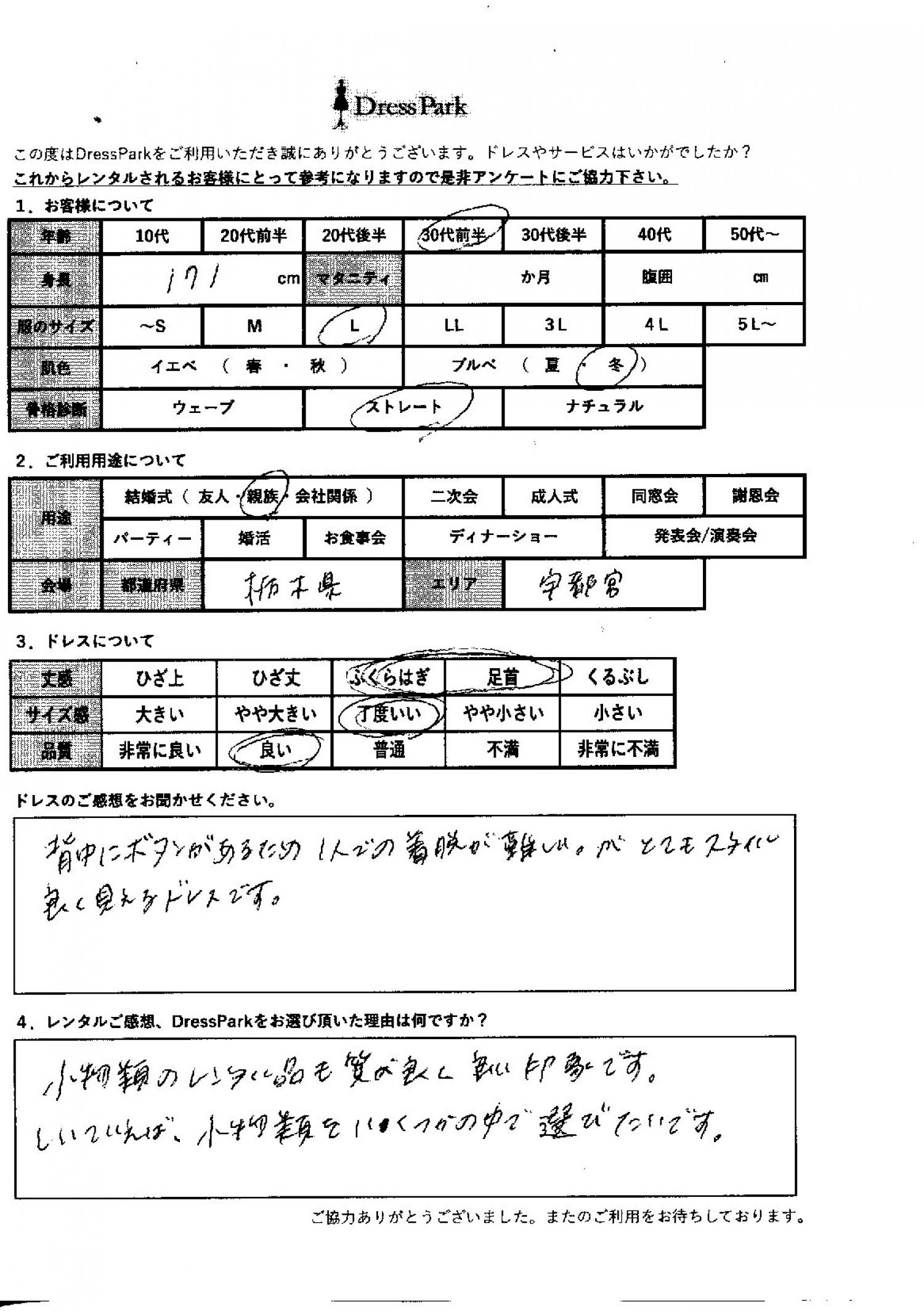 背中にボタンがあるため、1人での着脱が難しい。が、とてもスタイルがよく見えるドレスです。レンタルのご感想、