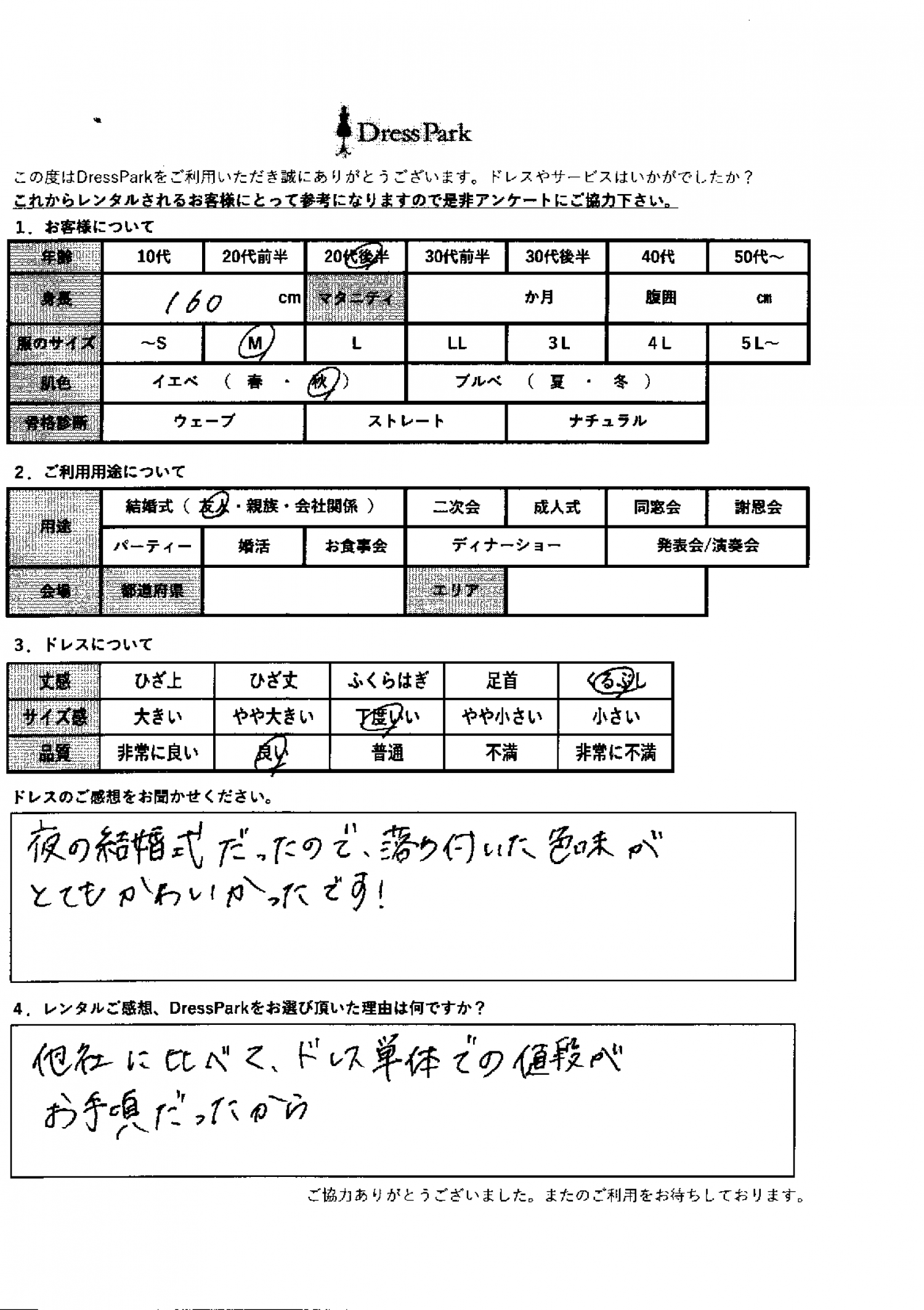 神奈川県 A.K様160㎝ Mサイズ #20代#M/L#160~164㎝#結婚式(友人)#神奈川県 ◆レンタルしたドレスはこちら ◆レンタルしたサイズは:M ◆レンタルした日付:2025/12/13 ドレスの着用感 ◆点数: (4点) ◆丈感:くるぶし ◆サイズ感:丁度いい ◆品質:良い ◆肌色:イエベ ドレスの感想 夜の結婚式だったので、落ち着いた色味がとても可愛かったです! レンタルのご感想、DressParkをお選び頂いた理由 他社に比べてドレス単体での値段がお手頃だったから。 CUSTOMER REVIEWS お客様の声 気になるカテゴリー別にご利用の感想をチェック! ◆AGE 年代で見る 10代 20代 30代 40代 50代~ ◆SIZE サイズで見る SS/S M/L 大きいサイズLL~ ◆HIGHT 身長で見る 140~149㎝ 150~154㎝ 155~159㎝ 160~164㎝ 165~169㎝ 170㎝以上 ◆マタニティ ~3か月 4~6か月 7~8か月 9~10か月 ◆肌色 イエベ ブルべ ◆骨格診断 ウェーブ ストレート ナチュラル ◆利用シーン 結婚式(友人) 結婚式(親族) 結婚式(会社関係) 二次会 成人式 謝恩会 パーティー その他 CUSTOMER REVIEWS都道府県別お客様の声 都道府県別にのお客様の声をチェック! 北海道 青森県 岩手県 宮城県 秋田県 山形県 福島県 茨城県 栃木県 群馬県 埼玉県 千葉県 東京都 神奈川県 新潟県 富山県 石川県 福井県 山梨県 長野県 岐阜県 静岡県 愛知県 三重県 滋賀県 京都府 大阪府 兵庫県 奈良県 和歌山県 鳥取県 島根県 岡山県 広島県 山口県 徳島県 香川県 愛媛県 高知県 福岡県 佐賀県 長崎県 熊本県 大分県 宮崎県 鹿児島県 沖縄県 CUSTOMER REVIEWSエリア別お客様の声 都道府県別にのお客様の声をチェック! 札幌 仙台 名古屋 軽井沢 金沢 神戸・芦屋 博多 那覇 梅田・新大阪 難波・心斎橋 鎌倉・湘南 横浜・みなとみらい 舞浜・浦安・幕張 大宮・浦和 青山・表参道 六本木・麻布 渋谷・恵比寿 新宿 池袋 銀座・丸の内 お台場・汐留 鹿児島市 郡山市 福島市 東予 甲府・石和 LINEでお問い合わせ このサイトではJavaScriptを使用しています