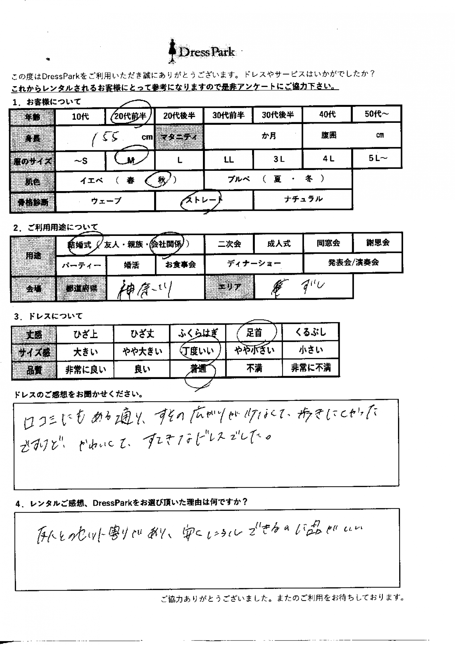 神奈川県 N.N様155㎝ Mサイズ鎌倉・湘南 #20代#M/L#155~159㎝#結婚式(会社関係)#神奈川県#鎌倉・湘南 ◆レンタルしたドレスはこちら ◆レンタルしたサイズは:M ◆レンタルした日付:2025/12/13 ドレスの着用感 ◆点数: (4点) ◆丈感:足首 ◆サイズ感:丁度いい ◆品質:普通 ◆肌色:イエベ ◆骨格診断:ストレート ドレスの感想 口コミにもある通り、裾の広がりが少なくて歩きにくかったですけど、可愛くて素敵なドレスでした。 レンタルのご感想、DressParkをお選び頂いた理由 友人とのセット割りであり、安くレンタルできるのに品が良い。 CUSTOMER REVIEWS お客様の声 気になるカテゴリー別にご利用の感想をチェック! ◆AGE 年代で見る 10代 20代 30代 40代 50代~ ◆SIZE サイズで見る SS/S M/L 大きいサイズLL~ ◆HIGHT 身長で見る 140~149㎝ 150~154㎝ 155~159㎝ 160~164㎝ 165~169㎝ 170㎝以上 ◆マタニティ ~3か月 4~6か月 7~8か月 9~10か月 ◆肌色 イエベ ブルべ ◆骨格診断 ウェーブ ストレート ナチュラル ◆利用シーン 結婚式(友人) 結婚式(親族) 結婚式(会社関係) 二次会 成人式 謝恩会 パーティー その他 CUSTOMER REVIEWS都道府県別お客様の声 都道府県別にのお客様の声をチェック! 北海道 青森県 岩手県 宮城県 秋田県 山形県 福島県 茨城県 栃木県 群馬県 埼玉県 千葉県 東京都 神奈川県 新潟県 富山県 石川県 福井県 山梨県 長野県 岐阜県 静岡県 愛知県 三重県 滋賀県 京都府 大阪府 兵庫県 奈良県 和歌山県 鳥取県 島根県 岡山県 広島県 山口県 徳島県 香川県 愛媛県 高知県 福岡県 佐賀県 長崎県 熊本県 大分県 宮崎県 鹿児島県 沖縄県 CUSTOMER REVIEWSエリア別お客様の声 都道府県別にのお客様の声をチェック! 札幌 仙台 名古屋 軽井沢 金沢 神戸・芦屋 博多 那覇 梅田・新大阪 難波・心斎橋 鎌倉・湘南 横浜・みなとみらい 舞浜・浦安・幕張 大宮・浦和 青山・表参道 六本木・麻布 渋谷・恵比寿 新宿 池袋 銀座・丸の内 お台場・汐留 鹿児島市 郡山市 福島市 東予 甲府・石和 LINEでお問い合わせ このサイトではJavaScriptを使用しています