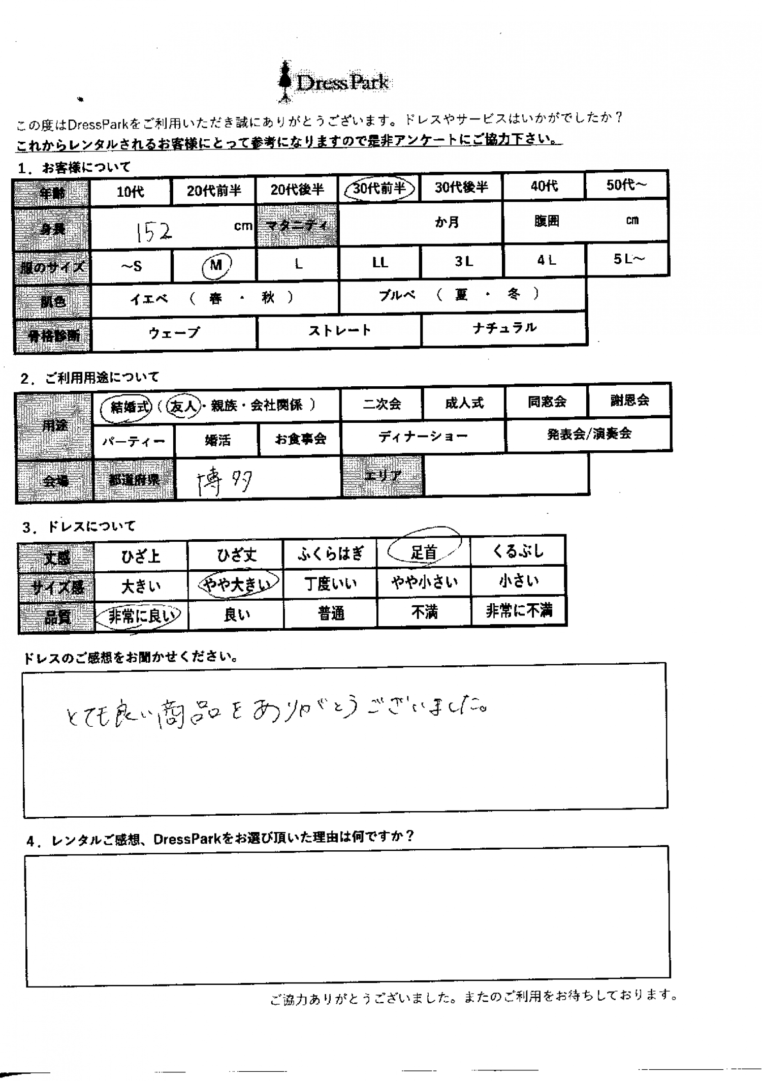 福岡県 A.T様152㎝ Mサイズ博多 #30代#M/L#150~154㎝#結婚式(友人)#福岡県#博多 ◆レンタルしたドレスはこちら ◆レンタルしたサイズは:M ◆レンタルした日付:2025/12/14 ドレスの着用感 ◆点数: (5点) ◆丈感:足首 ◆サイズ感:やや大きい ◆品質:非常に良い ドレスの感想 とても良い商品をありがとうございました。 CUSTOMER REVIEWS お客様の声 気になるカテゴリー別にご利用の感想をチェック! ◆AGE 年代で見る 10代 20代 30代 40代 50代~ ◆SIZE サイズで見る SS/S M/L 大きいサイズLL~ ◆HIGHT 身長で見る 140~149㎝ 150~154㎝ 155~159㎝ 160~164㎝ 165~169㎝ 170㎝以上 ◆マタニティ ~3か月 4~6か月 7~8か月 9~10か月 ◆肌色 イエベ ブルべ ◆骨格診断 ウェーブ ストレート ナチュラル ◆利用シーン 結婚式(友人) 結婚式(親族) 結婚式(会社関係) 二次会 成人式/同窓会 謝恩会 パーティー その他 CUSTOMER REVIEWS都道府県別お客様の声 都道府県別にのお客様の声をチェック! 北海道 青森県 岩手県 宮城県 秋田県 山形県 福島県 茨城県 栃木県 群馬県 埼玉県 千葉県 東京都 神奈川県 新潟県 富山県 石川県 福井県 山梨県 長野県 岐阜県 静岡県 愛知県 三重県 滋賀県 京都府 大阪府 兵庫県 奈良県 和歌山県 鳥取県 島根県 岡山県 広島県 山口県 徳島県 香川県 愛媛県 高知県 福岡県 佐賀県 長崎県 熊本県 大分県 宮崎県 鹿児島県 沖縄県 CUSTOMER REVIEWSエリア別お客様の声 都道府県別にのお客様の声をチェック! 札幌 仙台 名古屋 軽井沢 金沢 神戸・芦屋 博多 那覇 梅田・新大阪 難波・心斎橋 鎌倉・湘南 横浜・みなとみらい 舞浜・浦安・幕張 大宮・浦和 青山・表参道 六本木・麻布 渋谷・恵比寿 新宿 池袋 銀座・丸の内 お台場・汐留 鹿児島市 郡山市 福島市 東予 甲府・石和 LINEでお問い合わせ このサイトではJavaScriptを使用しています