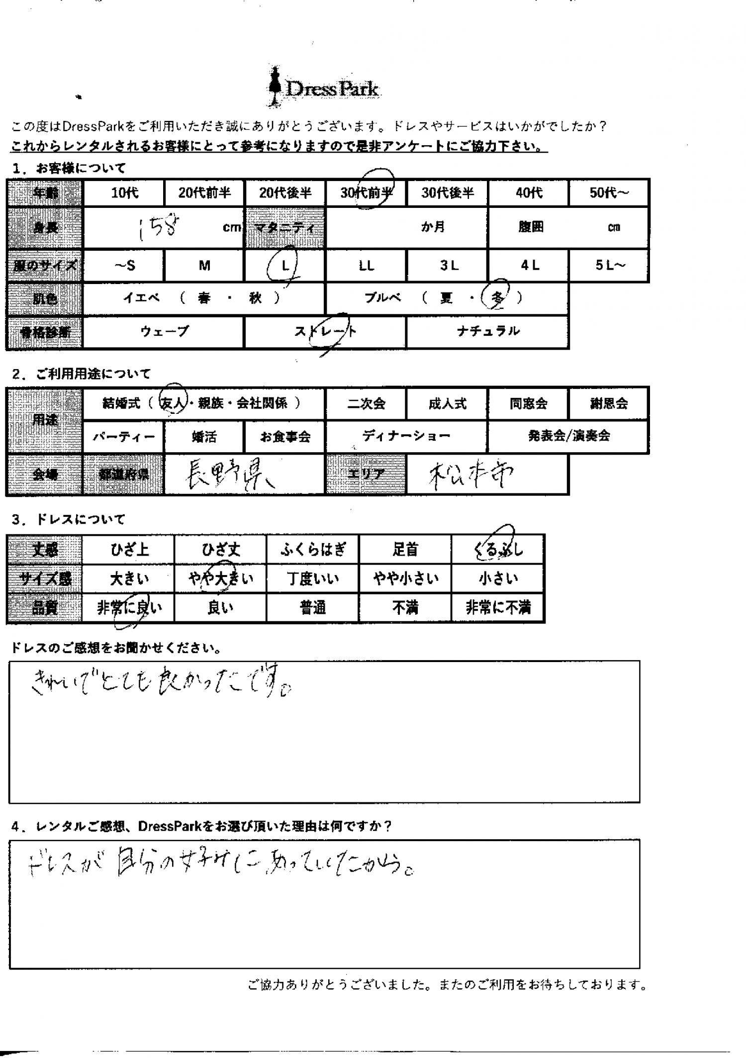 長野県 M.K様158㎝ Lサイズ #30代#M/L#155~159㎝#結婚式(友人)#長野県 ◆レンタルしたドレスはこちら ◆レンタルしたサイズは:L ◆レンタルした日付:2025/12/20 ドレスの着用感 ◆点数: (5点) ◆丈感:くるぶし ◆サイズ感:やや大きい ◆品質:非常に良い ◆肌色:ブルべ ◆骨格診断:ストレート ドレスの感想 綺麗でとても良かったです。 レンタルのご感想、DressParkをお選び頂いた理由 ドレスが自分の好みに合っていたから。 CUSTOMER REVIEWS お客様の声 気になるカテゴリー別にご利用の感想をチェック! ◆AGE 年代で見る 10代 20代 30代 40代 50代~ ◆SIZE サイズで見る SS/S M/L 大きいサイズLL~ ◆HIGHT 身長で見る 140~149㎝ 150~154㎝ 155~159㎝ 160~164㎝ 165~169㎝ 170㎝以上 ◆マタニティ ~3か月 4~6か月 7~8か月 9~10か月 ◆肌色 イエベ ブルべ ◆骨格診断 ウェーブ ストレート ナチュラル ◆利用シーン 結婚式(友人) 結婚式(親族) 結婚式(会社関係) 二次会 成人式/同窓会 謝恩会 パーティー その他 CUSTOMER REVIEWS都道府県別お客様の声 都道府県別にのお客様の声をチェック! 北海道 青森県 岩手県 宮城県 秋田県 山形県 福島県 茨城県 栃木県 群馬県 埼玉県 千葉県 東京都 神奈川県 新潟県 富山県 石川県 福井県 山梨県 長野県 岐阜県 静岡県 愛知県 三重県 滋賀県 京都府 大阪府 兵庫県 奈良県 和歌山県 鳥取県 島根県 岡山県 広島県 山口県 徳島県 香川県 愛媛県 高知県 福岡県 佐賀県 長崎県 熊本県 大分県 宮崎県 鹿児島県 沖縄県 CUSTOMER REVIEWSエリア別お客様の声 都道府県別にのお客様の声をチェック! 札幌 仙台 名古屋 軽井沢 金沢 神戸・芦屋 博多 那覇 梅田・新大阪 難波・心斎橋 鎌倉・湘南 横浜・みなとみらい 舞浜・浦安・幕張 大宮・浦和 青山・表参道 六本木・麻布 渋谷・恵比寿 新宿 池袋 銀座・丸の内 お台場・汐留 鹿児島市 郡山市 福島市 東予 甲府・石和 LINEでお問い合わせ このサイトではJavaScriptを使用しています