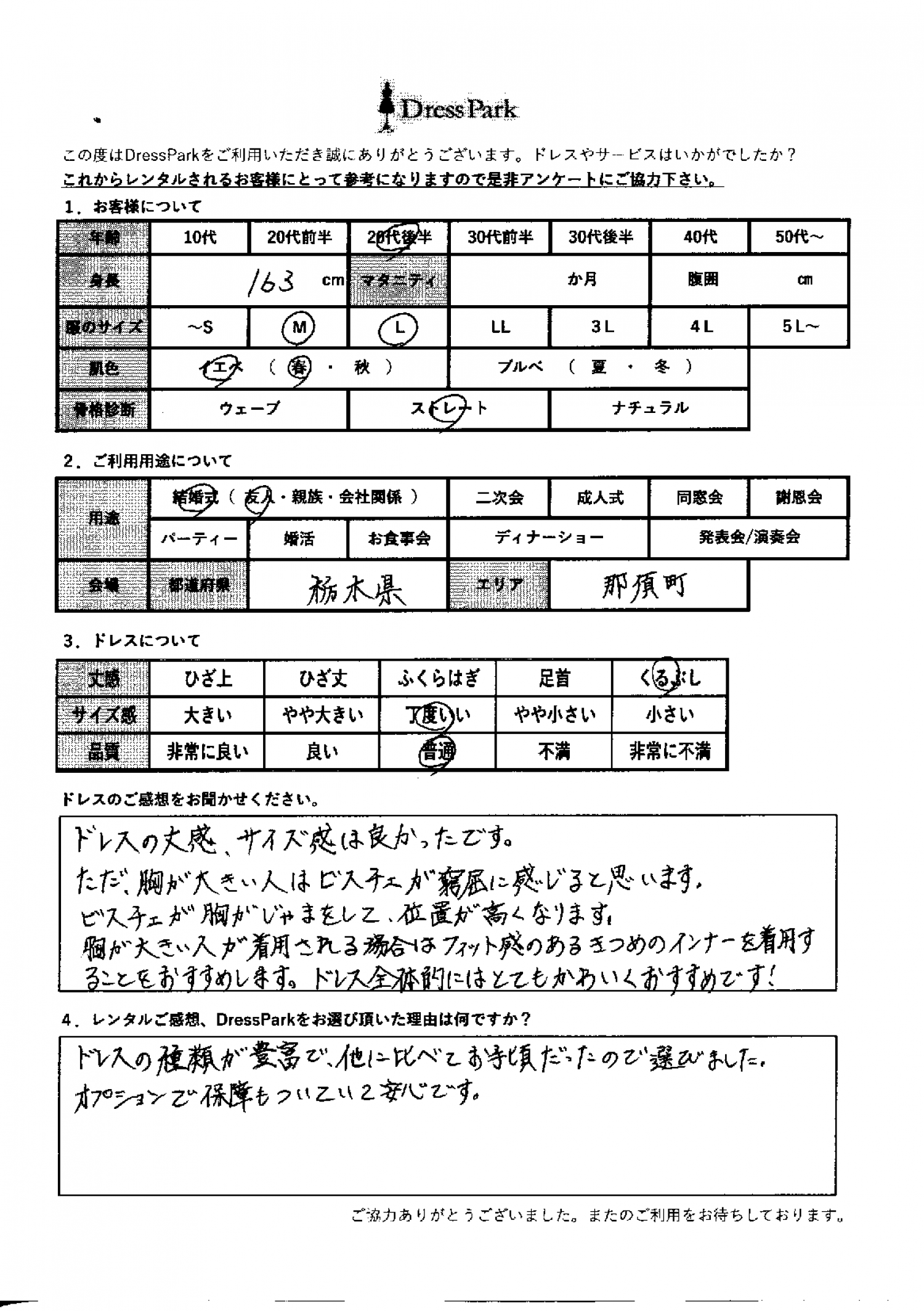 栃木県 M.S様163㎝ Mサイズ #20代#M/L#160~164㎝#結婚式(友人)#栃木県 ◆レンタルしたドレスはこちら ◆レンタルしたサイズは:L ◆レンタルした日付:2025/12/20 ドレスの着用感 ◆点数: (4点) ◆丈感:くるぶし ◆サイズ感:丁度いい ◆品質:普通 ◆肌色:イエベ ◆骨格診断:ストレート ドレスの感想 ドレスの丈感、サイズは良かったです。ただ、胸が大きい人はビスチェが窮屈に感じると思います。ビスチェが胸が邪魔をして位置が高くなります。胸が大きい人が着用される場合は、フィット感のあるきつめのインナーを着用することをお勧めします。全体的にはとても可愛くお勧めです! レンタルのご感想、DressParkをお選び頂いた理由 ドレスの種類が豊富で、他に比べてお手頃だったので、選びました。オプションで保証もついていて安心です。 CUSTOMER REVIEWS お客様の声 気になるカテゴリー別にご利用の感想をチェック! ◆AGE 年代で見る 10代 20代 30代 40代 50代~ ◆SIZE サイズで見る SS/S M/L 大きいサイズLL~ ◆HIGHT 身長で見る 140~149㎝ 150~154㎝ 155~159㎝ 160~164㎝ 165~169㎝ 170㎝以上 ◆マタニティ ~3か月 4~6か月 7~8か月 9~10か月 ◆肌色 イエベ ブルべ ◆骨格診断 ウェーブ ストレート ナチュラル ◆利用シーン 結婚式(友人) 結婚式(親族) 結婚式(会社関係) 二次会 成人式 謝恩会 パーティー その他 CUSTOMER REVIEWS都道府県別お客様の声 都道府県別にのお客様の声をチェック! 北海道 青森県 岩手県 宮城県 秋田県 山形県 福島県 茨城県 栃木県 群馬県 埼玉県 千葉県 東京都 神奈川県 新潟県 富山県 石川県 福井県 山梨県 長野県 岐阜県 静岡県 愛知県 三重県 滋賀県 京都府 大阪府 兵庫県 奈良県 和歌山県 鳥取県 島根県 岡山県 広島県 山口県 徳島県 香川県 愛媛県 高知県 福岡県 佐賀県 長崎県 熊本県 大分県 宮崎県 鹿児島県 沖縄県 CUSTOMER REVIEWSエリア別お客様の声 都道府県別にのお客様の声をチェック! 札幌 仙台 名古屋 軽井沢 金沢 神戸・芦屋 博多 那覇 梅田・新大阪 難波・心斎橋 鎌倉・湘南 横浜・みなとみらい 舞浜・浦安・幕張 大宮・浦和 青山・表参道 六本木・麻布 渋谷・恵比寿 新宿 池袋 銀座・丸の内 お台場・汐留 鹿児島市 郡山市 福島市 東予 甲府・石和 LINEでお問い合わせ このサイトではJavaScriptを使用しています