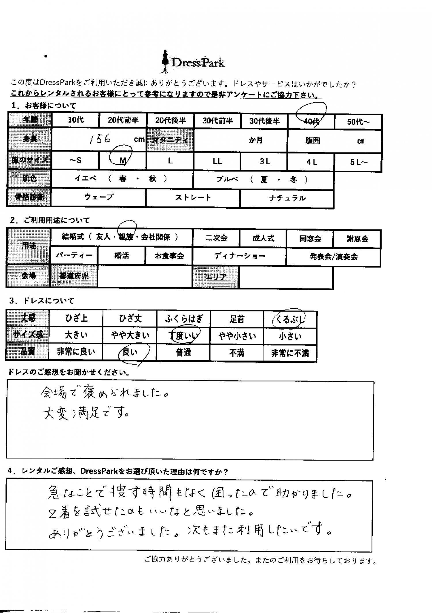 埼玉県 Y.H様156㎝ Mサイズ #40代#M/L#155~159㎝#結婚式(親族)#埼玉県 ◆レンタルしたドレスはこちら ◆レンタルしたサイズは:M ◆レンタルした日付:2025/12/20 ドレスの着用感 ◆点数: (4点) ◆丈感:くるぶし ◆サイズ感:丁度いい ◆品質:良い ドレスの感想 会場で褒められました。大変満足です。 レンタルのご感想、DressParkをお選び頂いた理由 急なことで探す時間もなく困ったので助かりました。2着を試せたのもいいなと思いました。ありがとうございました。次もまた利用したいです。 CUSTOMER REVIEWS お客様の声 気になるカテゴリー別にご利用の感想をチェック! ◆AGE 年代で見る 10代 20代 30代 40代 50代~ ◆SIZE サイズで見る SS/S M/L 大きいサイズLL~ ◆HIGHT 身長で見る 140~149㎝ 150~154㎝ 155~159㎝ 160~164㎝ 165~169㎝ 170㎝以上 ◆マタニティ ~3か月 4~6か月 7~8か月 9~10か月 ◆肌色 イエベ ブルべ ◆骨格診断 ウェーブ ストレート ナチュラル ◆利用シーン 結婚式(友人) 結婚式(親族) 結婚式(会社関係) 二次会 成人式/同窓会 謝恩会 パーティー その他 CUSTOMER REVIEWS都道府県別お客様の声 都道府県別にのお客様の声をチェック! 北海道 青森県 岩手県 宮城県 秋田県 山形県 福島県 茨城県 栃木県 群馬県 埼玉県 千葉県 東京都 神奈川県 新潟県 富山県 石川県 福井県 山梨県 長野県 岐阜県 静岡県 愛知県 三重県 滋賀県 京都府 大阪府 兵庫県 奈良県 和歌山県 鳥取県 島根県 岡山県 広島県 山口県 徳島県 香川県 愛媛県 高知県 福岡県 佐賀県 長崎県 熊本県 大分県 宮崎県 鹿児島県 沖縄県 CUSTOMER REVIEWSエリア別お客様の声 都道府県別にのお客様の声をチェック! 札幌 仙台 名古屋 軽井沢 金沢 神戸・芦屋 博多 那覇 梅田・新大阪 難波・心斎橋 鎌倉・湘南 横浜・みなとみらい 舞浜・浦安・幕張 大宮・浦和 青山・表参道 六本木・麻布 渋谷・恵比寿 新宿 池袋 銀座・丸の内 お台場・汐留 鹿児島市 郡山市 福島市 東予 甲府・石和 LINEでお問い合わせ このサイトではJavaScriptを使用しています