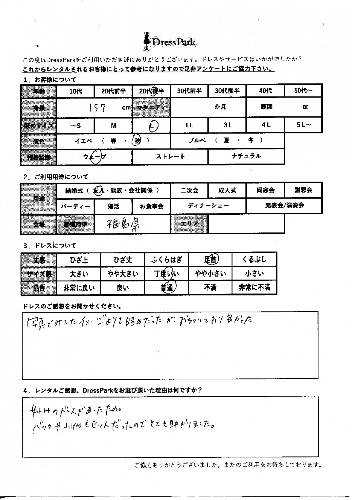 福島県 Y.S様157㎝ Lサイズ #20代#M/L#155~159㎝#結婚式(友人)#福島県 ◆レンタルしたドレスはこちら ◆レンタルしたサイズは:L ◆レンタルした日付:2025/12/20 ドレスの着用感 ◆点数: (4点) ◆丈感:足首 ◆サイズ感:丁度いい ◆品質:普通 ◆肌色:イエベ ◆骨格診断:ウェーブ ドレスの感想 写真で見たイメージよりも暗めだったのが、落ち着いており良かった。 レンタルのご感想、DressParkをお選び頂いた理由 好みのドレスがあったため。バッグや小物もセットだったので、とても助かりました。 CUSTOMER REVIEWS お客様の声 気になるカテゴリー別にご利用の感想をチェック! ◆AGE 年代で見る 10代 20代 30代 40代 50代~ ◆SIZE サイズで見る SS/S M/L 大きいサイズLL~ ◆HIGHT 身長で見る 140~149㎝ 150~154㎝ 155~159㎝ 160~164㎝ 165~169㎝ 170㎝以上 ◆マタニティ ~3か月 4~6か月 7~8か月 9~10か月 ◆肌色 イエベ ブルべ ◆骨格診断 ウェーブ ストレート ナチュラル ◆利用シーン 結婚式(友人) 結婚式(親族) 結婚式(会社関係) 二次会 成人式 謝恩会 パーティー その他 CUSTOMER REVIEWS都道府県別お客様の声 都道府県別にのお客様の声をチェック! 北海道 青森県 岩手県 宮城県 秋田県 山形県 福島県 茨城県 栃木県 群馬県 埼玉県 千葉県 東京都 神奈川県 新潟県 富山県 石川県 福井県 山梨県 長野県 岐阜県 静岡県 愛知県 三重県 滋賀県 京都府 大阪府 兵庫県 奈良県 和歌山県 鳥取県 島根県 岡山県 広島県 山口県 徳島県 香川県 愛媛県 高知県 福岡県 佐賀県 長崎県 熊本県 大分県 宮崎県 鹿児島県 沖縄県 CUSTOMER REVIEWSエリア別お客様の声 都道府県別にのお客様の声をチェック! 札幌 仙台 名古屋 軽井沢 金沢 神戸・芦屋 博多 那覇 梅田・新大阪 難波・心斎橋 鎌倉・湘南 横浜・みなとみらい 舞浜・浦安・幕張 大宮・浦和 青山・表参道 六本木・麻布 渋谷・恵比寿 新宿 池袋 銀座・丸の内 お台場・汐留 鹿児島市 郡山市 福島市 東予 甲府・石和 LINEでお問い合わせ このサイトではJavaScriptを使用しています