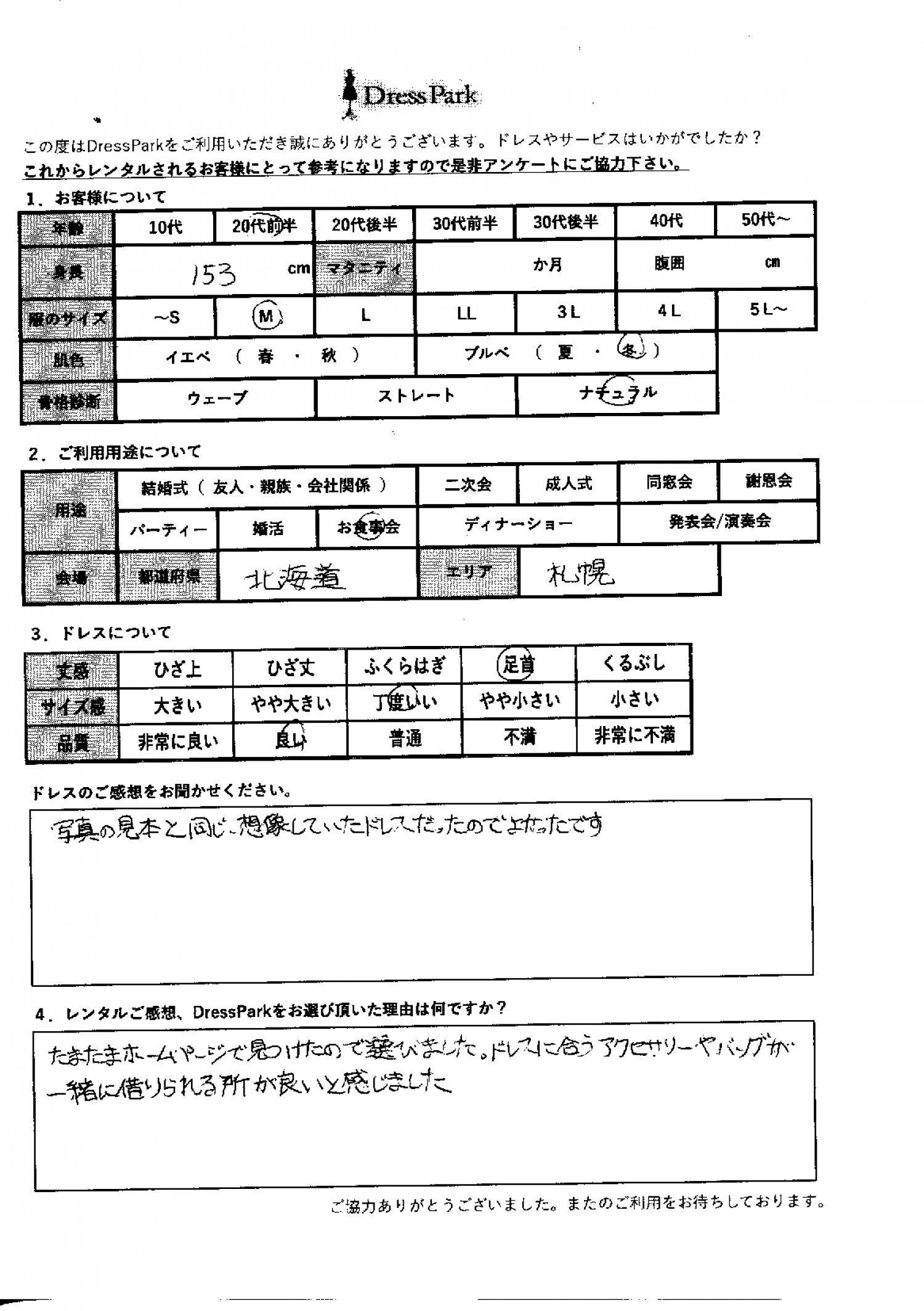 北海道 E.H様153㎝ Mサイズ札幌 #20代#M/L#150~154㎝#その他#北海道#札幌 ◆レンタルしたドレスはこちら ◆レンタルしたサイズは:M ◆レンタルした日付:2025/12/19 ドレスの着用感 ◆点数: (4点) ◆丈感:足首 ◆サイズ感:丁度いい ◆品質:良い ◆肌色:ブルべ ◆骨格診断:ナチュラル ドレスの感想 写真の見本と同じ、想像していたドレスだったのでよかったです。 レンタルのご感想、DressParkをお選び頂いた理由 たまたまホームページで見つけたので選びました。ドレスに合うアクセサリーやバックが一緒に借りられるところが良いと感じました。 CUSTOMER REVIEWS お客様の声 気になるカテゴリー別にご利用の感想をチェック! ◆AGE 年代で見る 10代 20代 30代 40代 50代~ ◆SIZE サイズで見る SS/S M/L 大きいサイズLL~ ◆HIGHT 身長で見る 140~149㎝ 150~154㎝ 155~159㎝ 160~164㎝ 165~169㎝ 170㎝以上 ◆マタニティ ~3か月 4~6か月 7~8か月 9~10か月 ◆肌色 イエベ ブルべ ◆骨格診断 ウェーブ ストレート ナチュラル ◆利用シーン 結婚式(友人) 結婚式(親族) 結婚式(会社関係) 二次会 成人式 謝恩会 パーティー その他 CUSTOMER REVIEWS都道府県別お客様の声 都道府県別にのお客様の声をチェック! 北海道 青森県 岩手県 宮城県 秋田県 山形県 福島県 茨城県 栃木県 群馬県 埼玉県 千葉県 東京都 神奈川県 新潟県 富山県 石川県 福井県 山梨県 長野県 岐阜県 静岡県 愛知県 三重県 滋賀県 京都府 大阪府 兵庫県 奈良県 和歌山県 鳥取県 島根県 岡山県 広島県 山口県 徳島県 香川県 愛媛県 高知県 福岡県 佐賀県 長崎県 熊本県 大分県 宮崎県 鹿児島県 沖縄県 CUSTOMER REVIEWSエリア別お客様の声 都道府県別にのお客様の声をチェック! 札幌 仙台 名古屋 軽井沢 金沢 神戸・芦屋 博多 那覇 梅田・新大阪 難波・心斎橋 鎌倉・湘南 横浜・みなとみらい 舞浜・浦安・幕張 大宮・浦和 青山・表参道 六本木・麻布 渋谷・恵比寿 新宿 池袋 銀座・丸の内 お台場・汐留 鹿児島市 郡山市 福島市 東予 甲府・石和 LINEでお問い合わせ このサイトではJavaScriptを使用しています