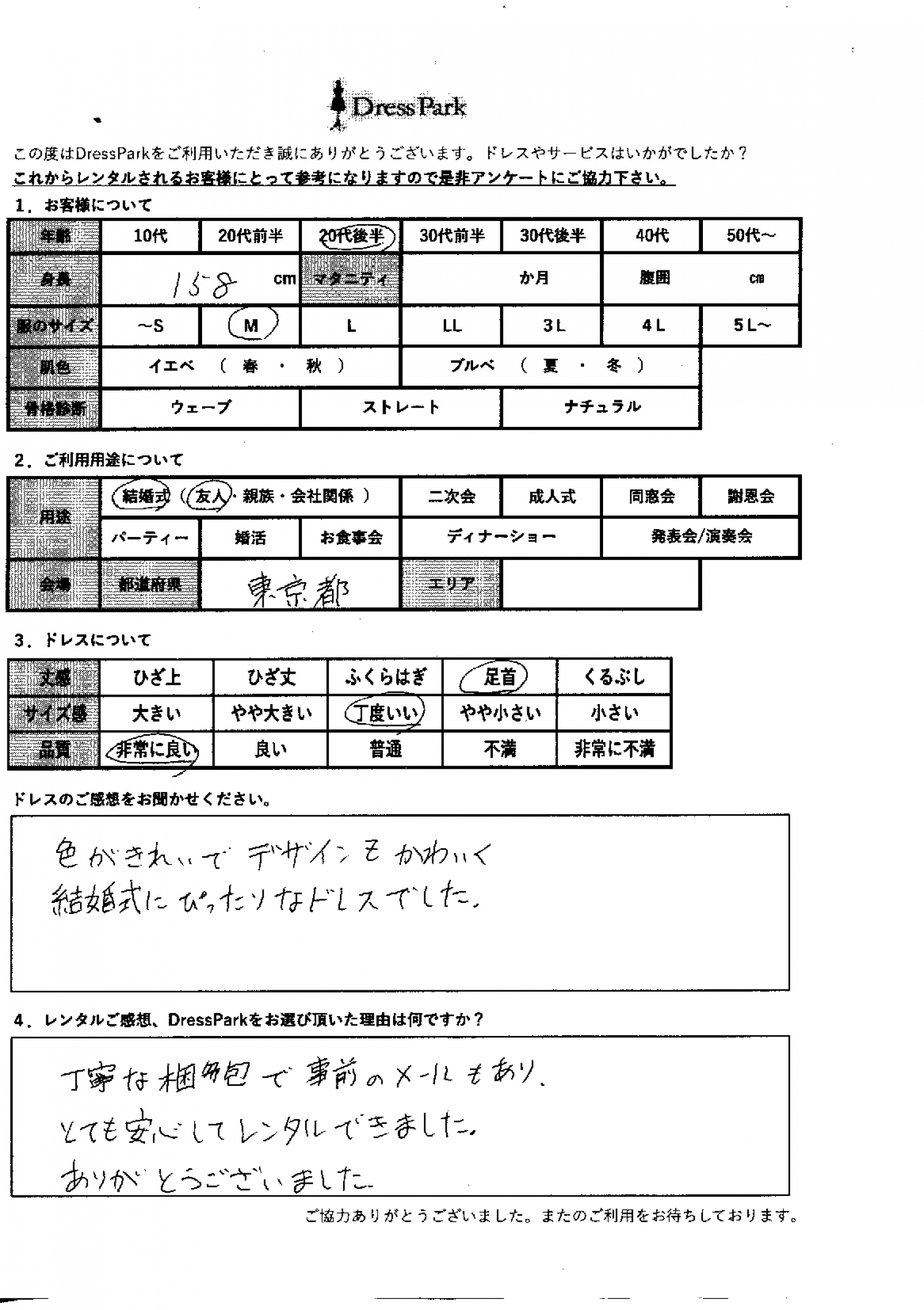 東京都 A.H様158㎝ Mサイズ #20代#M/L#155~159㎝#結婚式(友人)#東京都 ◆レンタルしたドレスはこちら ◆レンタルしたサイズは:M ◆レンタルした日付:2025/12/20 ドレスの着用感 ◆点数: (5点) ◆丈感:足首 ◆サイズ感:丁度いい ◆品質:非常に良い ドレスの感想 色が綺麗で、デザインも可愛く結婚式にぴったりなドレスでした。 レンタルのご感想、DressParkをお選び頂いた理由 丁寧な梱包で事前のメールもあり、とても安心してレンタルできました。ありがとうございました。 CUSTOMER REVIEWS お客様の声 気になるカテゴリー別にご利用の感想をチェック! ◆AGE 年代で見る 10代 20代 30代 40代 50代~ ◆SIZE サイズで見る SS/S M/L 大きいサイズLL~ ◆HIGHT 身長で見る 140~149㎝ 150~154㎝ 155~159㎝ 160~164㎝ 165~169㎝ 170㎝以上 ◆マタニティ ~3か月 4~6か月 7~8か月 9~10か月 ◆肌色 イエベ ブルべ ◆骨格診断 ウェーブ ストレート ナチュラル ◆利用シーン 結婚式(友人) 結婚式(親族) 結婚式(会社関係) 二次会 成人式 謝恩会 パーティー その他 CUSTOMER REVIEWS都道府県別お客様の声 都道府県別にのお客様の声をチェック! 北海道 青森県 岩手県 宮城県 秋田県 山形県 福島県 茨城県 栃木県 群馬県 埼玉県 千葉県 東京都 神奈川県 新潟県 富山県 石川県 福井県 山梨県 長野県 岐阜県 静岡県 愛知県 三重県 滋賀県 京都府 大阪府 兵庫県 奈良県 和歌山県 鳥取県 島根県 岡山県 広島県 山口県 徳島県 香川県 愛媛県 高知県 福岡県 佐賀県 長崎県 熊本県 大分県 宮崎県 鹿児島県 沖縄県 CUSTOMER REVIEWSエリア別お客様の声 都道府県別にのお客様の声をチェック! 札幌 仙台 名古屋 軽井沢 金沢 神戸・芦屋 博多 那覇 梅田・新大阪 難波・心斎橋 鎌倉・湘南 横浜・みなとみらい 舞浜・浦安・幕張 大宮・浦和 青山・表参道 六本木・麻布 渋谷・恵比寿 新宿 池袋 銀座・丸の内 お台場・汐留 鹿児島市 郡山市 福島市 東予 甲府・石和 LINEでお問い合わせ このサイトではJavaScriptを使用しています