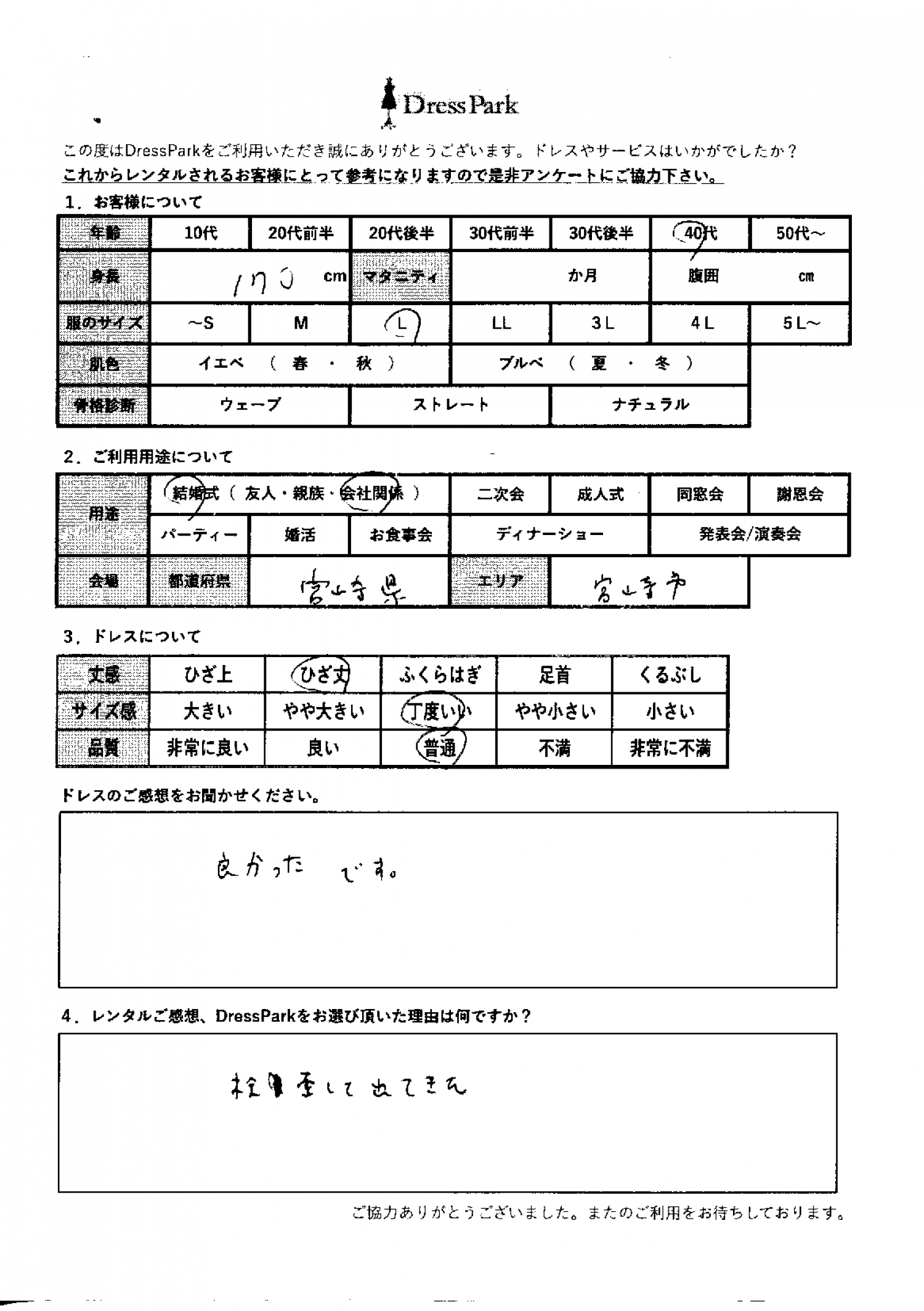 宮崎県 A.U様170㎝ Lサイズ #40代#M/L#170㎝以上#結婚式(会社関係)#宮崎県 ◆レンタルしたドレスはこちら ◆レンタルしたサイズは:L ◆レンタルした日付:2025/12/21 ドレスの着用感 ◆点数: (4点) ◆丈感:ひざ丈 ◆サイズ感:丁度いい ◆品質:普通 ドレスの感想 よかったです。 レンタルのご感想、DressParkをお選び頂いた理由 検索して出てきた。 CUSTOMER REVIEWS お客様の声 気になるカテゴリー別にご利用の感想をチェック! ◆AGE 年代で見る 10代 20代 30代 40代 50代~ ◆SIZE サイズで見る SS/S M/L 大きいサイズLL~ ◆HIGHT 身長で見る 140~149㎝ 150~154㎝ 155~159㎝ 160~164㎝ 165~169㎝ 170㎝以上 ◆マタニティ ~3か月 4~6か月 7~8か月 9~10か月 ◆肌色 イエベ ブルべ ◆骨格診断 ウェーブ ストレート ナチュラル ◆利用シーン 結婚式(友人) 結婚式(親族) 結婚式(会社関係) 二次会 成人式/同窓会 謝恩会 パーティー その他 CUSTOMER REVIEWS都道府県別お客様の声 都道府県別にのお客様の声をチェック! 北海道 青森県 岩手県 宮城県 秋田県 山形県 福島県 茨城県 栃木県 群馬県 埼玉県 千葉県 東京都 神奈川県 新潟県 富山県 石川県 福井県 山梨県 長野県 岐阜県 静岡県 愛知県 三重県 滋賀県 京都府 大阪府 兵庫県 奈良県 和歌山県 鳥取県 島根県 岡山県 広島県 山口県 徳島県 香川県 愛媛県 高知県 福岡県 佐賀県 長崎県 熊本県 大分県 宮崎県 鹿児島県 沖縄県 CUSTOMER REVIEWSエリア別お客様の声 都道府県別にのお客様の声をチェック! 札幌 仙台 名古屋 軽井沢 金沢 神戸・芦屋 博多 那覇 梅田・新大阪 難波・心斎橋 鎌倉・湘南 横浜・みなとみらい 舞浜・浦安・幕張 大宮・浦和 青山・表参道 六本木・麻布 渋谷・恵比寿 新宿 池袋 銀座・丸の内 お台場・汐留 鹿児島市 郡山市 福島市 東予 甲府・石和 LINEでお問い合わせ このサイトではJavaScriptを使用しています