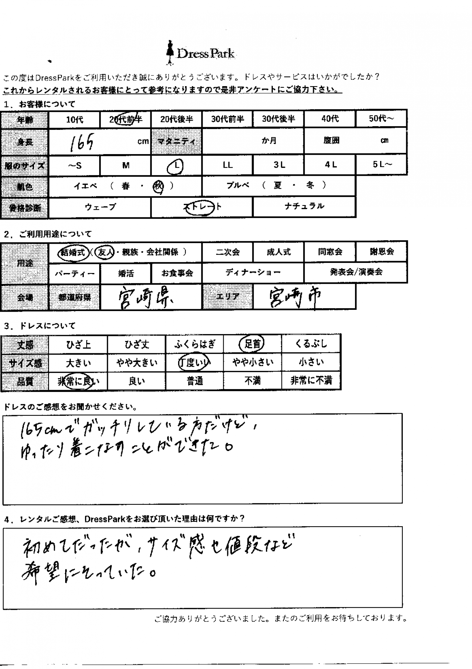 宮崎県 C.T様165㎝ Lサイズ #20代#M/L#165~169㎝#結婚式(友人)#宮崎県 ◆レンタルしたドレスはこちら ◆レンタルしたサイズは:L ◆レンタルした日付:2025/12/20 ドレスの着用感 ◆点数: (5点) ◆丈感:足首 ◆サイズ感:丁度いい ◆品質:非常に良い ◆肌色:イエベ ◆骨格診断:ストレート ドレスの感想 165センチでがっちりしている方だけと、ゆったり着こなすことができました。 レンタルのご感想、DressParkをお選び頂いた理由 初めてだったが、サイズ感や値段等希望に沿っていた。 CUSTOMER REVIEWS お客様の声 気になるカテゴリー別にご利用の感想をチェック! ◆AGE 年代で見る 10代 20代 30代 40代 50代~ ◆SIZE サイズで見る SS/S M/L 大きいサイズLL~ ◆HIGHT 身長で見る 140~149㎝ 150~154㎝ 155~159㎝ 160~164㎝ 165~169㎝ 170㎝以上 ◆マタニティ ~3か月 4~6か月 7~8か月 9~10か月 ◆肌色 イエベ ブルべ ◆骨格診断 ウェーブ ストレート ナチュラル ◆利用シーン 結婚式(友人) 結婚式(親族) 結婚式(会社関係) 二次会 成人式/同窓会 謝恩会 パーティー その他 CUSTOMER REVIEWS都道府県別お客様の声 都道府県別にのお客様の声をチェック! 北海道 青森県 岩手県 宮城県 秋田県 山形県 福島県 茨城県 栃木県 群馬県 埼玉県 千葉県 東京都 神奈川県 新潟県 富山県 石川県 福井県 山梨県 長野県 岐阜県 静岡県 愛知県 三重県 滋賀県 京都府 大阪府 兵庫県 奈良県 和歌山県 鳥取県 島根県 岡山県 広島県 山口県 徳島県 香川県 愛媛県 高知県 福岡県 佐賀県 長崎県 熊本県 大分県 宮崎県 鹿児島県 沖縄県 CUSTOMER REVIEWSエリア別お客様の声 都道府県別にのお客様の声をチェック! 札幌 仙台 名古屋 軽井沢 金沢 神戸・芦屋 博多 那覇 梅田・新大阪 難波・心斎橋 鎌倉・湘南 横浜・みなとみらい 舞浜・浦安・幕張 大宮・浦和 青山・表参道 六本木・麻布 渋谷・恵比寿 新宿 池袋 銀座・丸の内 お台場・汐留 鹿児島市 郡山市 福島市 東予 甲府・石和 LINEでお問い合わせ このサイトではJavaScriptを使用しています