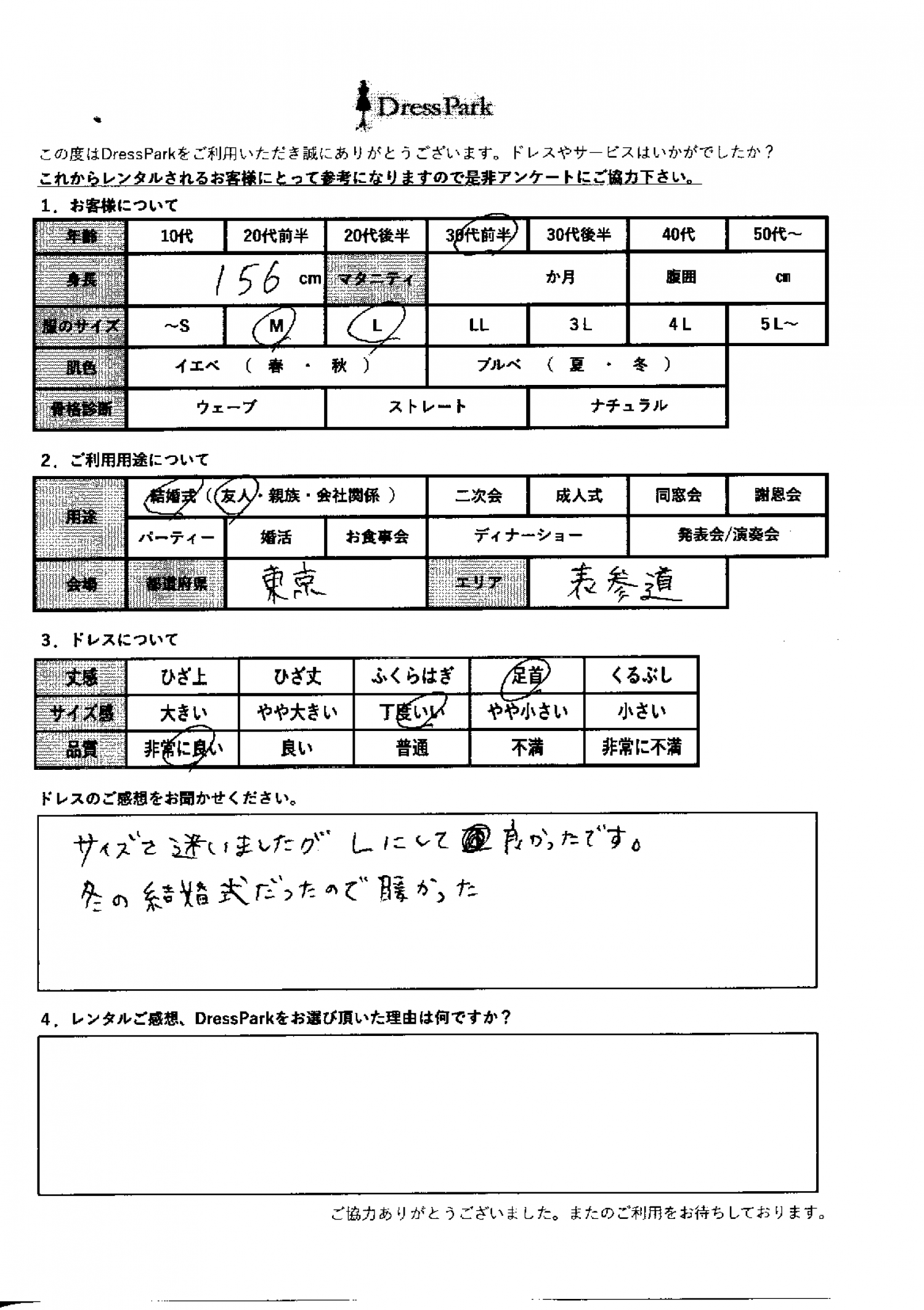 東京都 N.O様156㎝ Lサイズ青山・表参道 #30代#M/L#155~159㎝#結婚式(友人)#東京都#青山・表参道 ◆レンタルしたドレスはこちら ◆レンタルしたサイズは:L ◆レンタルした日付:2025/12/21 ドレスの着用感 ◆点数: (5点) ◆丈感:足首 ◆サイズ感:丁度いい ◆品質:非常に良い ドレスの感想 サイズで迷いましたが、Lサイズにしてよかったです。冬の結婚式だったので暖かかった。 CUSTOMER REVIEWS お客様の声 気になるカテゴリー別にご利用の感想をチェック! ◆AGE 年代で見る 10代 20代 30代 40代 50代~ ◆SIZE サイズで見る SS/S M/L 大きいサイズLL~ ◆HIGHT 身長で見る 140~149㎝ 150~154㎝ 155~159㎝ 160~164㎝ 165~169㎝ 170㎝以上 ◆マタニティ ~3か月 4~6か月 7~8か月 9~10か月 ◆肌色 イエベ ブルべ ◆骨格診断 ウェーブ ストレート ナチュラル ◆利用シーン 結婚式(友人) 結婚式(親族) 結婚式(会社関係) 二次会 成人式/同窓会 謝恩会 パーティー その他 CUSTOMER REVIEWS都道府県別お客様の声 都道府県別にのお客様の声をチェック! 北海道 青森県 岩手県 宮城県 秋田県 山形県 福島県 茨城県 栃木県 群馬県 埼玉県 千葉県 東京都 神奈川県 新潟県 富山県 石川県 福井県 山梨県 長野県 岐阜県 静岡県 愛知県 三重県 滋賀県 京都府 大阪府 兵庫県 奈良県 和歌山県 鳥取県 島根県 岡山県 広島県 山口県 徳島県 香川県 愛媛県 高知県 福岡県 佐賀県 長崎県 熊本県 大分県 宮崎県 鹿児島県 沖縄県 CUSTOMER REVIEWSエリア別お客様の声 都道府県別にのお客様の声をチェック! 札幌 仙台 名古屋 軽井沢 金沢 神戸・芦屋 博多 那覇 梅田・新大阪 難波・心斎橋 鎌倉・湘南 横浜・みなとみらい 舞浜・浦安・幕張 大宮・浦和 青山・表参道 六本木・麻布 渋谷・恵比寿 新宿 池袋 銀座・丸の内 お台場・汐留 鹿児島市 郡山市 福島市 東予 甲府・石和 LINEでお問い合わせ このサイトではJavaScriptを使用しています