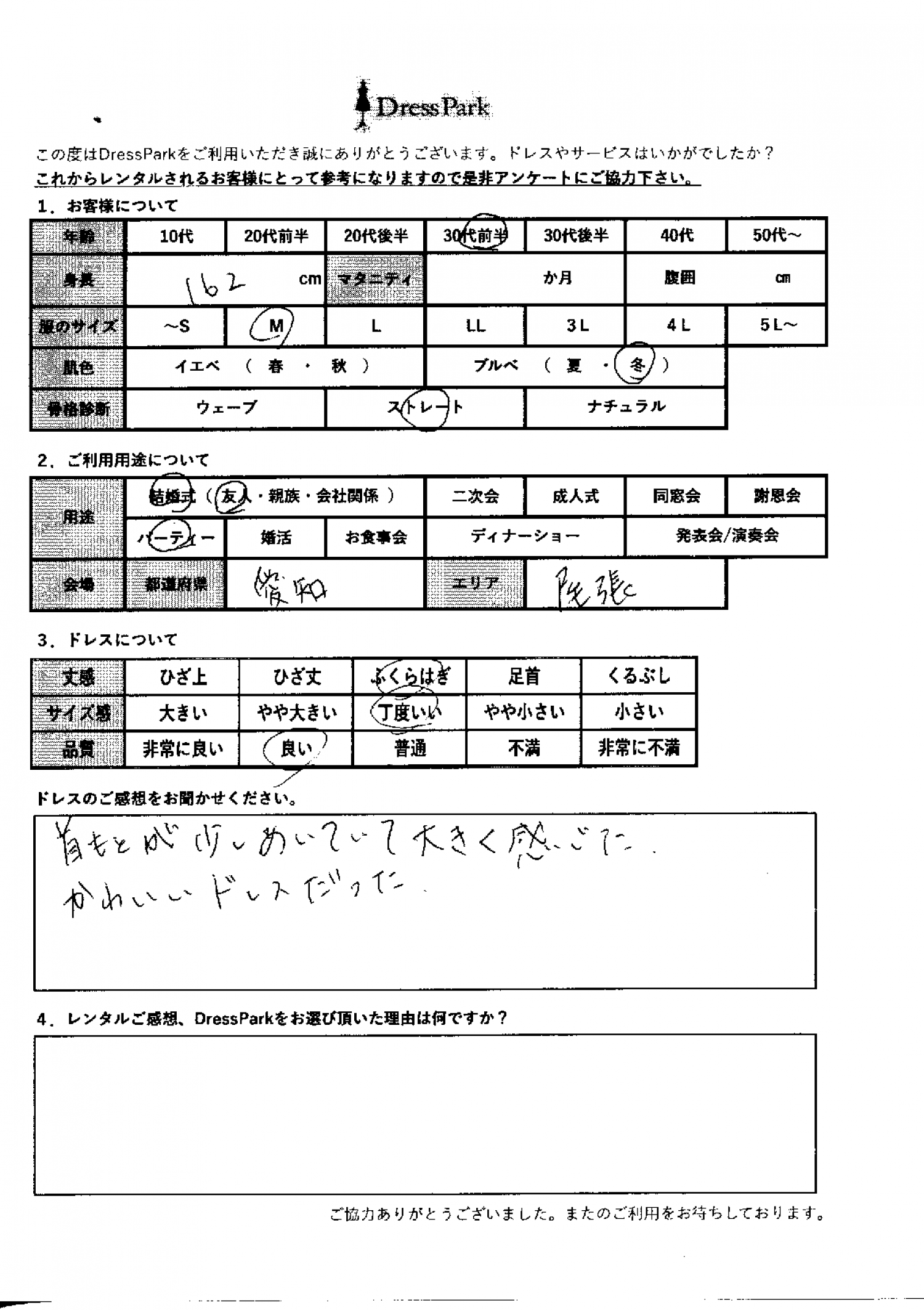 愛知県 A.S様162㎝ Mサイズ #30代#M/L#160~164㎝#結婚式(友人)#愛知県 ◆レンタルしたドレスはこちら ◆レンタルしたサイズは:M ◆レンタルした日付:2025/12/21 ドレスの着用感 ◆点数: (4点) ◆丈感:ふくらはぎ ◆サイズ感:丁度いい ◆品質:良い ◆肌色:ブルべ ◆骨格診断:ストレート ドレスの感想 首元が少し空いていて大きく感じた。かわいいドレスだった。 CUSTOMER REVIEWS お客様の声 気になるカテゴリー別にご利用の感想をチェック! ◆AGE 年代で見る 10代 20代 30代 40代 50代~ ◆SIZE サイズで見る SS/S M/L 大きいサイズLL~ ◆HIGHT 身長で見る 140~149㎝ 150~154㎝ 155~159㎝ 160~164㎝ 165~169㎝ 170㎝以上 ◆マタニティ ~3か月 4~6か月 7~8か月 9~10か月 ◆肌色 イエベ ブルべ ◆骨格診断 ウェーブ ストレート ナチュラル ◆利用シーン 結婚式(友人) 結婚式(親族) 結婚式(会社関係) 二次会 成人式/同窓会 謝恩会 パーティー その他 CUSTOMER REVIEWS都道府県別お客様の声 都道府県別にのお客様の声をチェック! 北海道 青森県 岩手県 宮城県 秋田県 山形県 福島県 茨城県 栃木県 群馬県 埼玉県 千葉県 東京都 神奈川県 新潟県 富山県 石川県 福井県 山梨県 長野県 岐阜県 静岡県 愛知県 三重県 滋賀県 京都府 大阪府 兵庫県 奈良県 和歌山県 鳥取県 島根県 岡山県 広島県 山口県 徳島県 香川県 愛媛県 高知県 福岡県 佐賀県 長崎県 熊本県 大分県 宮崎県 鹿児島県 沖縄県 CUSTOMER REVIEWSエリア別お客様の声 都道府県別にのお客様の声をチェック! 札幌 仙台 名古屋 軽井沢 金沢 神戸・芦屋 博多 那覇 梅田・新大阪 難波・心斎橋 鎌倉・湘南 横浜・みなとみらい 舞浜・浦安・幕張 大宮・浦和 青山・表参道 六本木・麻布 渋谷・恵比寿 新宿 池袋 銀座・丸の内 お台場・汐留 鹿児島市 郡山市 福島市 東予 甲府・石和 LINEでお問い合わせ このサイトではJavaScriptを使用しています