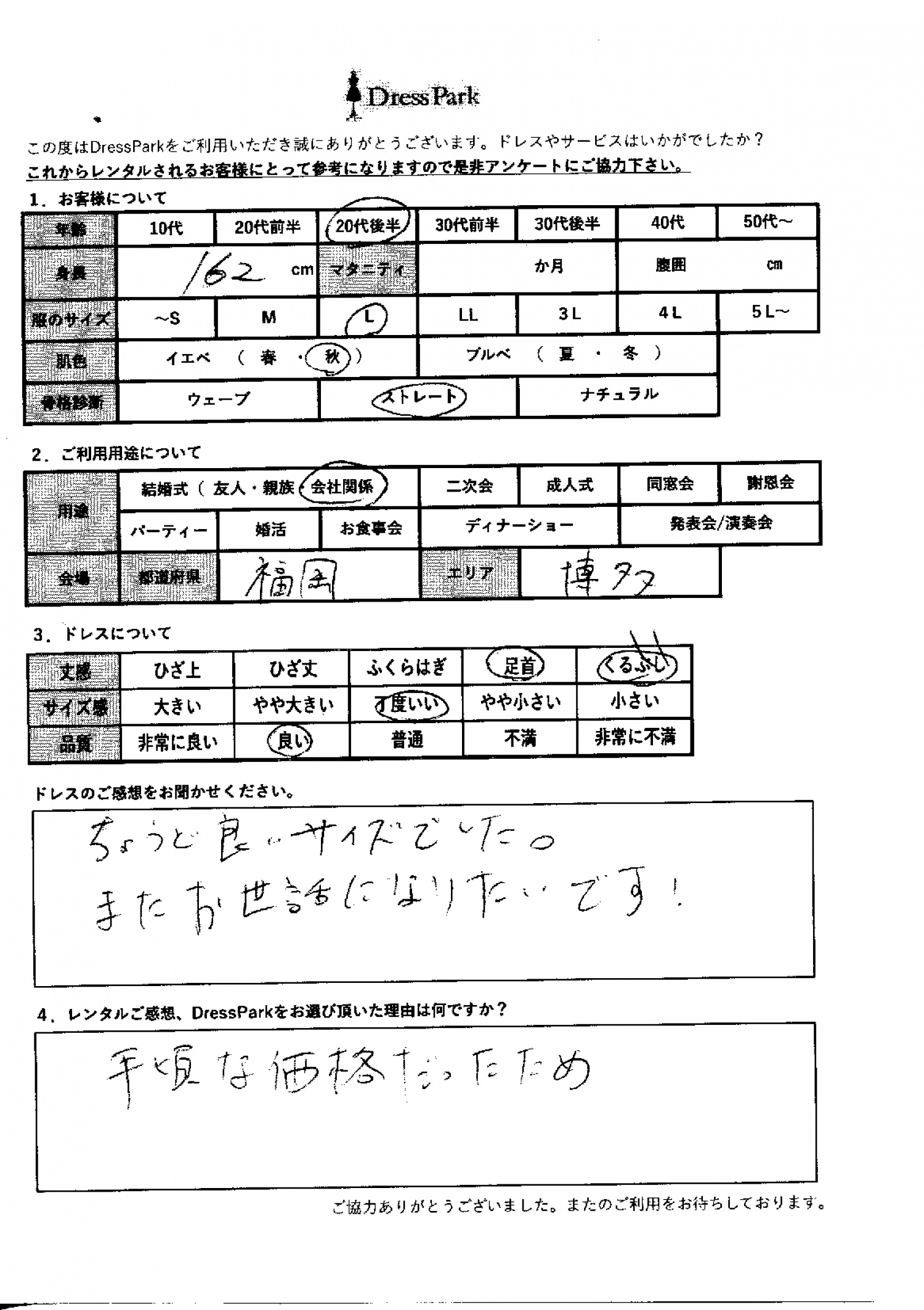 福岡県 R.S様162㎝ Lサイズ博多 #20代#M/L#160~164㎝#結婚式(会社関係)#福岡県#博多 ◆レンタルしたドレスはこちら ◆レンタルしたサイズは:L ◆レンタルした日付:2025/12/20 ドレスの着用感 ◆点数: (4点) ◆丈感:足首 ◆サイズ感:丁度いい ◆品質:良い ◆肌色:イエベ ◆骨格診断:ストレート ドレスの感想 ちょうど良いサイズでした。またお世話になりたいです! レンタルのご感想、DressParkをお選び頂いた理由 手ごろな価格だったため。 CUSTOMER REVIEWS お客様の声 気になるカテゴリー別にご利用の感想をチェック! ◆AGE 年代で見る 10代 20代 30代 40代 50代~ ◆SIZE サイズで見る SS/S M/L 大きいサイズLL~ ◆HIGHT 身長で見る 140~149㎝ 150~154㎝ 155~159㎝ 160~164㎝ 165~169㎝ 170㎝以上 ◆マタニティ ~3か月 4~6か月 7~8か月 9~10か月 ◆肌色 イエベ ブルべ ◆骨格診断 ウェーブ ストレート ナチュラル ◆利用シーン 結婚式(友人) 結婚式(親族) 結婚式(会社関係) 二次会 成人式/同窓会 謝恩会 パーティー その他 CUSTOMER REVIEWS都道府県別お客様の声 都道府県別にのお客様の声をチェック! 北海道 青森県 岩手県 宮城県 秋田県 山形県 福島県 茨城県 栃木県 群馬県 埼玉県 千葉県 東京都 神奈川県 新潟県 富山県 石川県 福井県 山梨県 長野県 岐阜県 静岡県 愛知県 三重県 滋賀県 京都府 大阪府 兵庫県 奈良県 和歌山県 鳥取県 島根県 岡山県 広島県 山口県 徳島県 香川県 愛媛県 高知県 福岡県 佐賀県 長崎県 熊本県 大分県 宮崎県 鹿児島県 沖縄県 CUSTOMER REVIEWSエリア別お客様の声 都道府県別にのお客様の声をチェック! 札幌 仙台 名古屋 軽井沢 金沢 神戸・芦屋 博多 那覇 梅田・新大阪 難波・心斎橋 鎌倉・湘南 横浜・みなとみらい 舞浜・浦安・幕張 大宮・浦和 青山・表参道 六本木・麻布 渋谷・恵比寿 新宿 池袋 銀座・丸の内 お台場・汐留 鹿児島市 郡山市 福島市 東予 甲府・石和 LINEでお問い合わせ このサイトではJavaScriptを使用しています