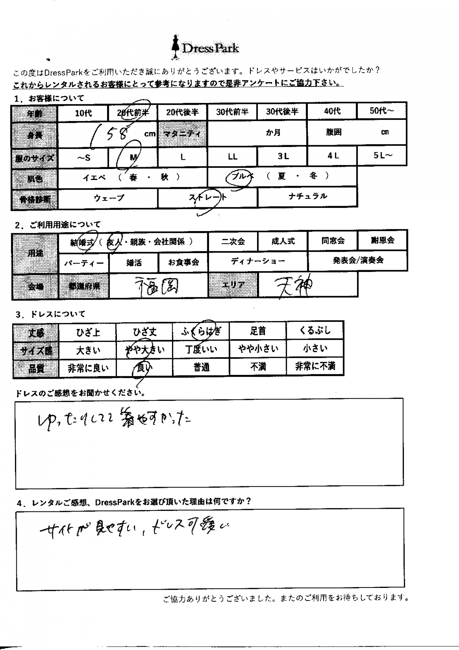 福岡県 A.H様158㎝ Mサイズ #20代#M/L#155~159㎝#結婚式(友人)#福岡県 ◆レンタルしたドレスはこちら ◆レンタルしたサイズは:M ◆レンタルした日付:2025/12/21 ドレスの着用感 ◆点数: (4点) ◆丈感:ふくらはぎ ◆サイズ感:やや大きい ◆品質:良い ◆肌色:ブルべ ◆骨格診断:ストレート ドレスの感想 ゆったりしてて着やすかった。 レンタルのご感想、DressParkをお選び頂いた理由 サイトが見やすい、ドレスかわいい。 CUSTOMER REVIEWS お客様の声 気になるカテゴリー別にご利用の感想をチェック! ◆AGE 年代で見る 10代 20代 30代 40代 50代~ ◆SIZE サイズで見る SS/S M/L 大きいサイズLL~ ◆HIGHT 身長で見る 140~149㎝ 150~154㎝ 155~159㎝ 160~164㎝ 165~169㎝ 170㎝以上 ◆マタニティ ~3か月 4~6か月 7~8か月 9~10か月 ◆肌色 イエベ ブルべ ◆骨格診断 ウェーブ ストレート ナチュラル ◆利用シーン 結婚式(友人) 結婚式(親族) 結婚式(会社関係) 二次会 成人式/同窓会 謝恩会 パーティー その他 CUSTOMER REVIEWS都道府県別お客様の声 都道府県別にのお客様の声をチェック! 北海道 青森県 岩手県 宮城県 秋田県 山形県 福島県 茨城県 栃木県 群馬県 埼玉県 千葉県 東京都 神奈川県 新潟県 富山県 石川県 福井県 山梨県 長野県 岐阜県 静岡県 愛知県 三重県 滋賀県 京都府 大阪府 兵庫県 奈良県 和歌山県 鳥取県 島根県 岡山県 広島県 山口県 徳島県 香川県 愛媛県 高知県 福岡県 佐賀県 長崎県 熊本県 大分県 宮崎県 鹿児島県 沖縄県 CUSTOMER REVIEWSエリア別お客様の声 都道府県別にのお客様の声をチェック! 札幌 仙台 名古屋 軽井沢 金沢 神戸・芦屋 博多 那覇 梅田・新大阪 難波・心斎橋 鎌倉・湘南 横浜・みなとみらい 舞浜・浦安・幕張 大宮・浦和 青山・表参道 六本木・麻布 渋谷・恵比寿 新宿 池袋 銀座・丸の内 お台場・汐留 鹿児島市 郡山市 福島市 東予 甲府・石和 LINEでお問い合わせ このサイトではJavaScriptを使用しています