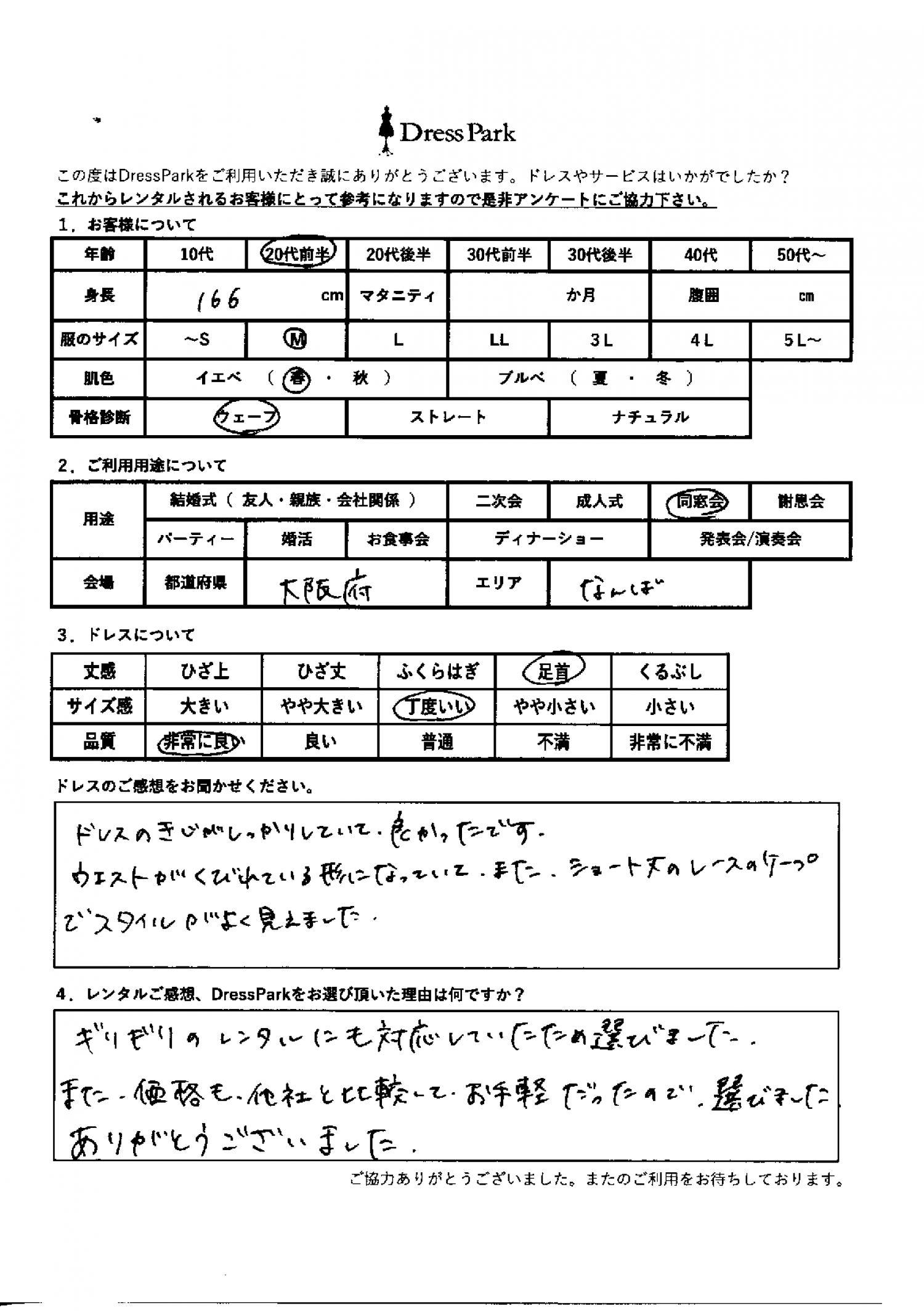 ドレスの生地がしっかりしていてよかったです。ウェストがくびれている形になっていて、また、ショート丈のレースのケープでスタイルがよく見えました。レンタルのご感想、