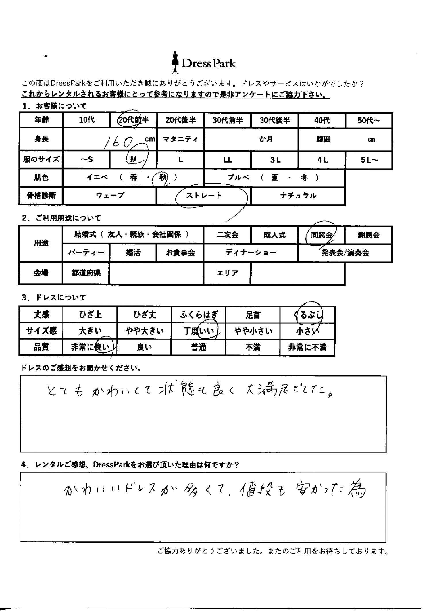 鳥取県 M.N様160㎝ Mサイズ #20代#M/L#160~164㎝#成人式/同窓会#鳥取県 ◆レンタルしたドレスはこちら ◆レンタルしたサイズは:M ◆レンタルした日付:2026/01/03 ドレスの着用感 ◆点数: (5点) ◆丈感:くるぶし ◆サイズ感:丁度いい ◆品質:非常に良い ◆肌色:イエベ ◆骨格診断:ストレート ドレスの感想 とても可愛くて状態も良く大満足でした。 レンタルのご感想、DressParkをお選び頂いた理由 可愛いドレスが多くて値段も安かったため。 CUSTOMER REVIEWS お客様の声 気になるカテゴリー別にご利用の感想をチェック! ◆AGE 年代で見る 10代 20代 30代 40代 50代~ ◆SIZE サイズで見る SS/S M/L 大きいサイズLL~ ◆HIGHT 身長で見る 140~149㎝ 150~154㎝ 155~159㎝ 160~164㎝ 165~169㎝ 170㎝以上 ◆マタニティ ~3か月 4~6か月 7~8か月 9~10か月 ◆肌色 イエベ ブルべ ◆骨格診断 ウェーブ ストレート ナチュラル ◆利用シーン 結婚式(友人) 結婚式(親族) 結婚式(会社関係) 二次会 成人式/同窓会 謝恩会 パーティー その他 CUSTOMER REVIEWS都道府県別お客様の声 都道府県別にのお客様の声をチェック! 北海道 青森県 岩手県 宮城県 秋田県 山形県 福島県 茨城県 栃木県 群馬県 埼玉県 千葉県 東京都 神奈川県 新潟県 富山県 石川県 福井県 山梨県 長野県 岐阜県 静岡県 愛知県 三重県 滋賀県 京都府 大阪府 兵庫県 奈良県 和歌山県 鳥取県 島根県 岡山県 広島県 山口県 徳島県 香川県 愛媛県 高知県 福岡県 佐賀県 長崎県 熊本県 大分県 宮崎県 鹿児島県 沖縄県 CUSTOMER REVIEWSエリア別お客様の声 都道府県別にのお客様の声をチェック! 札幌 仙台 名古屋 軽井沢 金沢 神戸・芦屋 博多 那覇 梅田・新大阪 難波・心斎橋 鎌倉・湘南 横浜・みなとみらい 舞浜・浦安・幕張 大宮・浦和 青山・表参道 六本木・麻布 渋谷・恵比寿 新宿 池袋 銀座・丸の内 お台場・汐留 鹿児島市 郡山市 福島市 東予 甲府・石和 LINEでお問い合わせ このサイトではJavaScriptを使用しています
