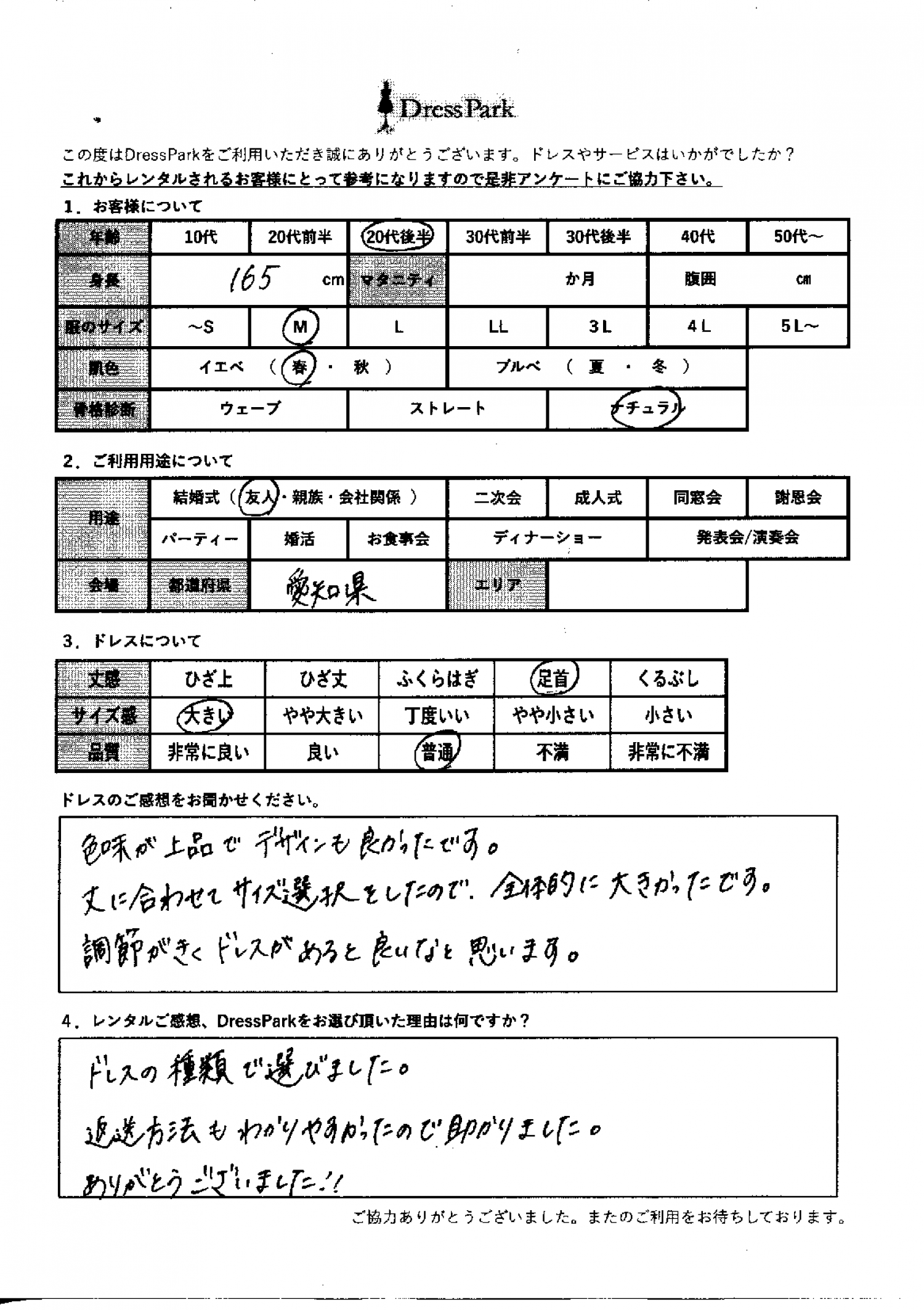 愛知県 M.O様165㎝ Mサイズ #20代#M/L#165~169㎝#結婚式(友人)#愛知県 ◆レンタルしたドレスはこちら ◆レンタルしたサイズは:L ◆レンタルした日付:2025/12/20 ドレスの着用感 ◆点数: (4点) ◆丈感:足首 ◆サイズ感:大きい ◆品質:普通 ◆肌色:イエベ ◆骨格診断:ナチュラル ドレスの感想 色味が上品でデザインもよかったです。丈に合わせてサイズ選択をしたので、全体的に大きかったです。調節が効くドレスがあると良いなと思います。 レンタルのご感想、DressParkをお選び頂いた理由 ドレスの種類で選びました。返送方法も分かりやすかったので、助かりました。ありがとうございました! CUSTOMER REVIEWS お客様の声 気になるカテゴリー別にご利用の感想をチェック! ◆AGE 年代で見る 10代 20代 30代 40代 50代~ ◆SIZE サイズで見る SS/S M/L 大きいサイズLL~ ◆HIGHT 身長で見る 140~149㎝ 150~154㎝ 155~159㎝ 160~164㎝ 165~169㎝ 170㎝以上 ◆マタニティ ~3か月 4~6か月 7~8か月 9~10か月 ◆肌色 イエベ ブルべ ◆骨格診断 ウェーブ ストレート ナチュラル ◆利用シーン 結婚式(友人) 結婚式(親族) 結婚式(会社関係) 二次会 成人式 謝恩会 パーティー その他 CUSTOMER REVIEWS都道府県別お客様の声 都道府県別にのお客様の声をチェック! 北海道 青森県 岩手県 宮城県 秋田県 山形県 福島県 茨城県 栃木県 群馬県 埼玉県 千葉県 東京都 神奈川県 新潟県 富山県 石川県 福井県 山梨県 長野県 岐阜県 静岡県 愛知県 三重県 滋賀県 京都府 大阪府 兵庫県 奈良県 和歌山県 鳥取県 島根県 岡山県 広島県 山口県 徳島県 香川県 愛媛県 高知県 福岡県 佐賀県 長崎県 熊本県 大分県 宮崎県 鹿児島県 沖縄県 CUSTOMER REVIEWSエリア別お客様の声 都道府県別にのお客様の声をチェック! 札幌 仙台 名古屋 軽井沢 金沢 神戸・芦屋 博多 那覇 梅田・新大阪 難波・心斎橋 鎌倉・湘南 横浜・みなとみらい 舞浜・浦安・幕張 大宮・浦和 青山・表参道 六本木・麻布 渋谷・恵比寿 新宿 池袋 銀座・丸の内 お台場・汐留 鹿児島市 郡山市 福島市 東予 甲府・石和 LINEでお問い合わせ このサイトではJavaScriptを使用しています