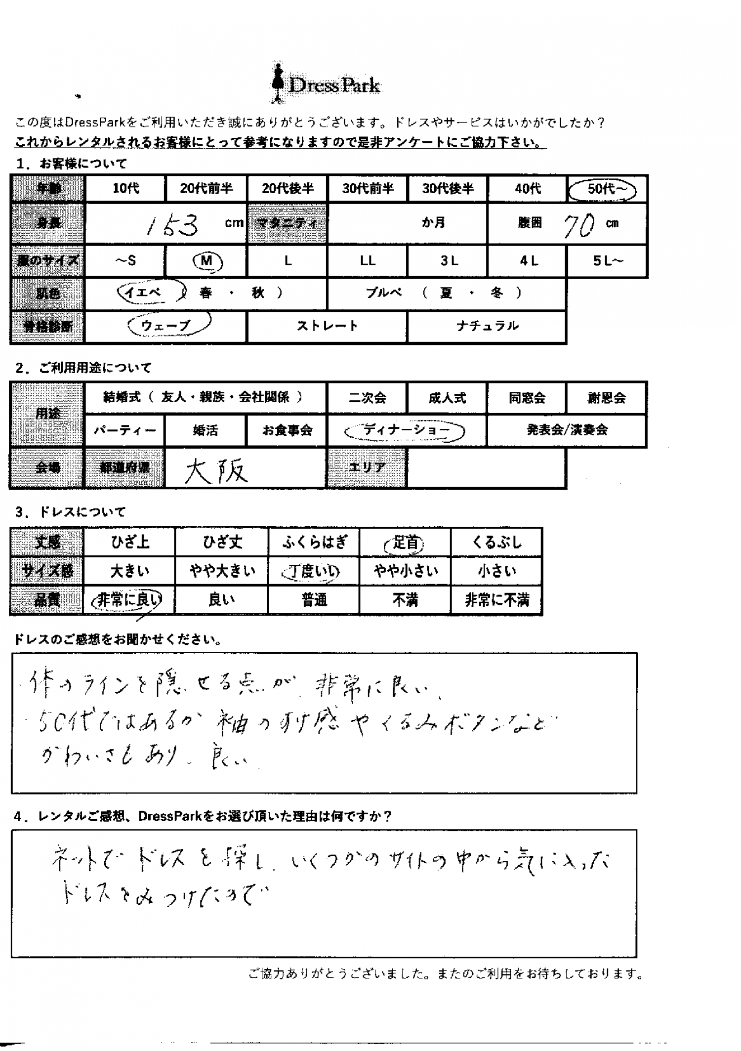 大阪府 A.T様153㎝ Mサイズ #50代~#M/L#150~154㎝#その他#大阪府 ◆レンタルしたドレスはこちら ◆レンタルしたサイズは:M ◆レンタルした日付:2025/12/23 ドレスの着用感 ◆点数: (5点) ◆丈感:足首 ◆サイズ感:丁度いい ◆品質:非常に良い ◆肌色:イエベ ◆骨格診断:ウェーブ ドレスの感想 体のラインを隠せる点が非常に良い。50代ではあるが、袖の透け感やくるみボタンなど可愛さもあり良い。 レンタルのご感想、DressParkをお選び頂いた理由 ネットでドレスを探し、いくつかのサイトの中から気に入ったドレスを見つけたので。 CUSTOMER REVIEWS お客様の声 気になるカテゴリー別にご利用の感想をチェック! ◆AGE 年代で見る 10代 20代 30代 40代 50代~ ◆SIZE サイズで見る SS/S M/L 大きいサイズLL~ ◆HIGHT 身長で見る 140~149㎝ 150~154㎝ 155~159㎝ 160~164㎝ 165~169㎝ 170㎝以上 ◆マタニティ ~3か月 4~6か月 7~8か月 9~10か月 ◆肌色 イエベ ブルべ ◆骨格診断 ウェーブ ストレート ナチュラル ◆利用シーン 結婚式(友人) 結婚式(親族) 結婚式(会社関係) 二次会 成人式 謝恩会 パーティー その他 CUSTOMER REVIEWS都道府県別お客様の声 都道府県別にのお客様の声をチェック! 北海道 青森県 岩手県 宮城県 秋田県 山形県 福島県 茨城県 栃木県 群馬県 埼玉県 千葉県 東京都 神奈川県 新潟県 富山県 石川県 福井県 山梨県 長野県 岐阜県 静岡県 愛知県 三重県 滋賀県 京都府 大阪府 兵庫県 奈良県 和歌山県 鳥取県 島根県 岡山県 広島県 山口県 徳島県 香川県 愛媛県 高知県 福岡県 佐賀県 長崎県 熊本県 大分県 宮崎県 鹿児島県 沖縄県 CUSTOMER REVIEWSエリア別お客様の声 都道府県別にのお客様の声をチェック! 札幌 仙台 名古屋 軽井沢 金沢 神戸・芦屋 博多 那覇 梅田・新大阪 難波・心斎橋 鎌倉・湘南 横浜・みなとみらい 舞浜・浦安・幕張 大宮・浦和 青山・表参道 六本木・麻布 渋谷・恵比寿 新宿 池袋 銀座・丸の内 お台場・汐留 鹿児島市 郡山市 福島市 東予 甲府・石和 LINEでお問い合わせ このサイトではJavaScriptを使用しています