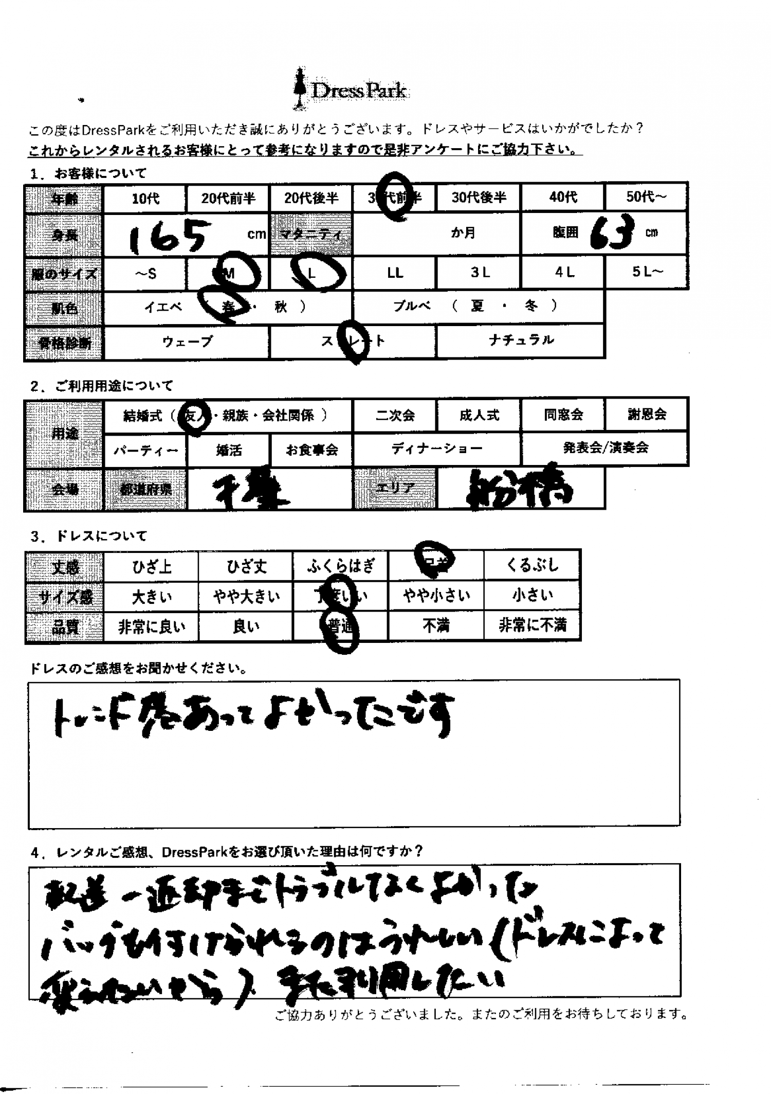 千葉県 Y.K様165㎝ Mサイズ #30代#M/L#165~169㎝#結婚式(友人)#千葉県 ◆レンタルしたドレスはこちら ◆レンタルしたサイズは:M ◆レンタルした日付:2025/12/27 ドレスの着用感 ◆点数: (4点) ◆丈感:足首 ◆サイズ感:丁度いい ◆品質:普通 ◆肌色:イエベ ◆骨格診断:ストレート ドレスの感想 トレンド感があってよかったです。 レンタルのご感想、DressParkをお選び頂いた理由 配送から返却までトラブルなくよかった。バッグもつけられるのは嬉しい。(ドレスによって変えたいから)また利用したい。 CUSTOMER REVIEWS お客様の声 気になるカテゴリー別にご利用の感想をチェック! ◆AGE 年代で見る 10代 20代 30代 40代 50代~ ◆SIZE サイズで見る SS/S M/L 大きいサイズLL~ ◆HIGHT 身長で見る 140~149㎝ 150~154㎝ 155~159㎝ 160~164㎝ 165~169㎝ 170㎝以上 ◆マタニティ ~3か月 4~6か月 7~8か月 9~10か月 ◆肌色 イエベ ブルべ ◆骨格診断 ウェーブ ストレート ナチュラル ◆利用シーン 結婚式(友人) 結婚式(親族) 結婚式(会社関係) 二次会 成人式/同窓会 謝恩会 パーティー その他 CUSTOMER REVIEWS都道府県別お客様の声 都道府県別にのお客様の声をチェック! 北海道 青森県 岩手県 宮城県 秋田県 山形県 福島県 茨城県 栃木県 群馬県 埼玉県 千葉県 東京都 神奈川県 新潟県 富山県 石川県 福井県 山梨県 長野県 岐阜県 静岡県 愛知県 三重県 滋賀県 京都府 大阪府 兵庫県 奈良県 和歌山県 鳥取県 島根県 岡山県 広島県 山口県 徳島県 香川県 愛媛県 高知県 福岡県 佐賀県 長崎県 熊本県 大分県 宮崎県 鹿児島県 沖縄県 CUSTOMER REVIEWSエリア別お客様の声 都道府県別にのお客様の声をチェック! 札幌 仙台 名古屋 軽井沢 金沢 神戸・芦屋 博多 那覇 梅田・新大阪 難波・心斎橋 鎌倉・湘南 横浜・みなとみらい 舞浜・浦安・幕張 大宮・浦和 青山・表参道 六本木・麻布 渋谷・恵比寿 新宿 池袋 銀座・丸の内 お台場・汐留 鹿児島市 郡山市 福島市 東予 甲府・石和 LINEでお問い合わせ このサイトではJavaScriptを使用しています