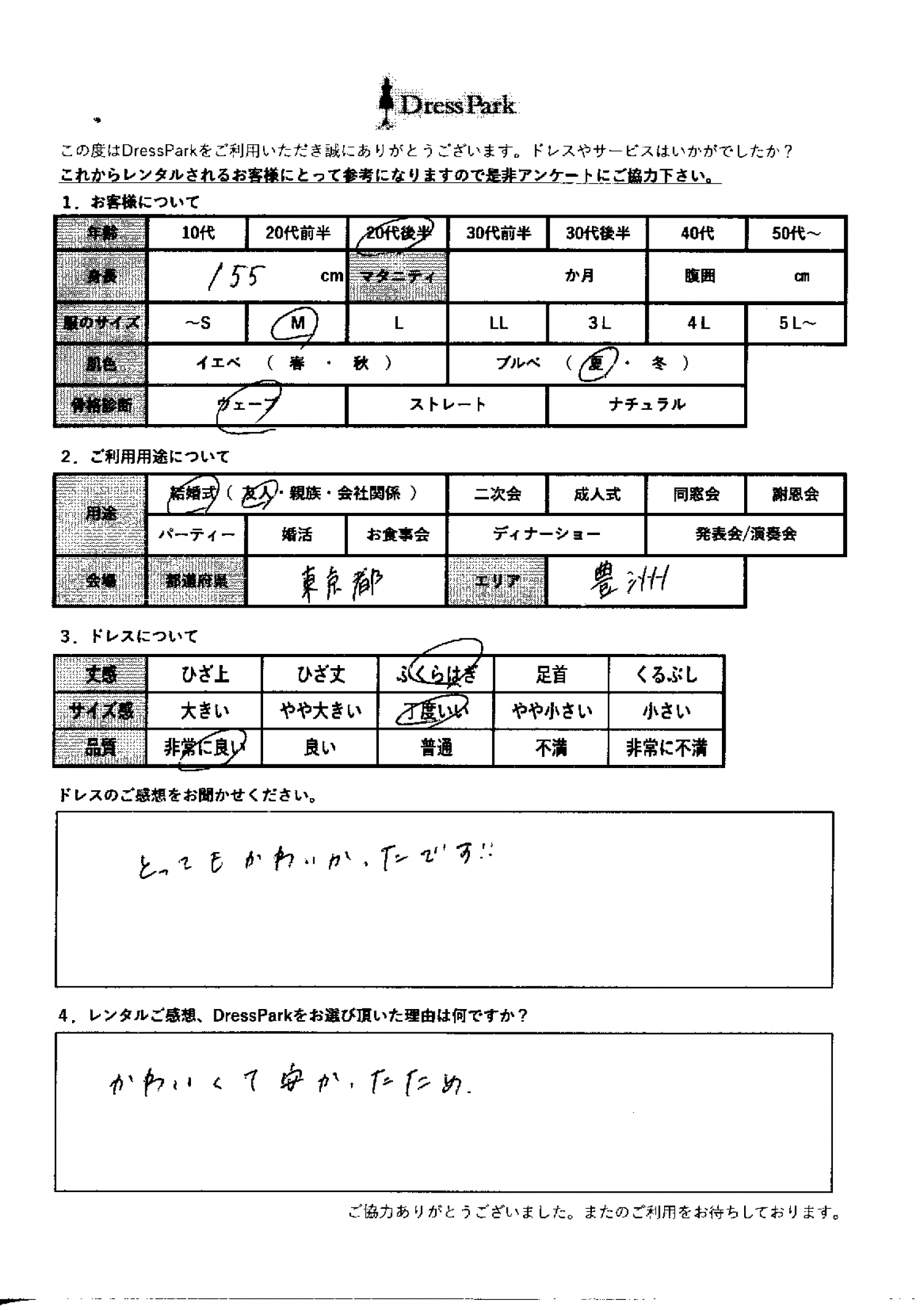 東京都 K.N様155㎝ Mサイズ #20代#M/L#155~159㎝#結婚式(友人)#東京都 ◆レンタルしたドレスはこちら ◆レンタルしたサイズは:M ◆レンタルした日付:2025/12/26 ドレスの着用感 ◆点数: (5点) ◆丈感:ふくらはぎ ◆サイズ感:丁度いい ◆品質:非常に良い ◆肌色:ブルべ ◆骨格診断:ウェーブ ドレスの感想 とっても可愛かったです! レンタルのご感想、DressParkをお選び頂いた理由 可愛くて安かったため。 CUSTOMER REVIEWS お客様の声 気になるカテゴリー別にご利用の感想をチェック! ◆AGE 年代で見る 10代 20代 30代 40代 50代~ ◆SIZE サイズで見る SS/S M/L 大きいサイズLL~ ◆HIGHT 身長で見る 140~149㎝ 150~154㎝ 155~159㎝ 160~164㎝ 165~169㎝ 170㎝以上 ◆マタニティ ~3か月 4~6か月 7~8か月 9~10か月 ◆肌色 イエベ ブルべ ◆骨格診断 ウェーブ ストレート ナチュラル ◆利用シーン 結婚式(友人) 結婚式(親族) 結婚式(会社関係) 二次会 成人式/同窓会 謝恩会 パーティー その他 CUSTOMER REVIEWS都道府県別お客様の声 都道府県別にのお客様の声をチェック! 北海道 青森県 岩手県 宮城県 秋田県 山形県 福島県 茨城県 栃木県 群馬県 埼玉県 千葉県 東京都 神奈川県 新潟県 富山県 石川県 福井県 山梨県 長野県 岐阜県 静岡県 愛知県 三重県 滋賀県 京都府 大阪府 兵庫県 奈良県 和歌山県 鳥取県 島根県 岡山県 広島県 山口県 徳島県 香川県 愛媛県 高知県 福岡県 佐賀県 長崎県 熊本県 大分県 宮崎県 鹿児島県 沖縄県 CUSTOMER REVIEWSエリア別お客様の声 都道府県別にのお客様の声をチェック! 札幌 仙台 名古屋 軽井沢 金沢 神戸・芦屋 博多 那覇 梅田・新大阪 難波・心斎橋 鎌倉・湘南 横浜・みなとみらい 舞浜・浦安・幕張 大宮・浦和 青山・表参道 六本木・麻布 渋谷・恵比寿 新宿 池袋 銀座・丸の内 お台場・汐留 鹿児島市 郡山市 福島市 東予 甲府・石和 LINEでお問い合わせ このサイトではJavaScriptを使用しています