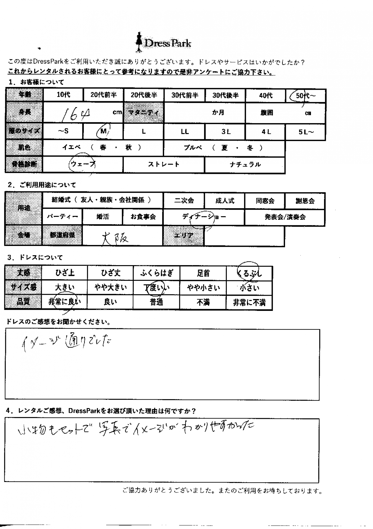 大阪府 T.N様164㎝ Mサイズ #50代~#M/L#160~164㎝#その他#大阪府 ◆レンタルしたドレスはこちら ◆レンタルしたサイズは:M ◆レンタルした日付:2025/12/24 ドレスの着用感 ◆点数: (5点) ◆丈感:くるぶし ◆サイズ感:丁度いい ◆品質:非常に良い ◆骨格診断:ウェーブ ドレスの感想 イメージ通りでした。 レンタルのご感想、DressParkをお選び頂いた理由 小物もセットで写真でイメージが分かりやすかった。 CUSTOMER REVIEWS お客様の声 気になるカテゴリー別にご利用の感想をチェック! ◆AGE 年代で見る 10代 20代 30代 40代 50代~ ◆SIZE サイズで見る SS/S M/L 大きいサイズLL~ ◆HIGHT 身長で見る 140~149㎝ 150~154㎝ 155~159㎝ 160~164㎝ 165~169㎝ 170㎝以上 ◆マタニティ ~3か月 4~6か月 7~8か月 9~10か月 ◆肌色 イエベ ブルべ ◆骨格診断 ウェーブ ストレート ナチュラル ◆利用シーン 結婚式(友人) 結婚式(親族) 結婚式(会社関係) 二次会 成人式/同窓会 謝恩会 パーティー その他 CUSTOMER REVIEWS都道府県別お客様の声 都道府県別にのお客様の声をチェック! 北海道 青森県 岩手県 宮城県 秋田県 山形県 福島県 茨城県 栃木県 群馬県 埼玉県 千葉県 東京都 神奈川県 新潟県 富山県 石川県 福井県 山梨県 長野県 岐阜県 静岡県 愛知県 三重県 滋賀県 京都府 大阪府 兵庫県 奈良県 和歌山県 鳥取県 島根県 岡山県 広島県 山口県 徳島県 香川県 愛媛県 高知県 福岡県 佐賀県 長崎県 熊本県 大分県 宮崎県 鹿児島県 沖縄県 CUSTOMER REVIEWSエリア別お客様の声 都道府県別にのお客様の声をチェック! 札幌 仙台 名古屋 軽井沢 金沢 神戸・芦屋 博多 那覇 梅田・新大阪 難波・心斎橋 鎌倉・湘南 横浜・みなとみらい 舞浜・浦安・幕張 大宮・浦和 青山・表参道 六本木・麻布 渋谷・恵比寿 新宿 池袋 銀座・丸の内 お台場・汐留 鹿児島市 郡山市 福島市 東予 甲府・石和 LINEでお問い合わせ このサイトではJavaScriptを使用しています