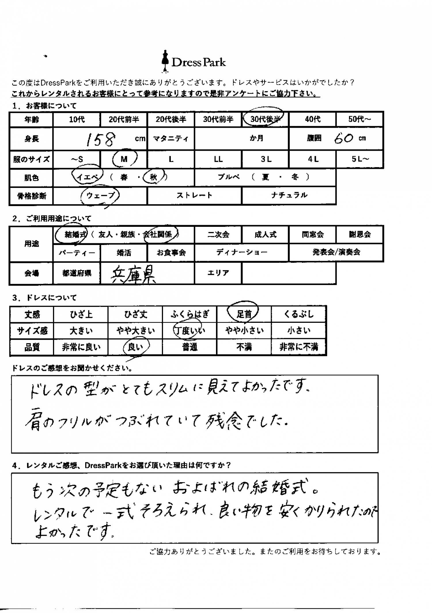 ドレスの型がとてもスリムに見えてよかったです。肩のフリルが潰れていて残念でした。【スタッフより】