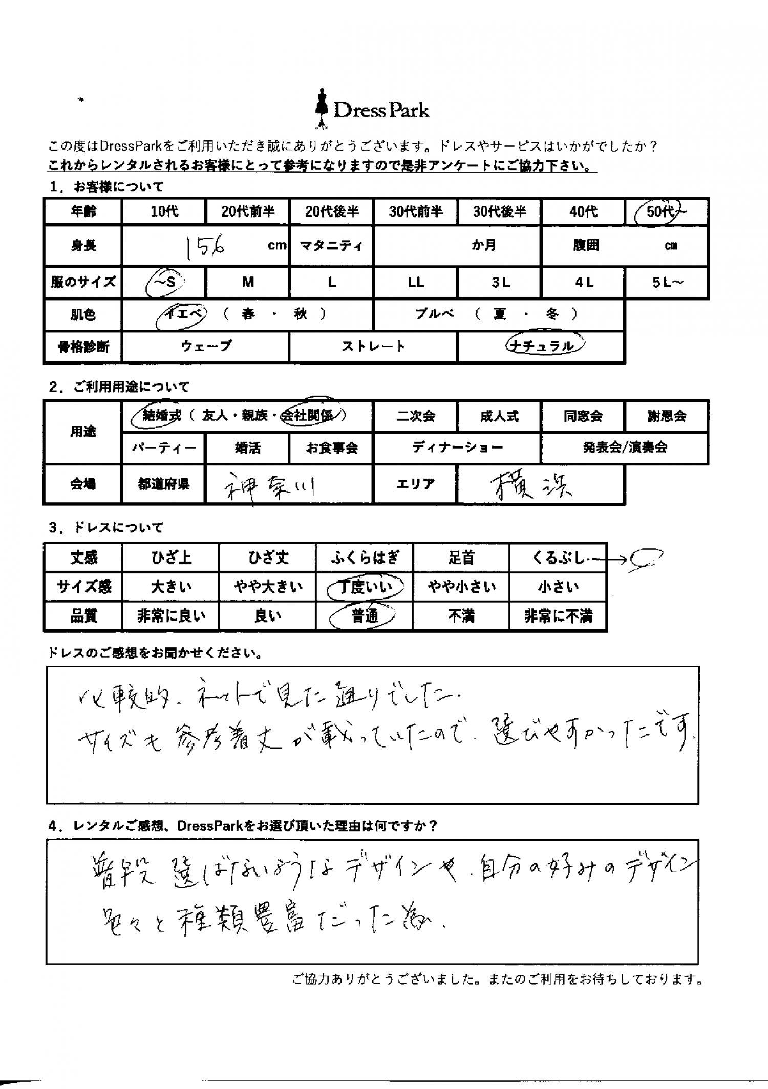 神奈川県 Y.H様156㎝ ~Sサイズ横浜・みなとみらい #50代~#SS/S#155~159㎝#結婚式(会社関係)#神奈川県#横浜・みなとみらい ◆レンタルしたドレスはこちら ◆レンタルしたサイズは:S ◆レンタルした日付:2025/12/28 ドレスの着用感 ◆点数: (4点) ◆丈感:くるぶし ◆サイズ感:丁度いい ◆品質:普通 ◆肌色:イエベ ◆骨格診断:ナチュラル ドレスの感想 比較的ネットで見た通りでした。サイズも参考着丈が載っていたので選びやすかったです。 レンタルのご感想、DressParkをお選び頂いた理由 普段選ばないようなデザインや自分の好みのデザイン、色々と種類豊富だったため CUSTOMER REVIEWS お客様の声 気になるカテゴリー別にご利用の感想をチェック! ◆AGE 年代で見る 10代 20代 30代 40代 50代~ ◆SIZE サイズで見る SS/S M/L 大きいサイズLL~ ◆HIGHT 身長で見る 140~149㎝ 150~154㎝ 155~159㎝ 160~164㎝ 165~169㎝ 170㎝以上 ◆マタニティ ~3か月 4~6か月 7~8か月 9~10か月 ◆肌色 イエベ ブルべ ◆骨格診断 ウェーブ ストレート ナチュラル ◆利用シーン 結婚式(友人) 結婚式(親族) 結婚式(会社関係) 二次会 成人式 謝恩会 パーティー その他 CUSTOMER REVIEWS都道府県別お客様の声 都道府県別にのお客様の声をチェック! 北海道 青森県 岩手県 宮城県 秋田県 山形県 福島県 茨城県 栃木県 群馬県 埼玉県 千葉県 東京都 神奈川県 新潟県 富山県 石川県 福井県 山梨県 長野県 岐阜県 静岡県 愛知県 三重県 滋賀県 京都府 大阪府 兵庫県 奈良県 和歌山県 鳥取県 島根県 岡山県 広島県 山口県 徳島県 香川県 愛媛県 高知県 福岡県 佐賀県 長崎県 熊本県 大分県 宮崎県 鹿児島県 沖縄県 CUSTOMER REVIEWSエリア別お客様の声 都道府県別にのお客様の声をチェック! 札幌 仙台 名古屋 軽井沢 金沢 神戸・芦屋 博多 那覇 梅田・新大阪 難波・心斎橋 鎌倉・湘南 横浜・みなとみらい 舞浜・浦安・幕張 大宮・浦和 青山・表参道 六本木・麻布 渋谷・恵比寿 新宿 池袋 銀座・丸の内 お台場・汐留 鹿児島市 郡山市 福島市 東予 甲府・石和 LINEでお問い合わせ このサイトではJavaScriptを使用しています